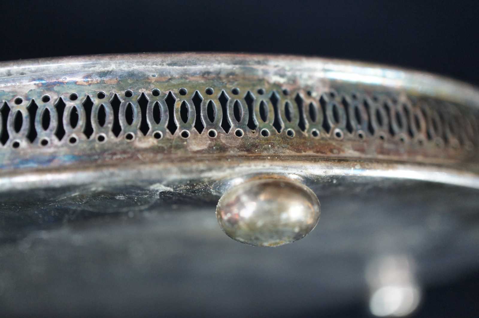 Antique Gorham silver plated tray featuring oval form with pierced / reticulated gallery and footed base. Y1080.