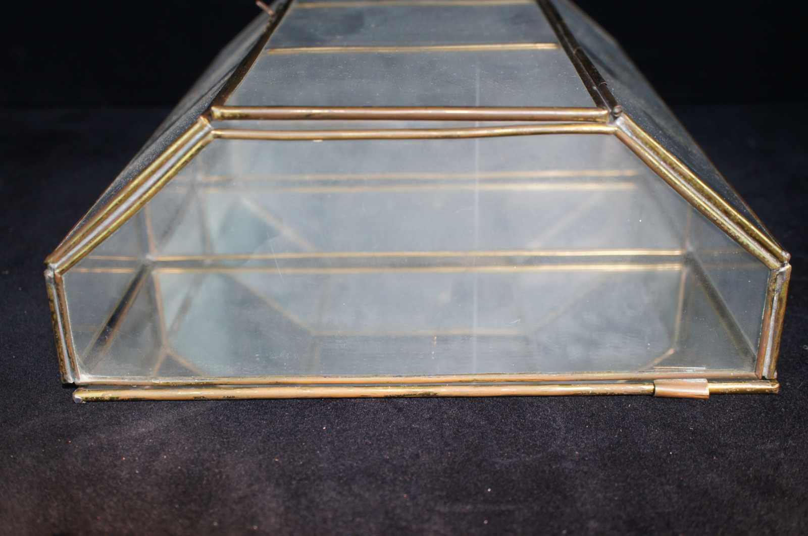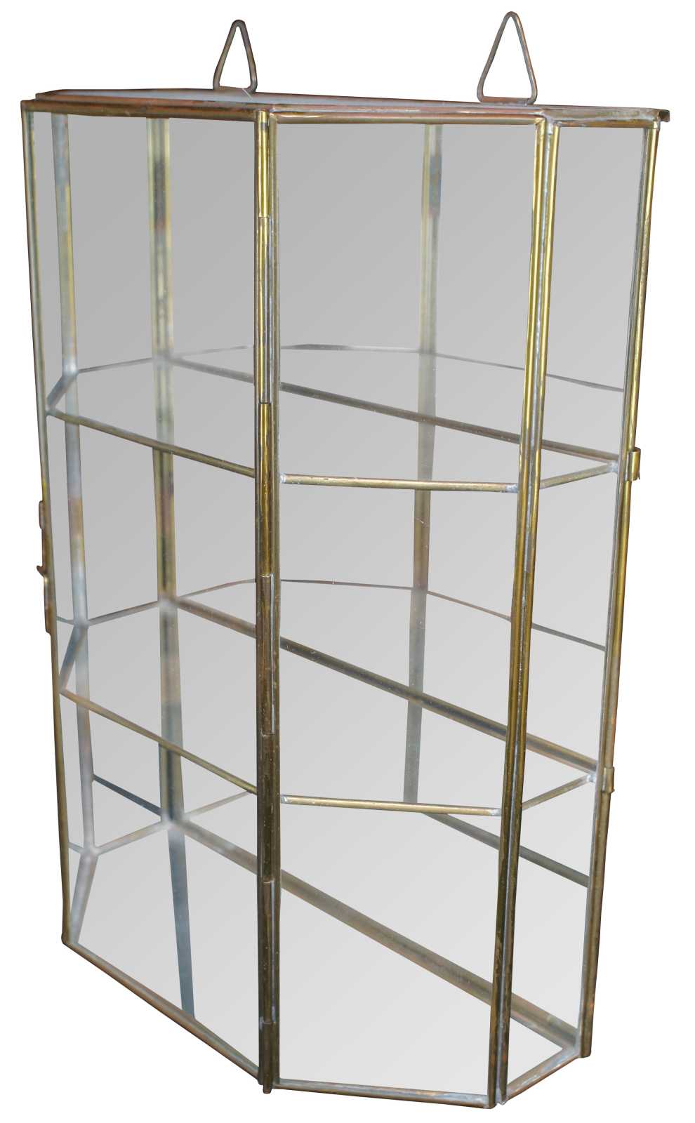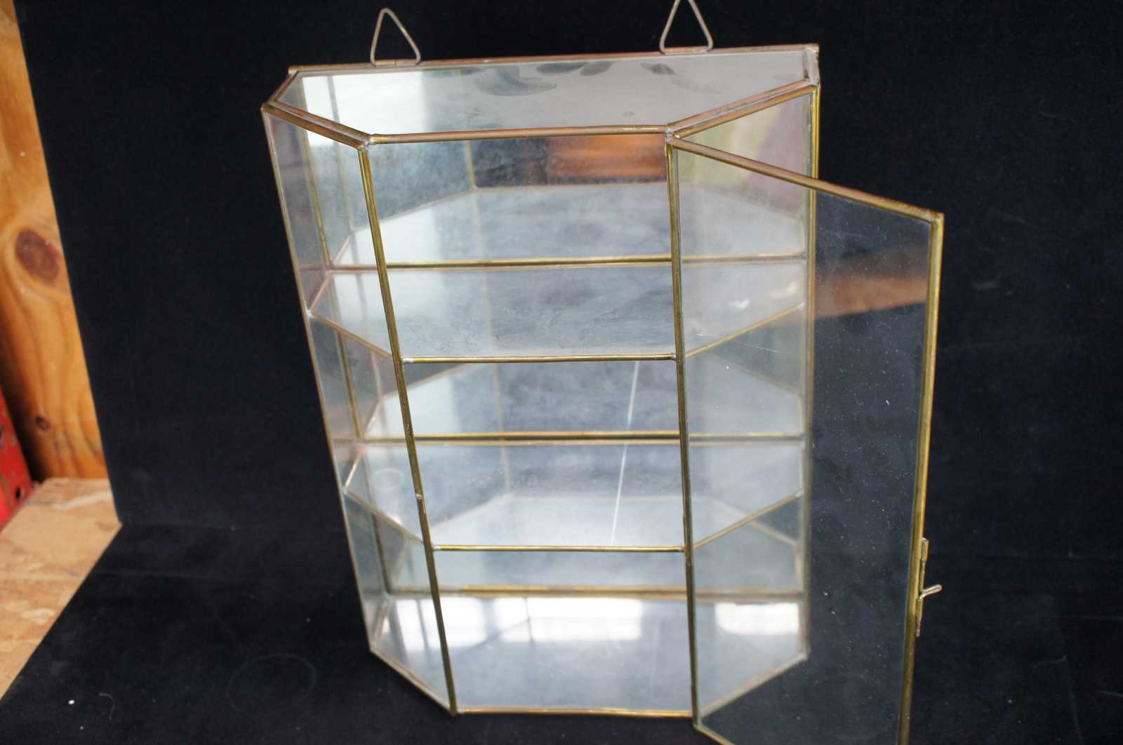 Vintage brass and glass wall hanging curio cabinet or display case featuring mirrored back and three tiers for storing curiosities.