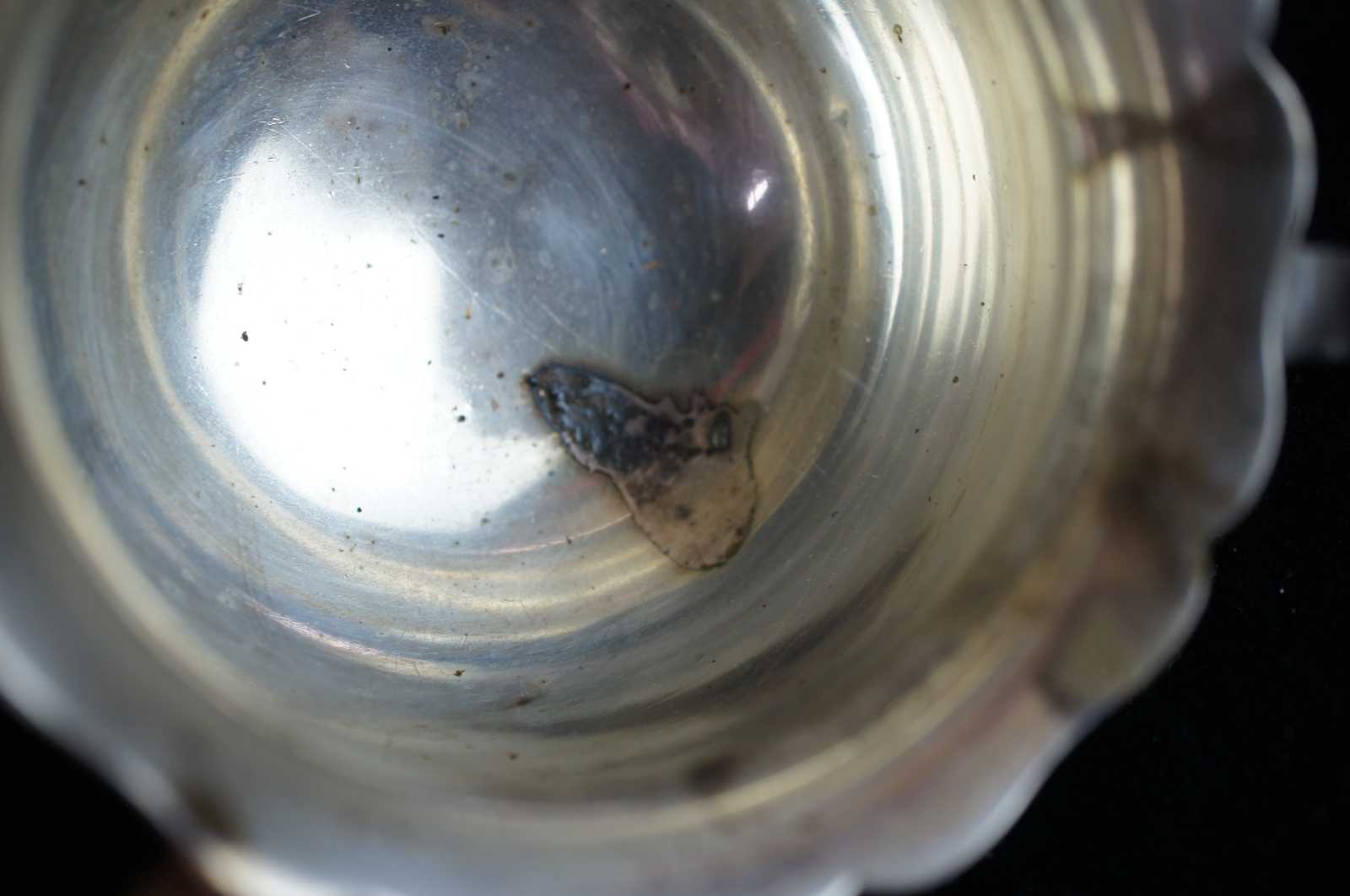 Vintage J Wagner & Son sterling silver creamer and sugar featuring ornate handles and scalloped rim. Marked 155 on bottom.