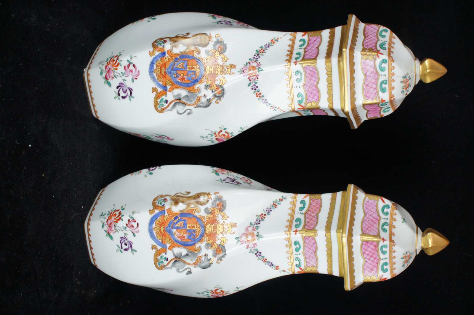 Pair of two vintage Porcelaine De Paris lidded mantel urns or vases featuring a twisted form with floral motif and royal coat of arms crest and shield.