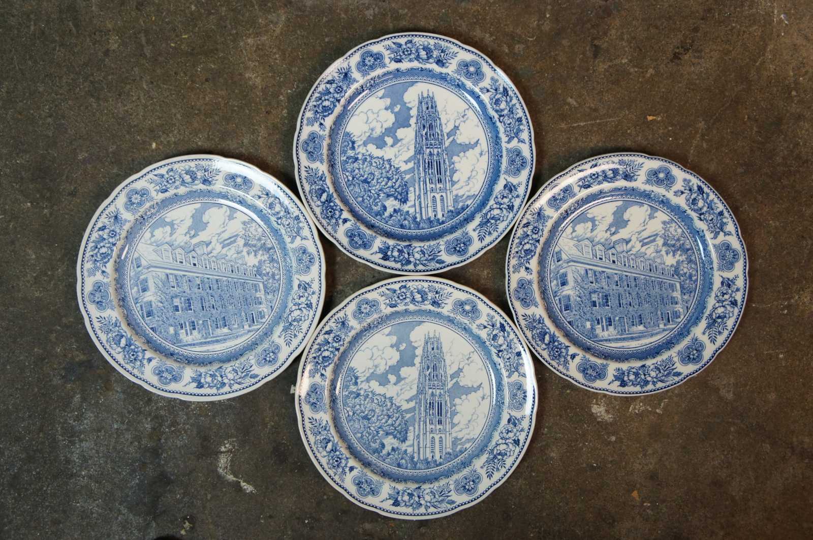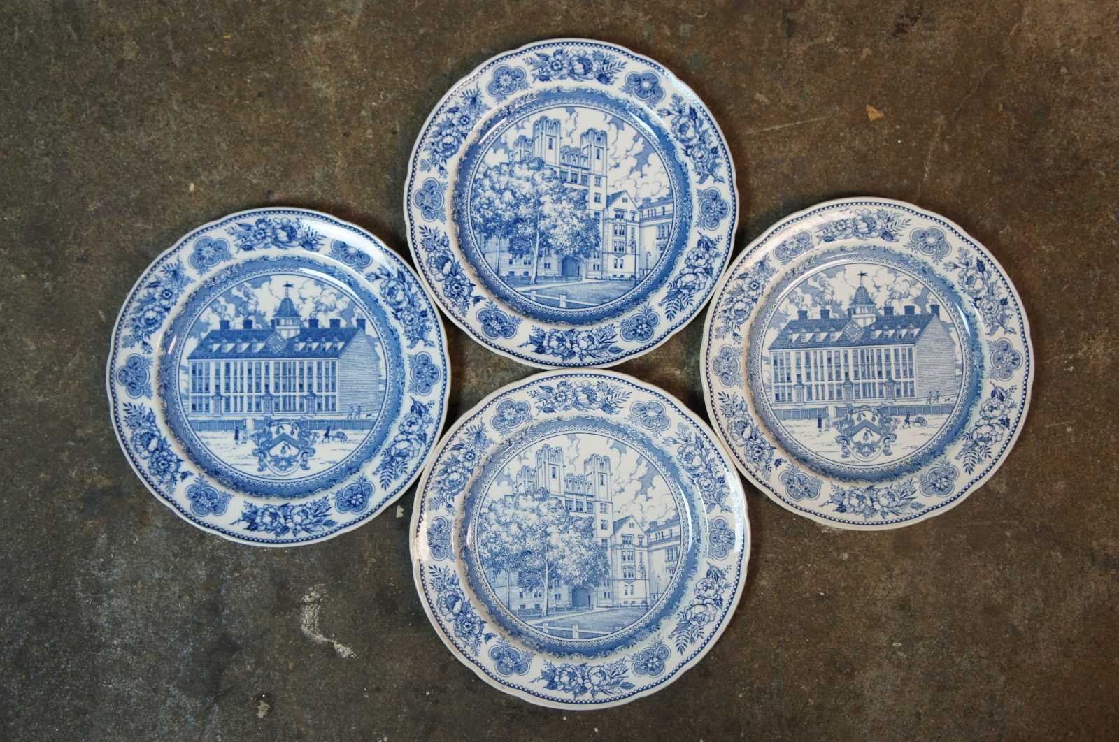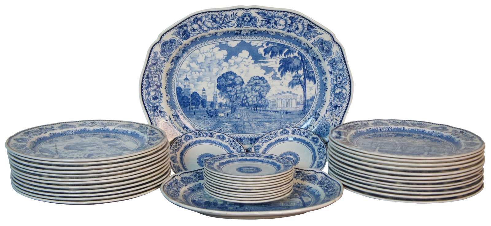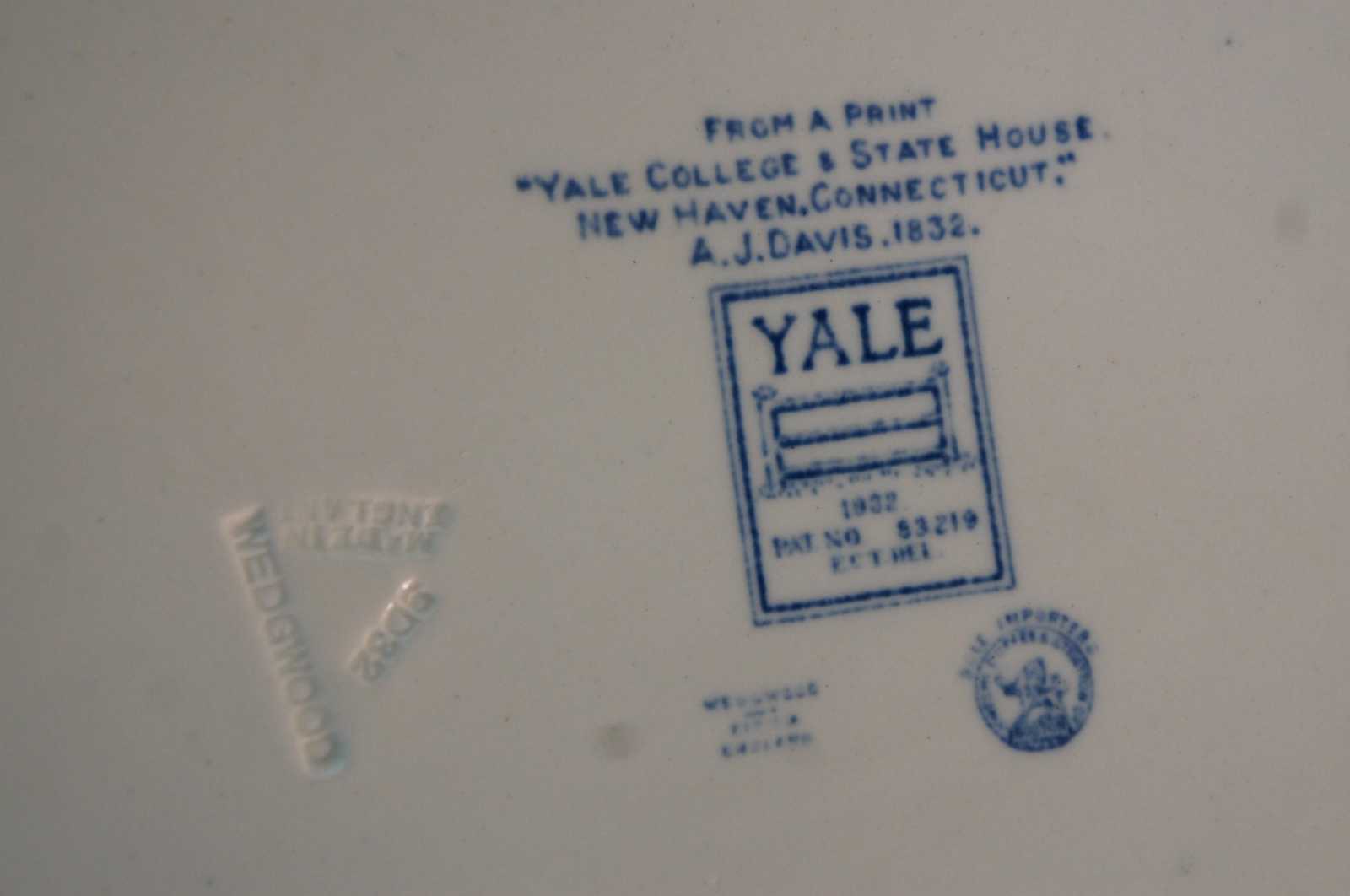 Antique 38 piece set of Wedgwood collegiate china showing the buildings of Yale University. Set matching platters in two sizes, a set of 12 matching bread plates, and 24 dinner plates comprising two each of twelve different patterns.