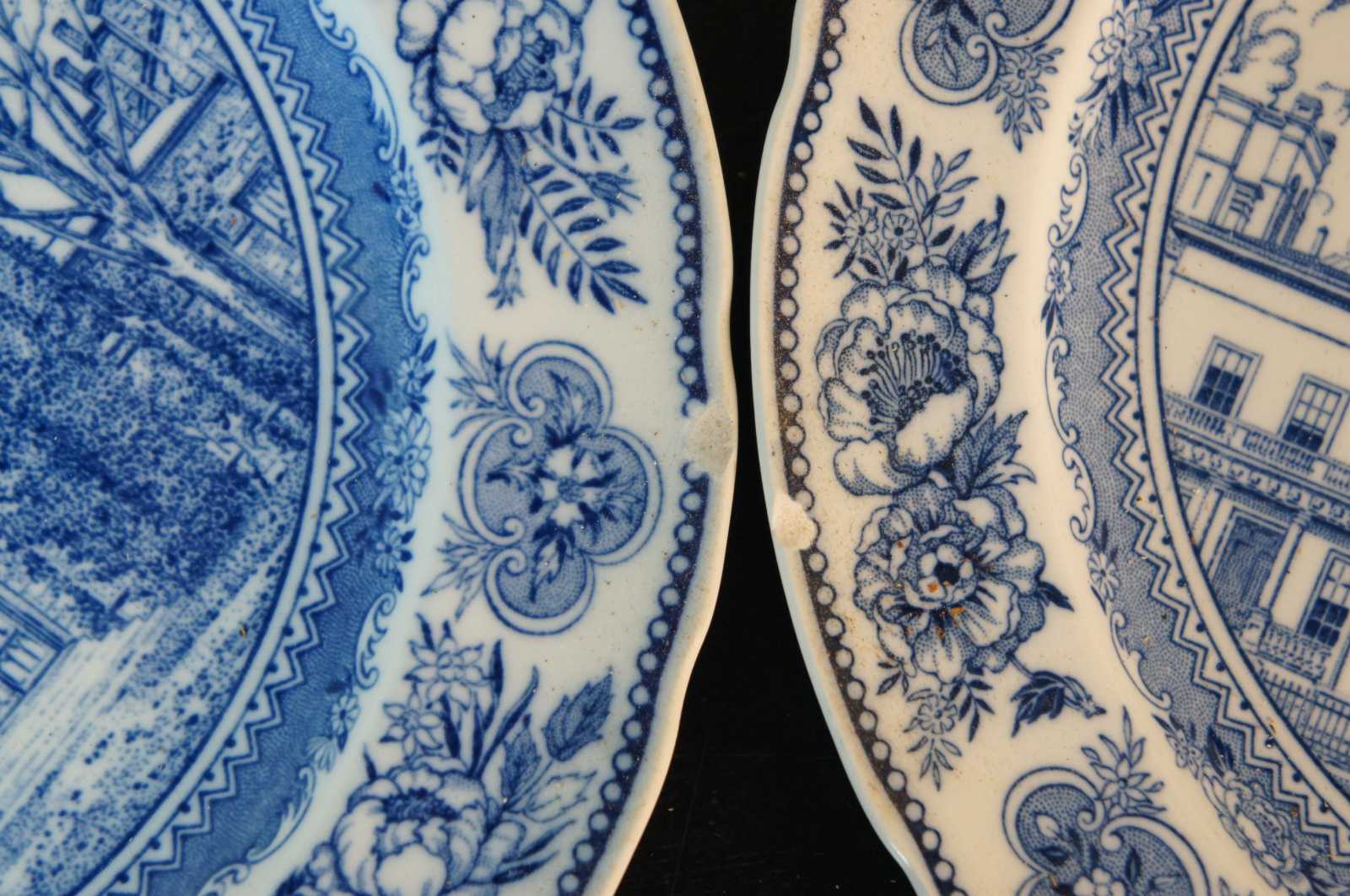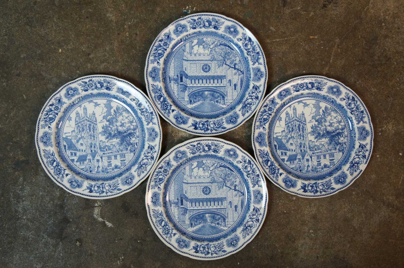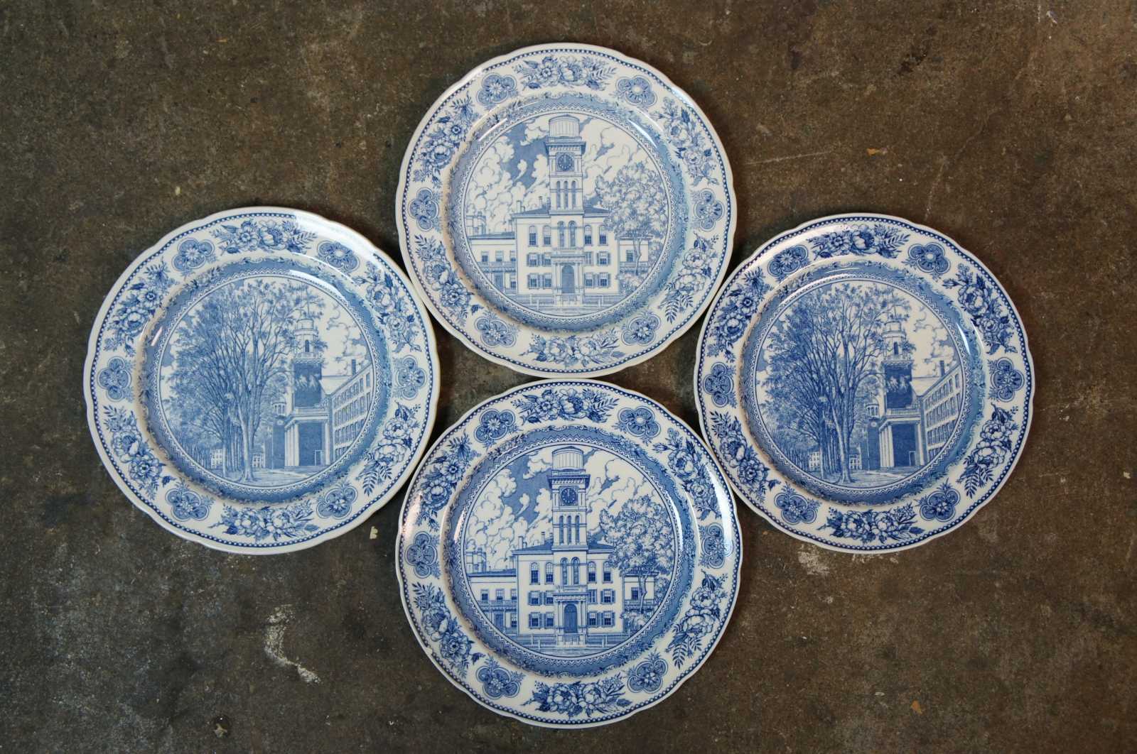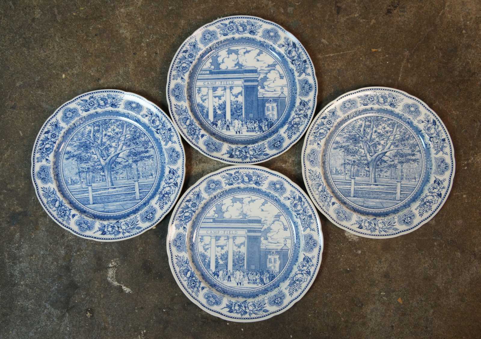 Antique 38 piece set of Wedgwood collegiate china showing the buildings of Yale University. Set matching platters in two sizes, a set of 12 matching bread plates, and 24 dinner plates comprising two each of twelve different patterns.