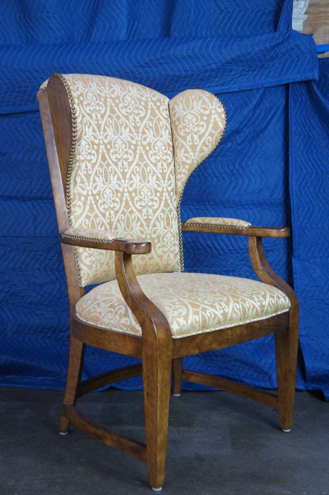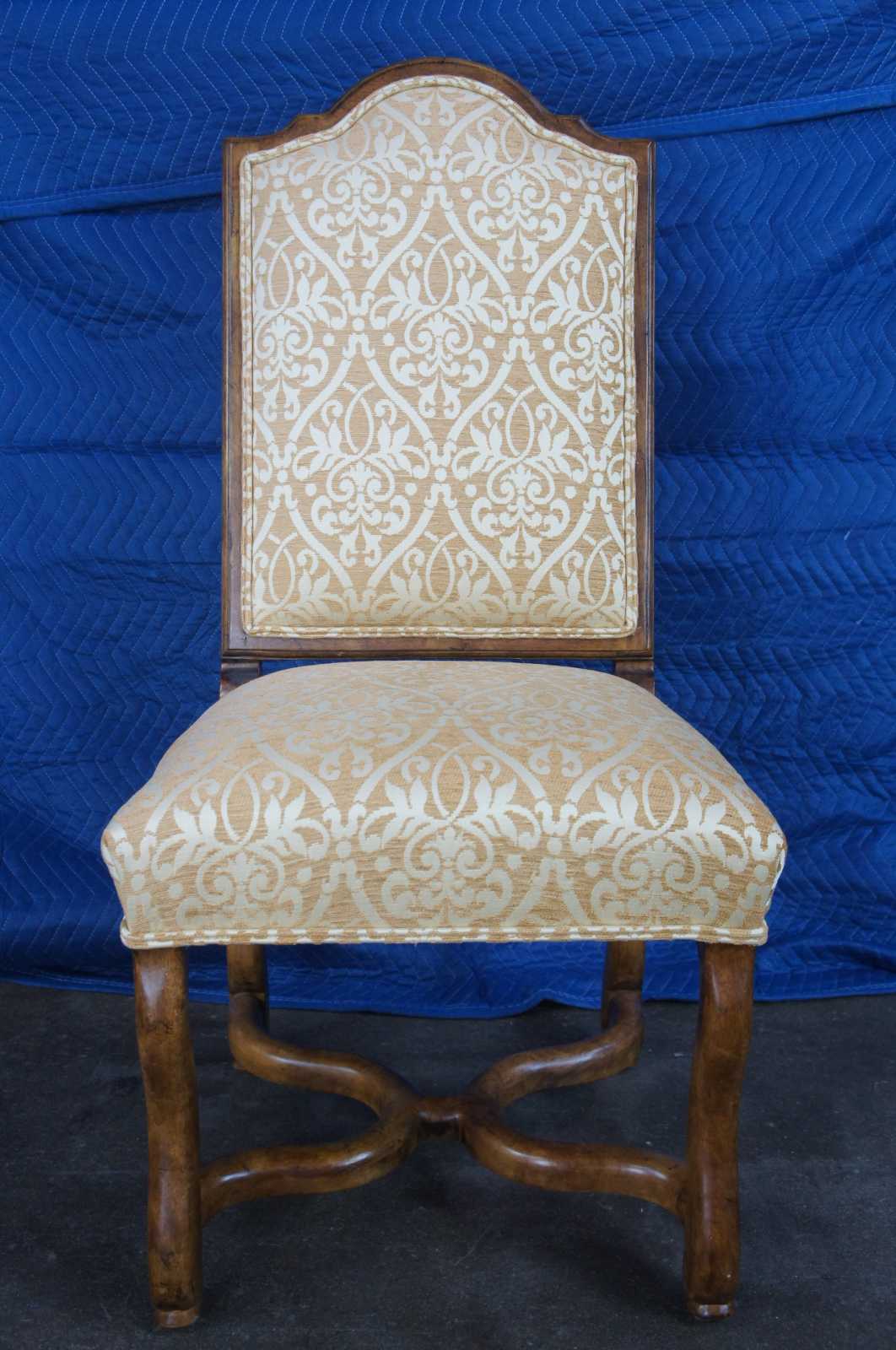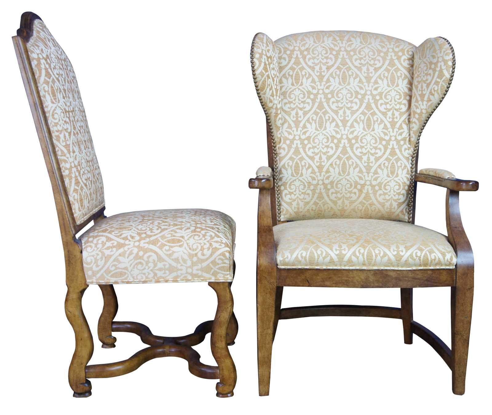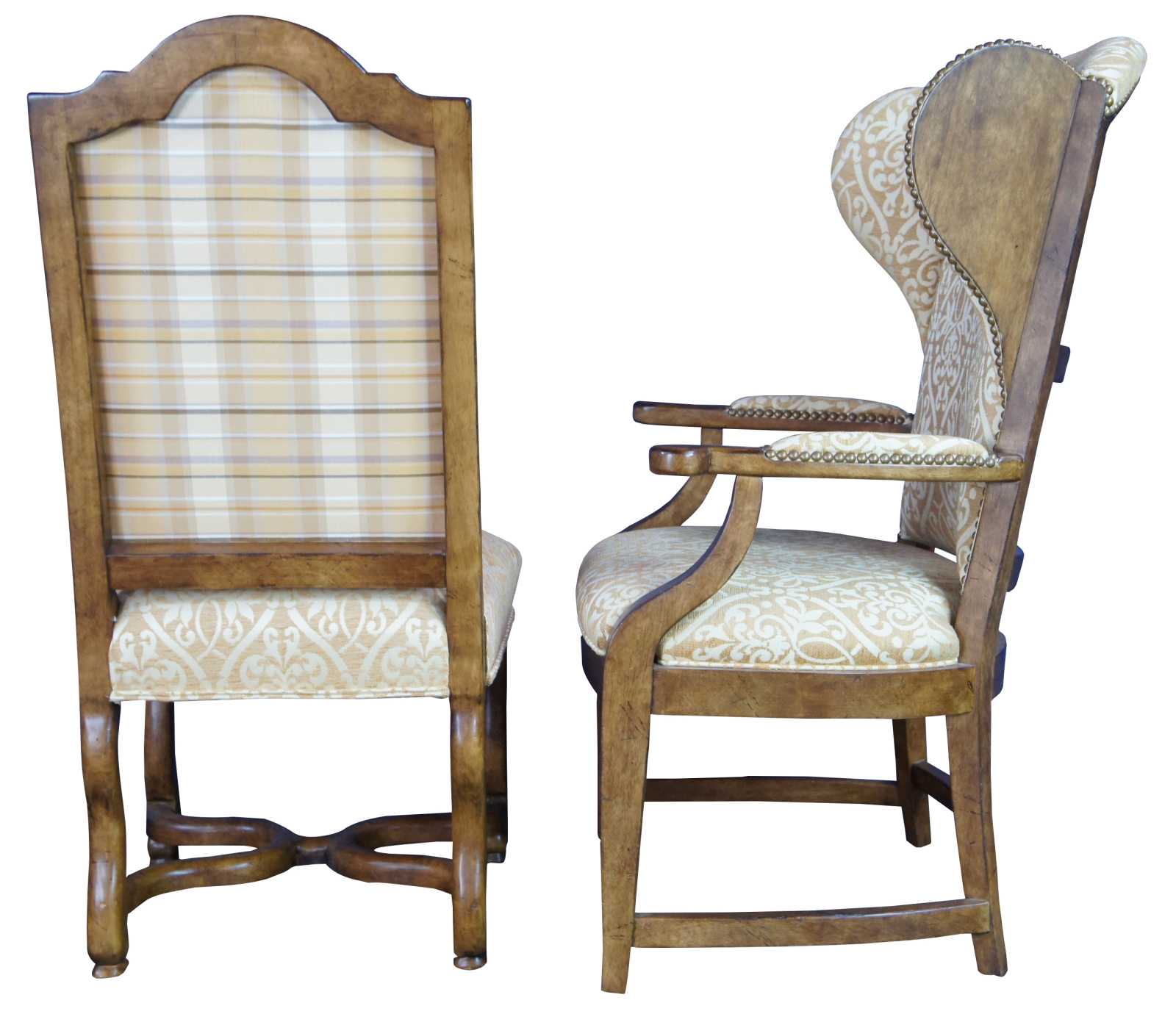 A stunning set of six Century Dining Room Chairs. 4 Deer Creek / Mill Room Side Chairs paired with the Caribou Club Arm Chair, Sierra Finish. An elegant blend between French Country and Old World Spanish styling. Made from European Beech Solids with a natural distressed finish. Upholstered in a beige and white brocade fabric with double cording and plaid striped backing. Side chairs approximately 35 lbs, Arms 50lbs. Circa 2013; T29-531, 611-542, 611-531, 3441A, 3439S