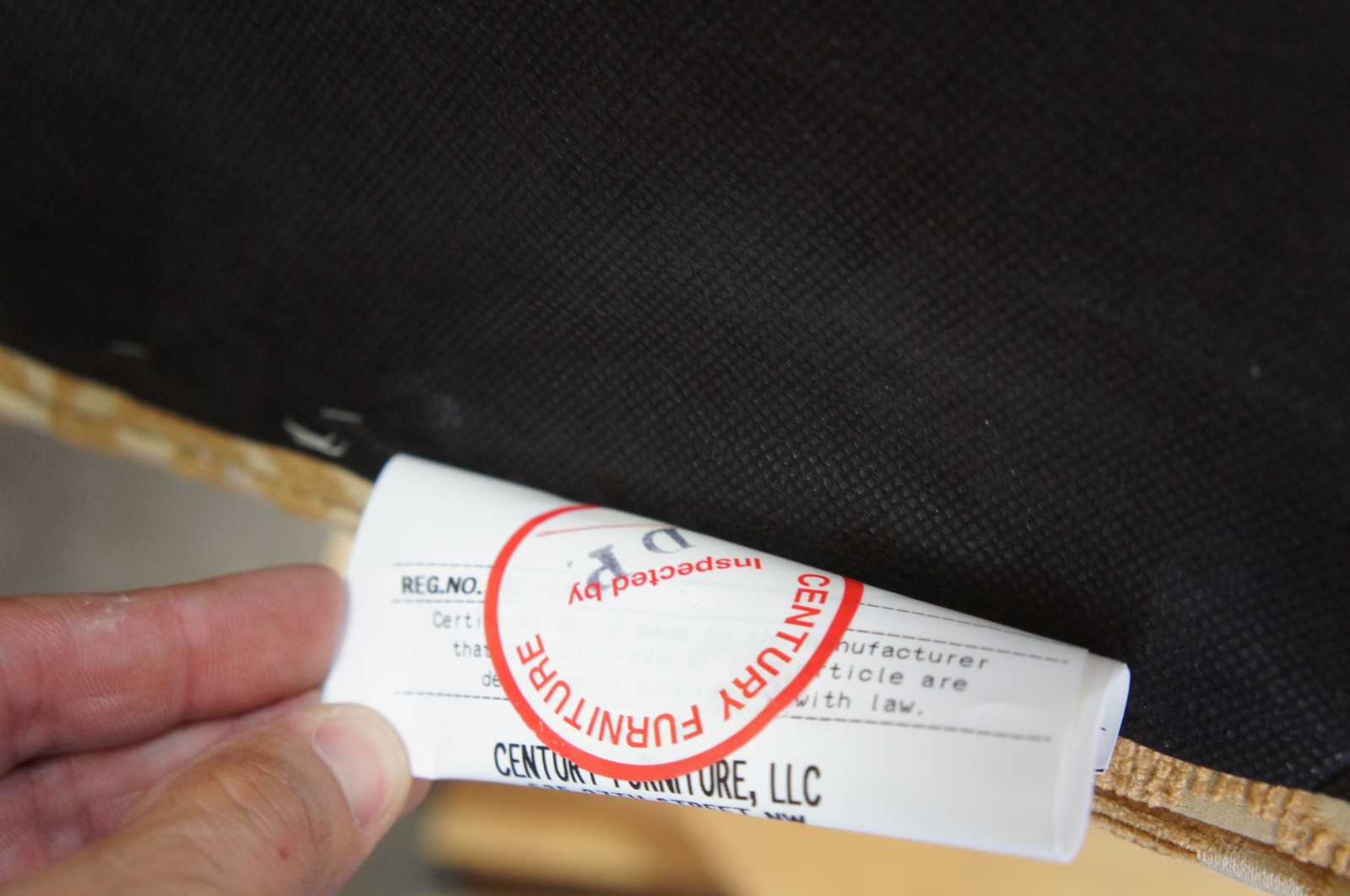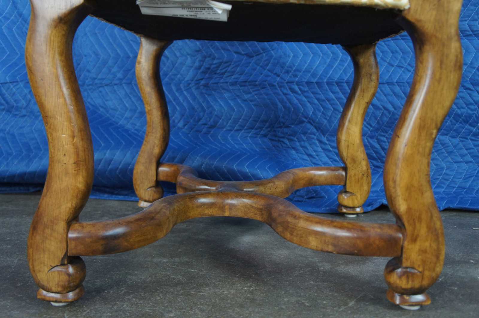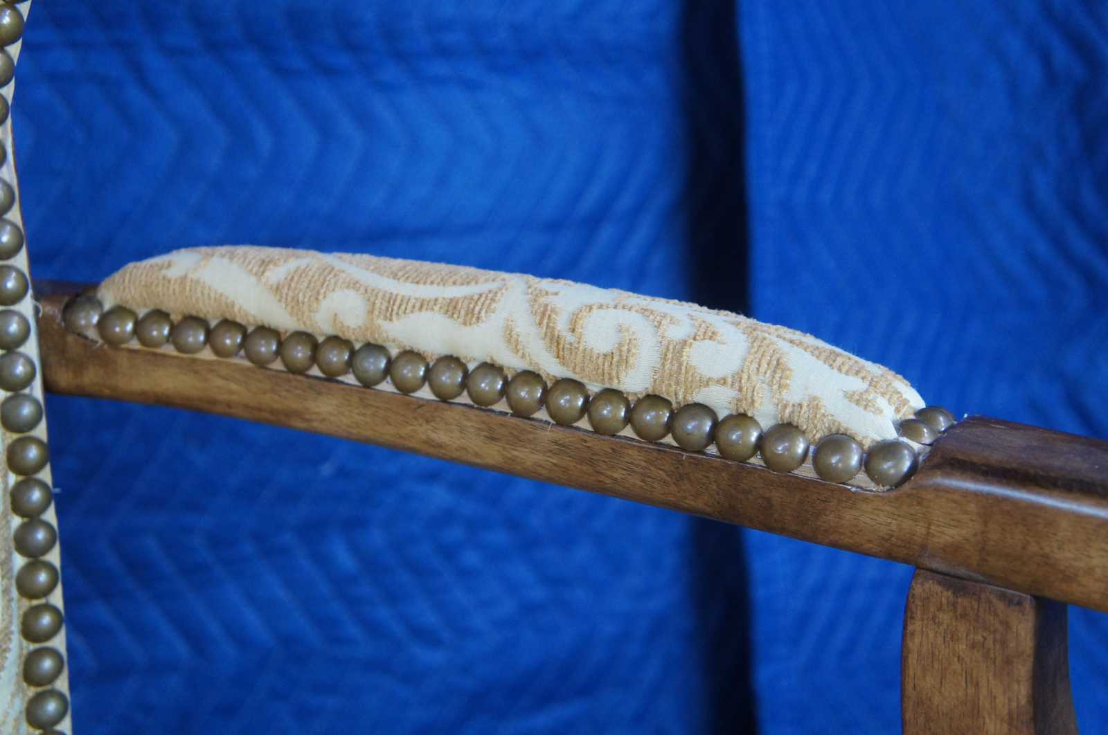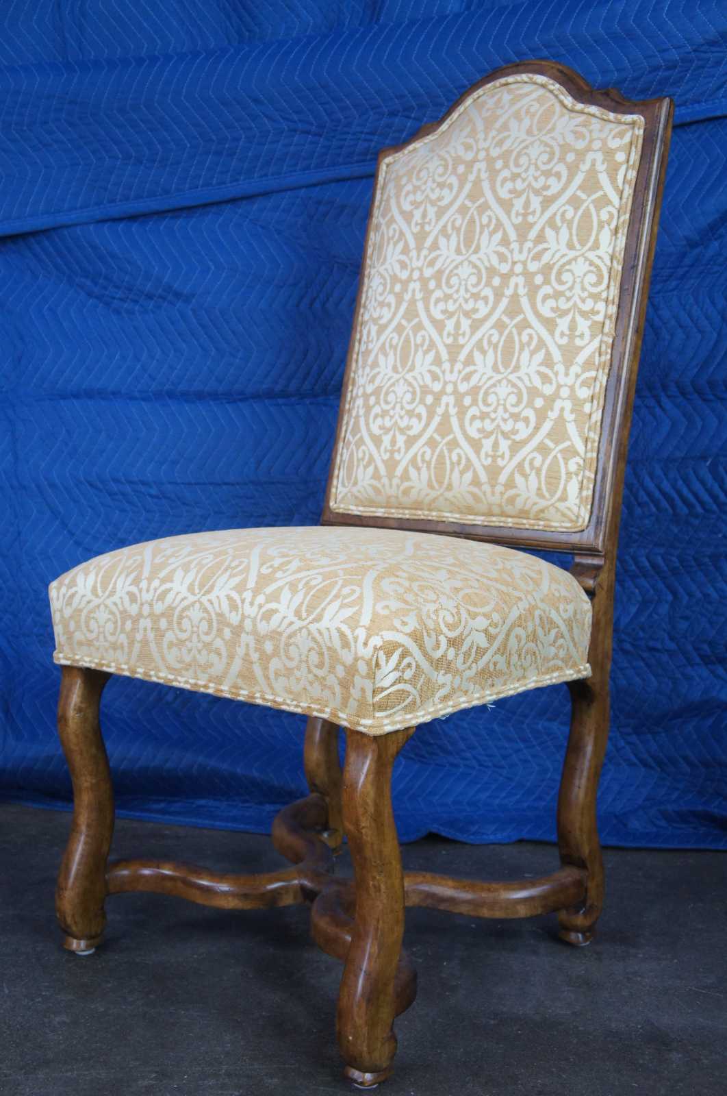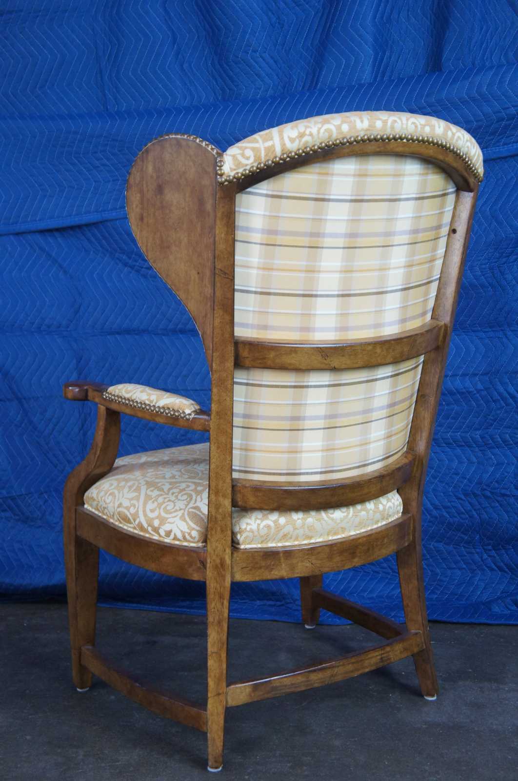 A stunning set of six Century Dining Room Chairs. 4 Deer Creek / Mill Room Side Chairs paired with the Caribou Club Arm Chair, Sierra Finish. An elegant blend between French Country and Old World Spanish styling. Made from European Beech Solids with a natural distressed finish. Upholstered in a beige and white brocade fabric with double cording and plaid striped backing. Side chairs approximately 35 lbs, Arms 50lbs. Circa 2013; T29-531, 611-542, 611-531, 3441A, 3439S