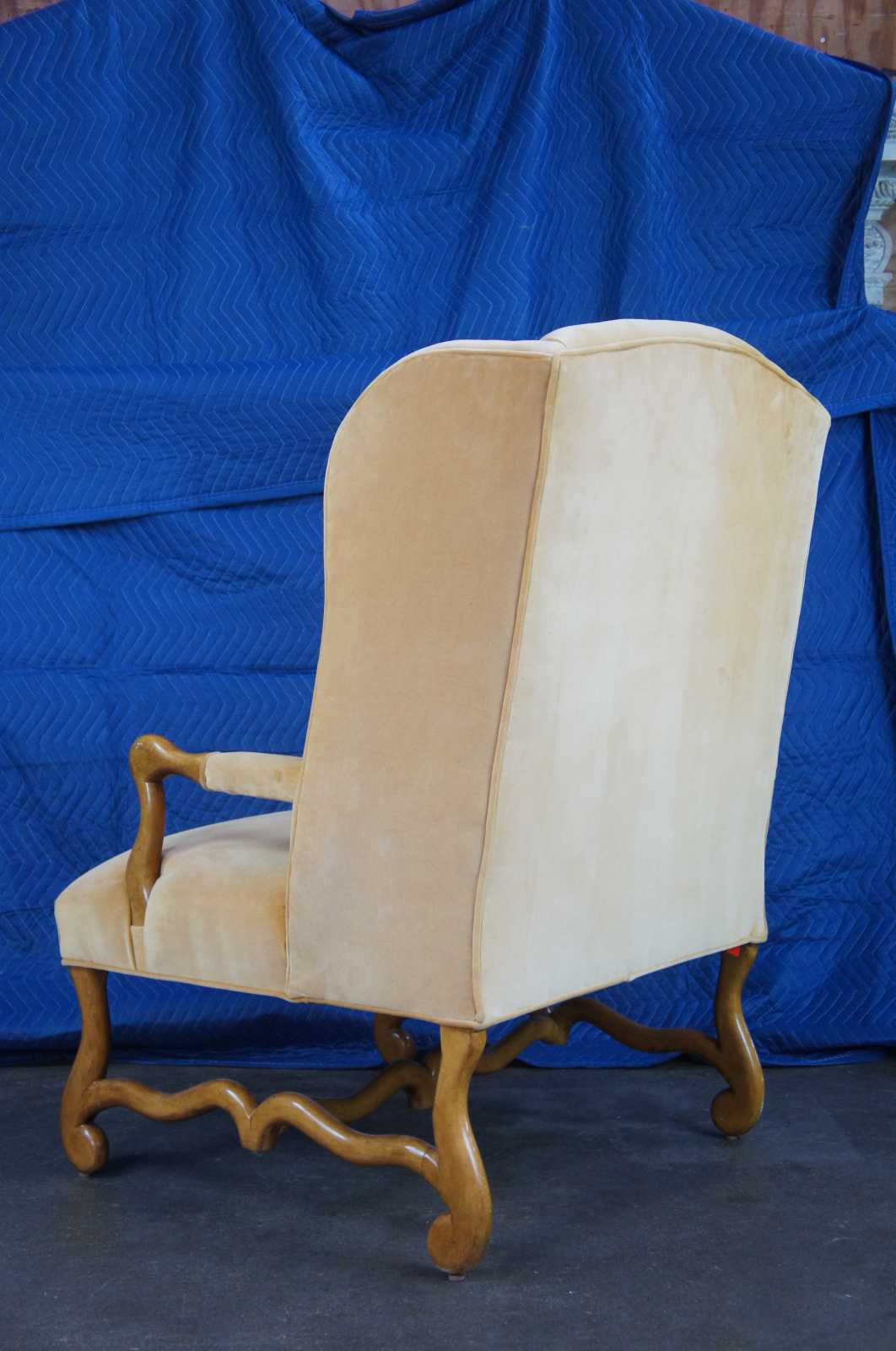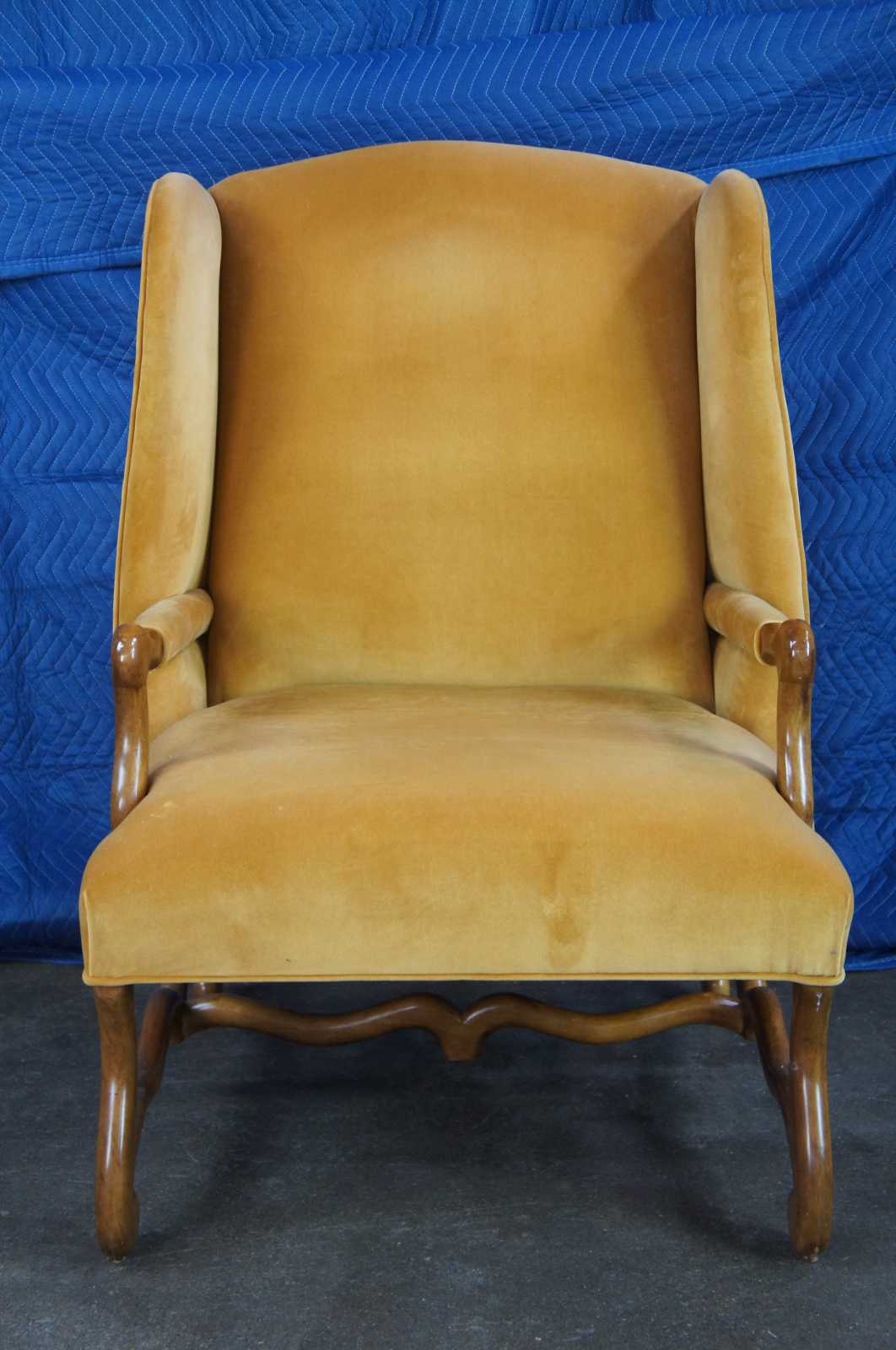 Magnificent Late 20th Century upholstered wingback armchair. Drawing inspiration from Old World George II and Modern styling. Features a pronounced wing leading to open arms allowing the natural wood to glow. Upholstered in a gold toned suede upholstery and supported by scrolled legs with a serpentine carved H stetcher..