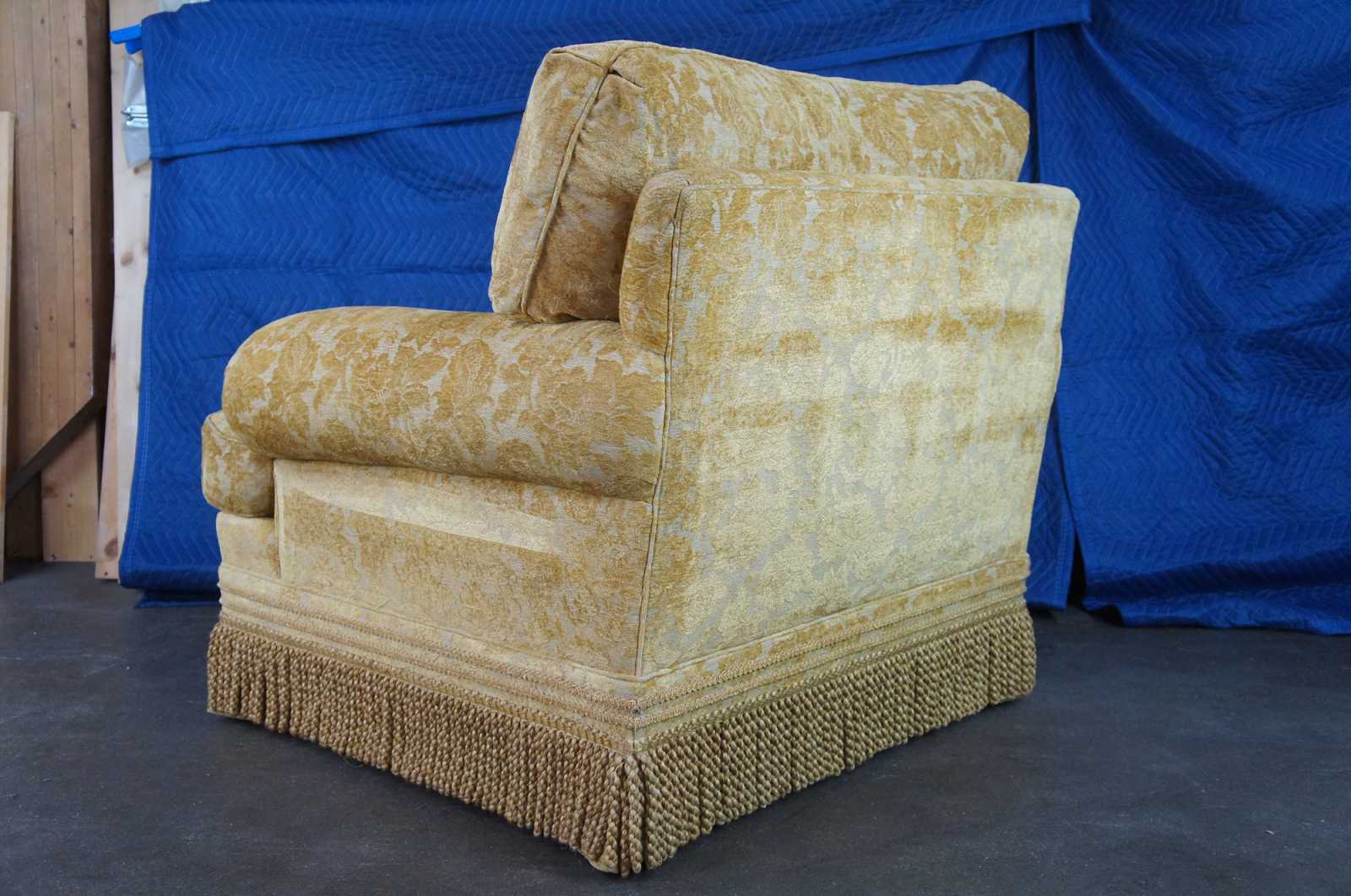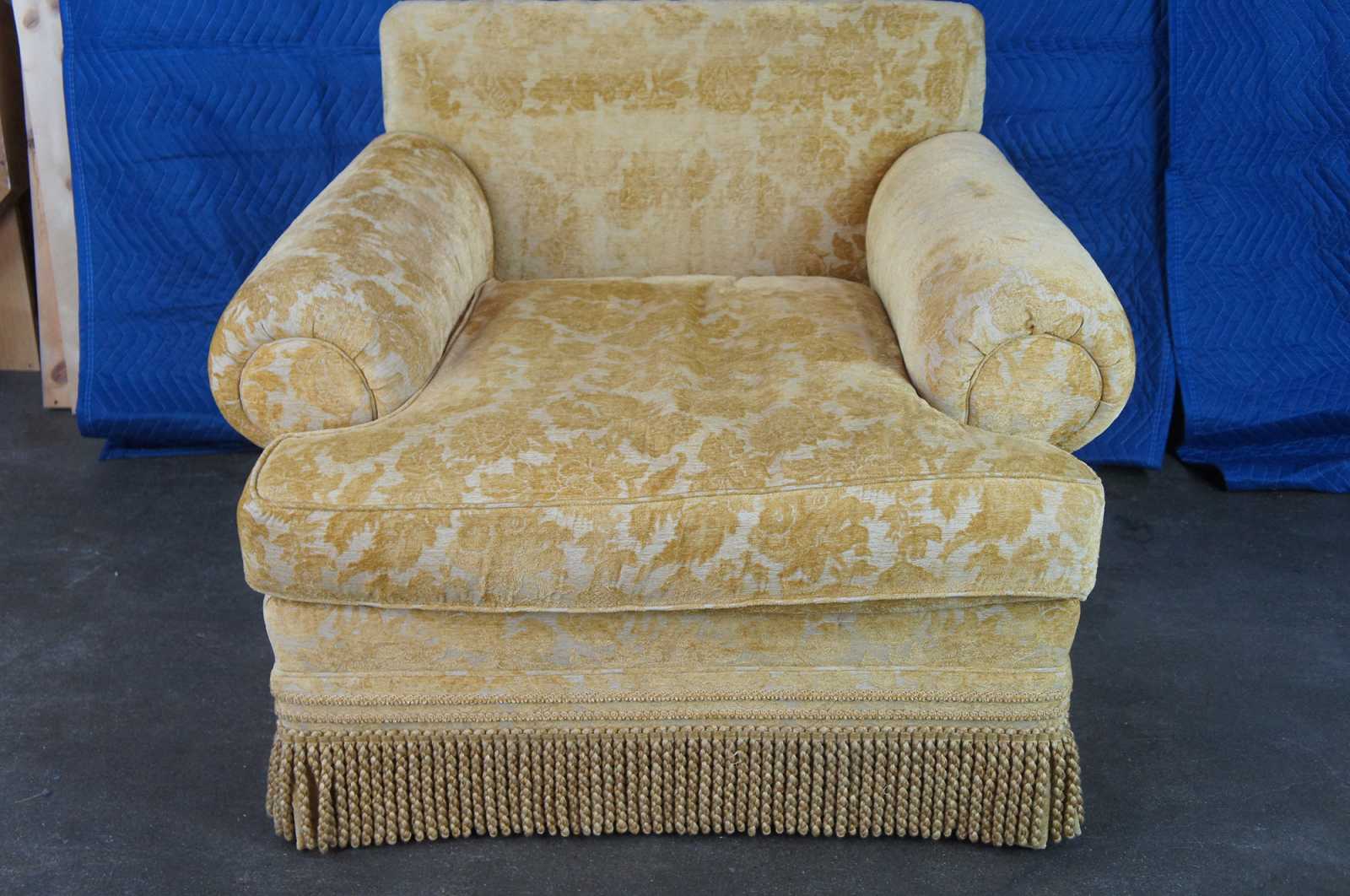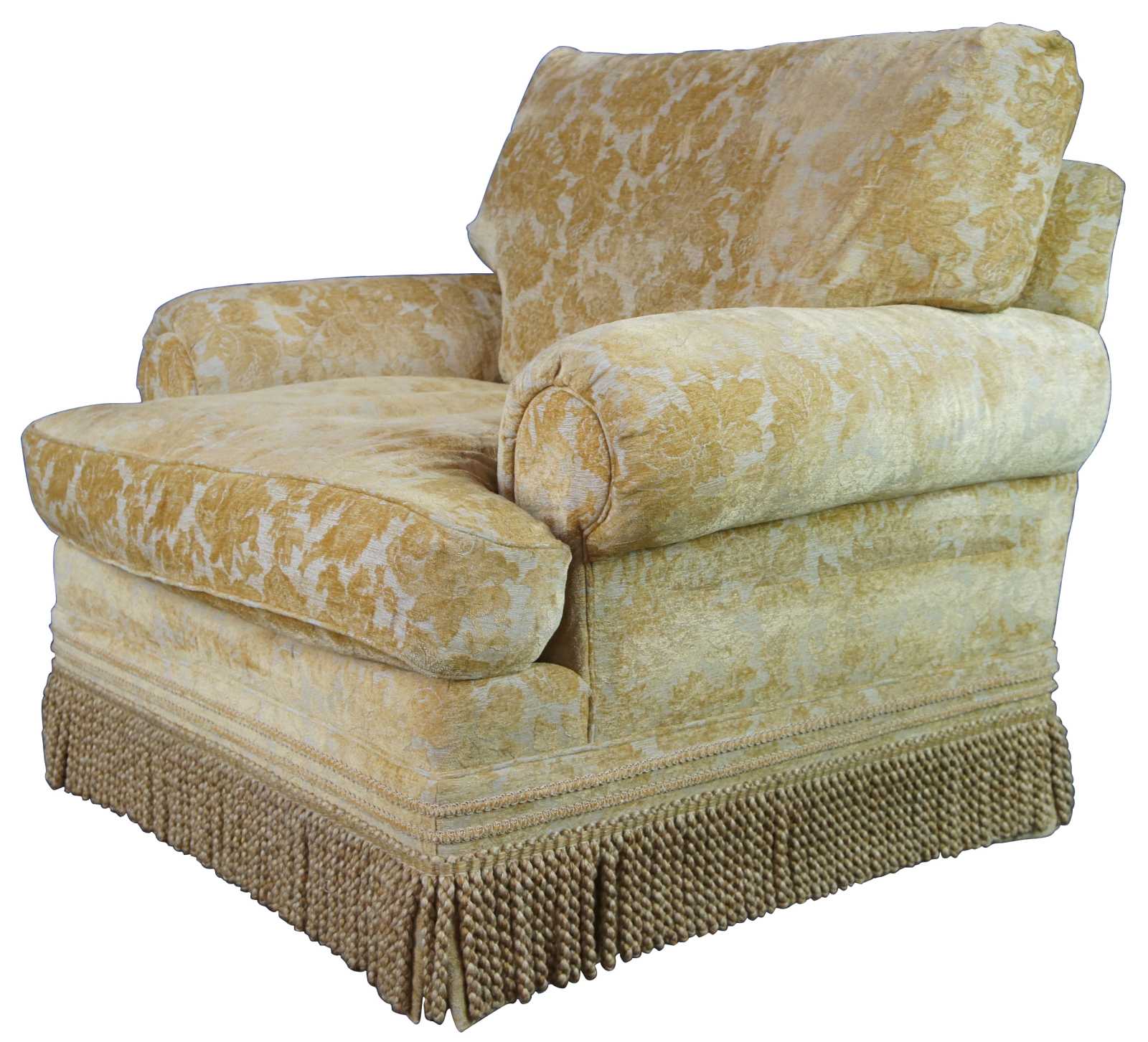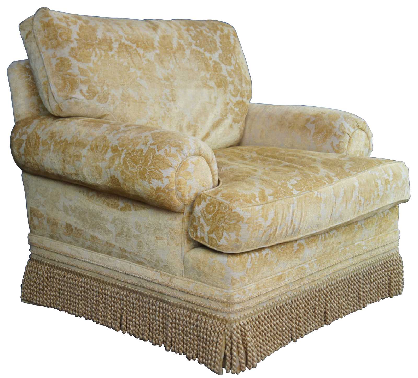 2001 Hickory Chair Co Oversized armchair featuring rolled arms and overstuffed upholstery with skirted tassel accent. Fabric Devon, down filled with grey duck down.