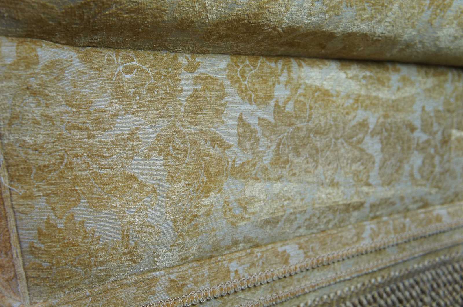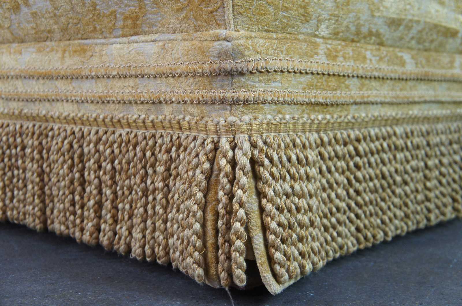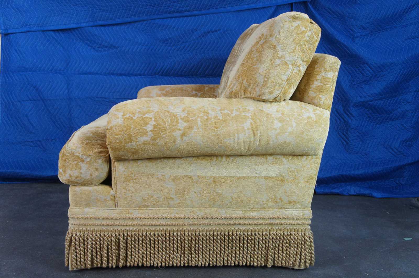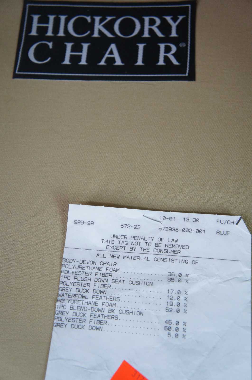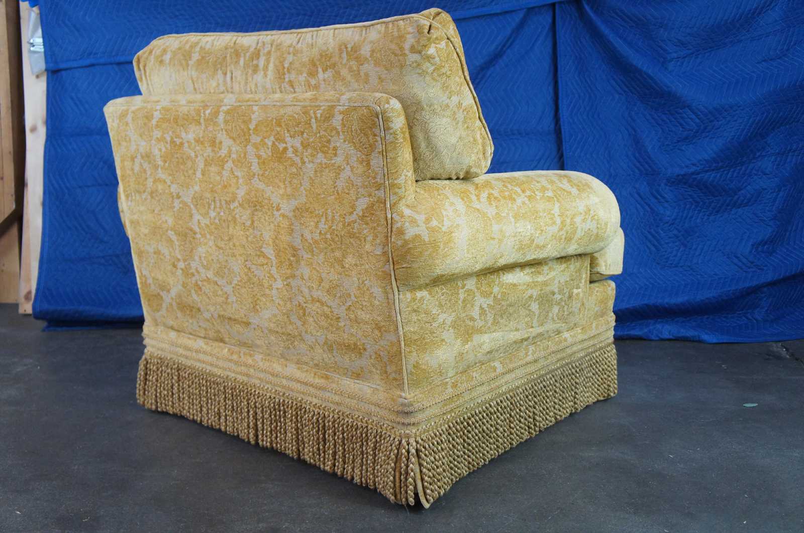 2001 Hickory Chair Co Oversized armchair featuring rolled arms and overstuffed upholstery with skirted tassel accent. Fabric Devon, down filled with grey duck down.