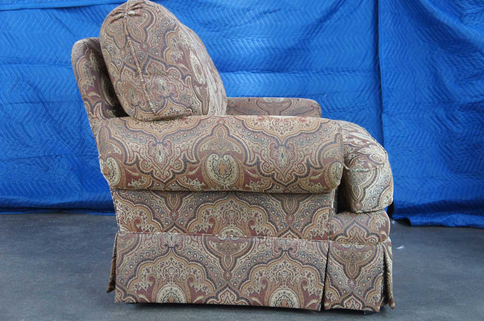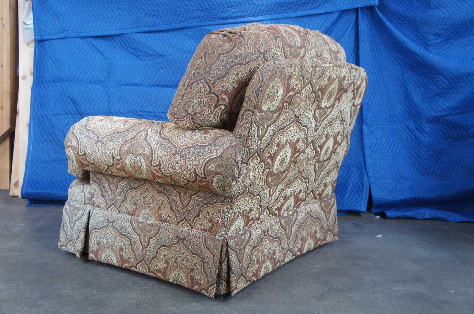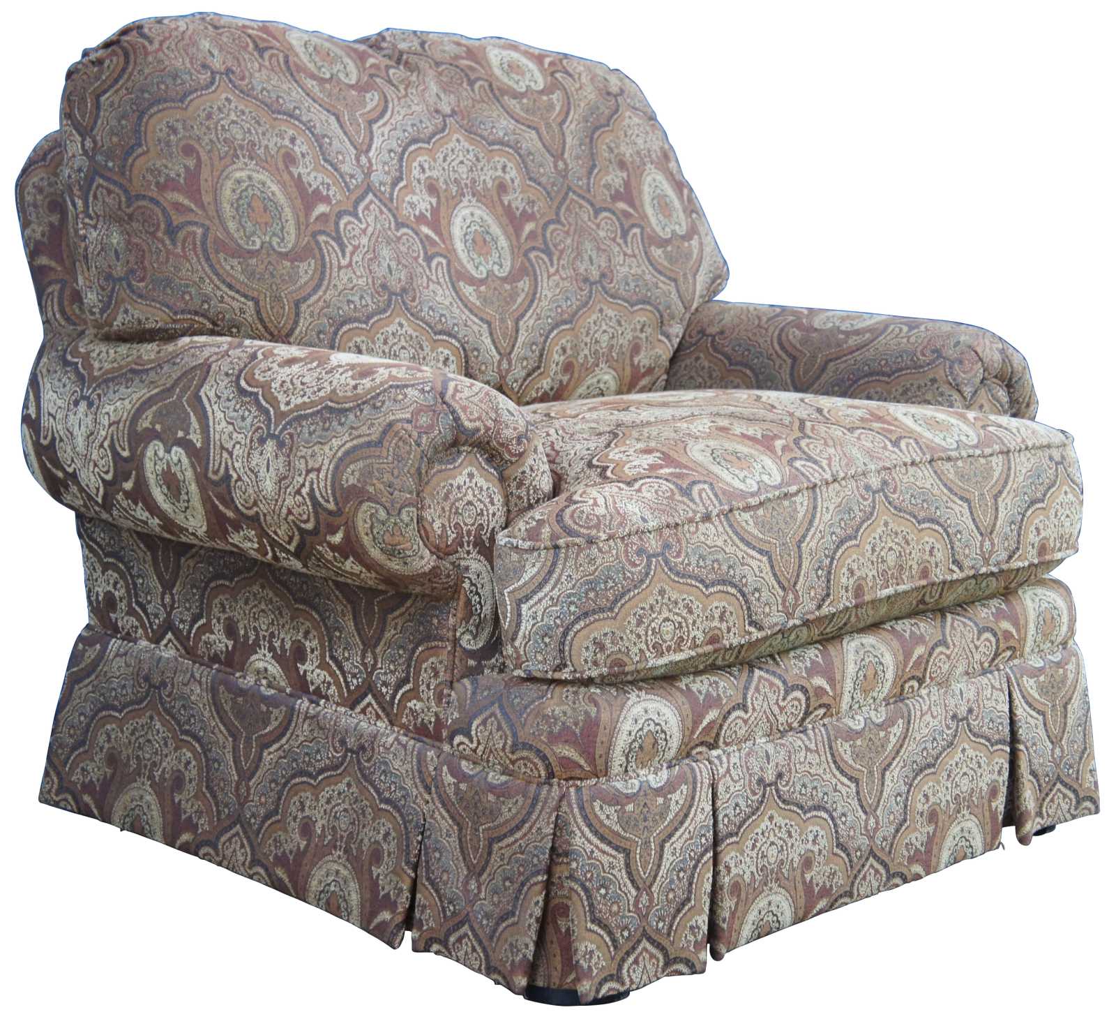 Taylor King oversized armchair featuring rolled arms and paisley brocade upholstery.