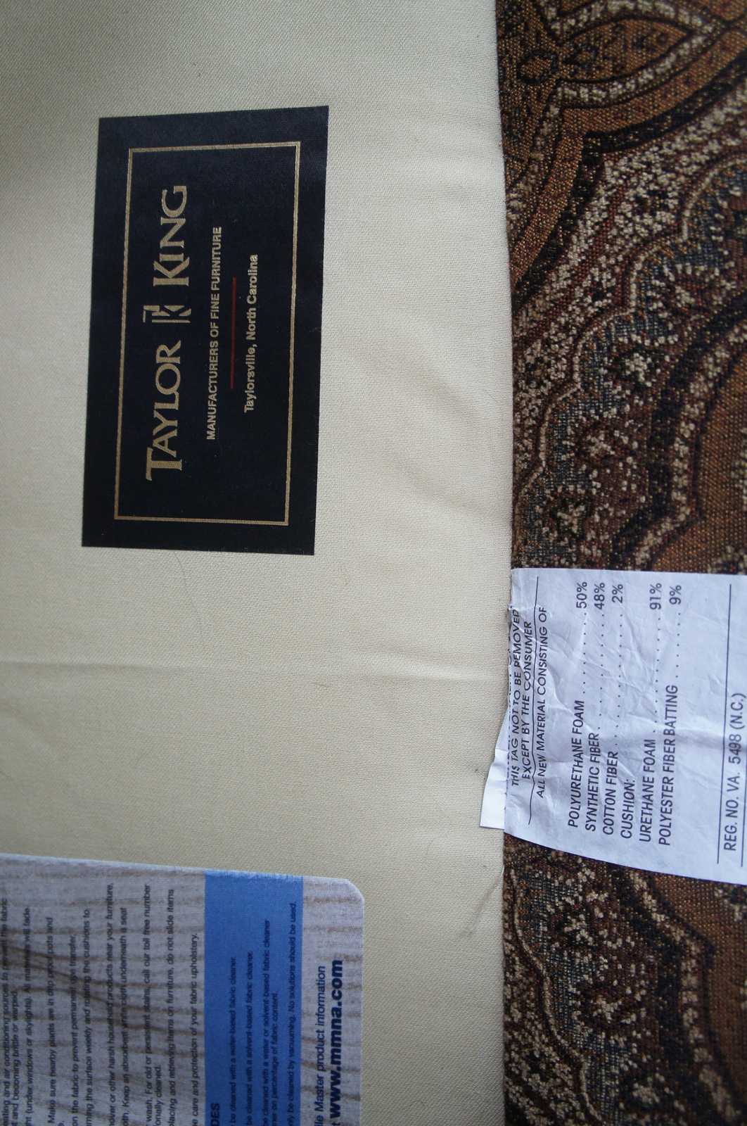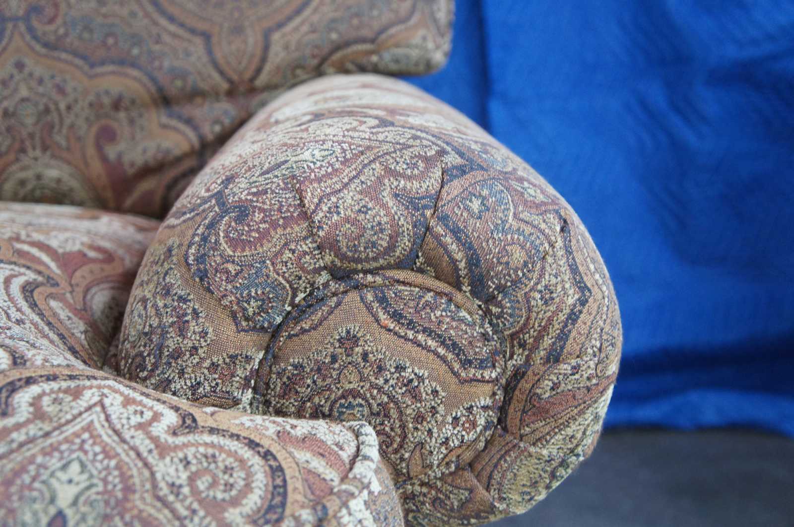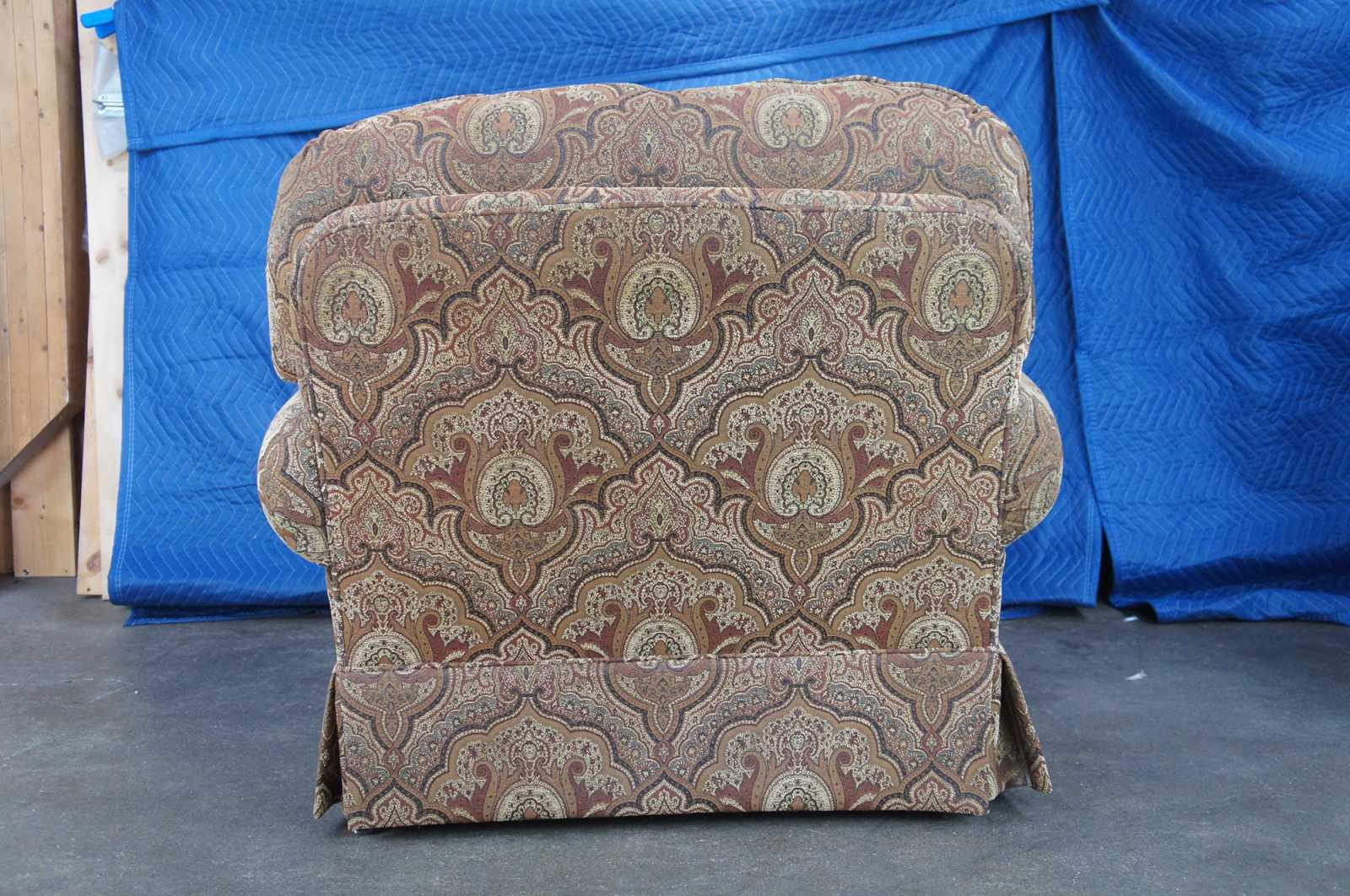 Taylor King oversized armchair featuring rolled arms and paisley brocade upholstery.