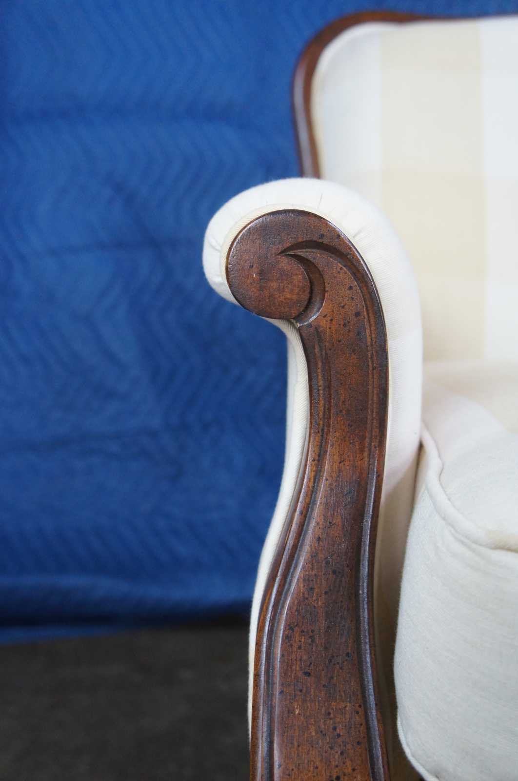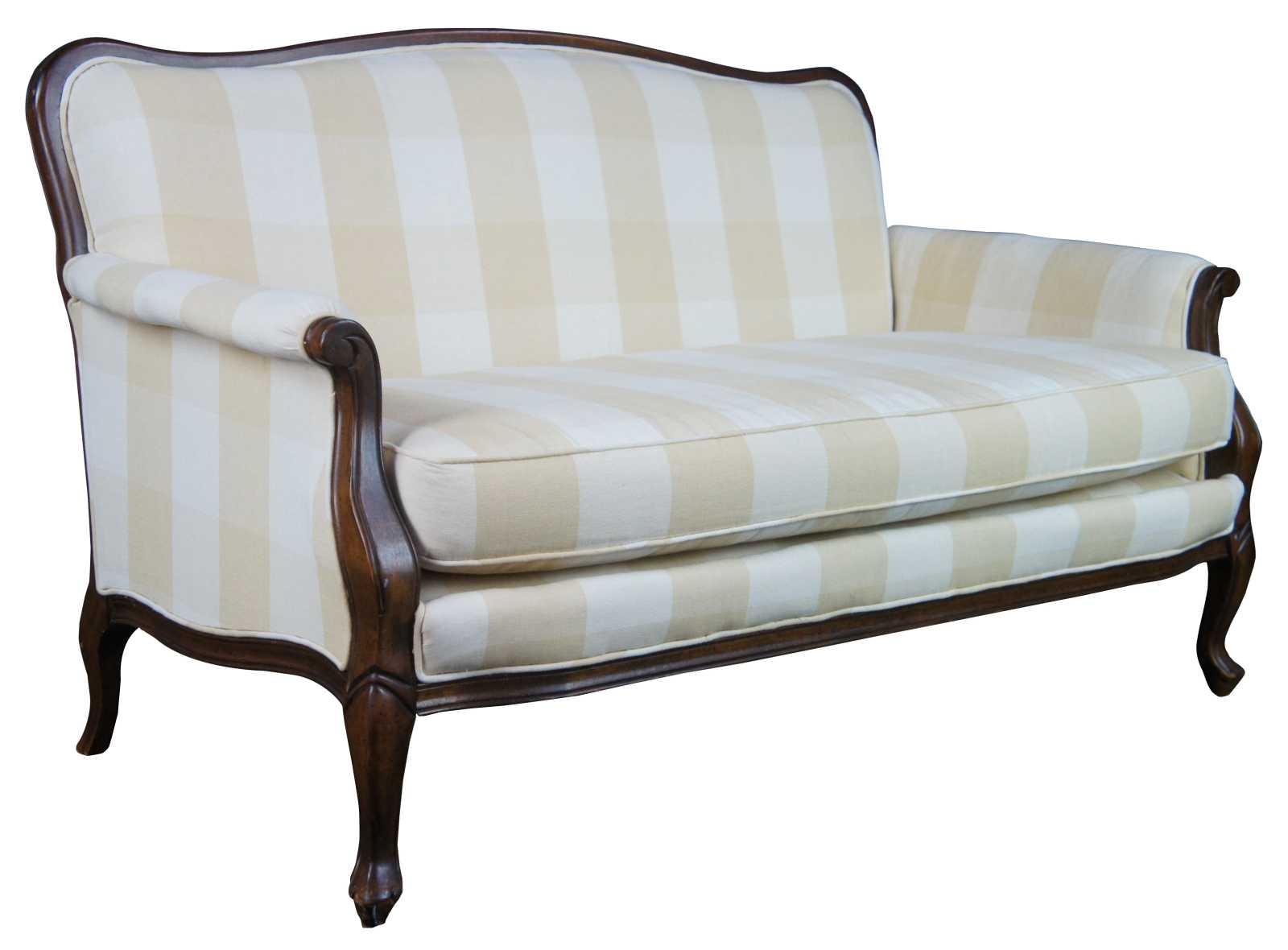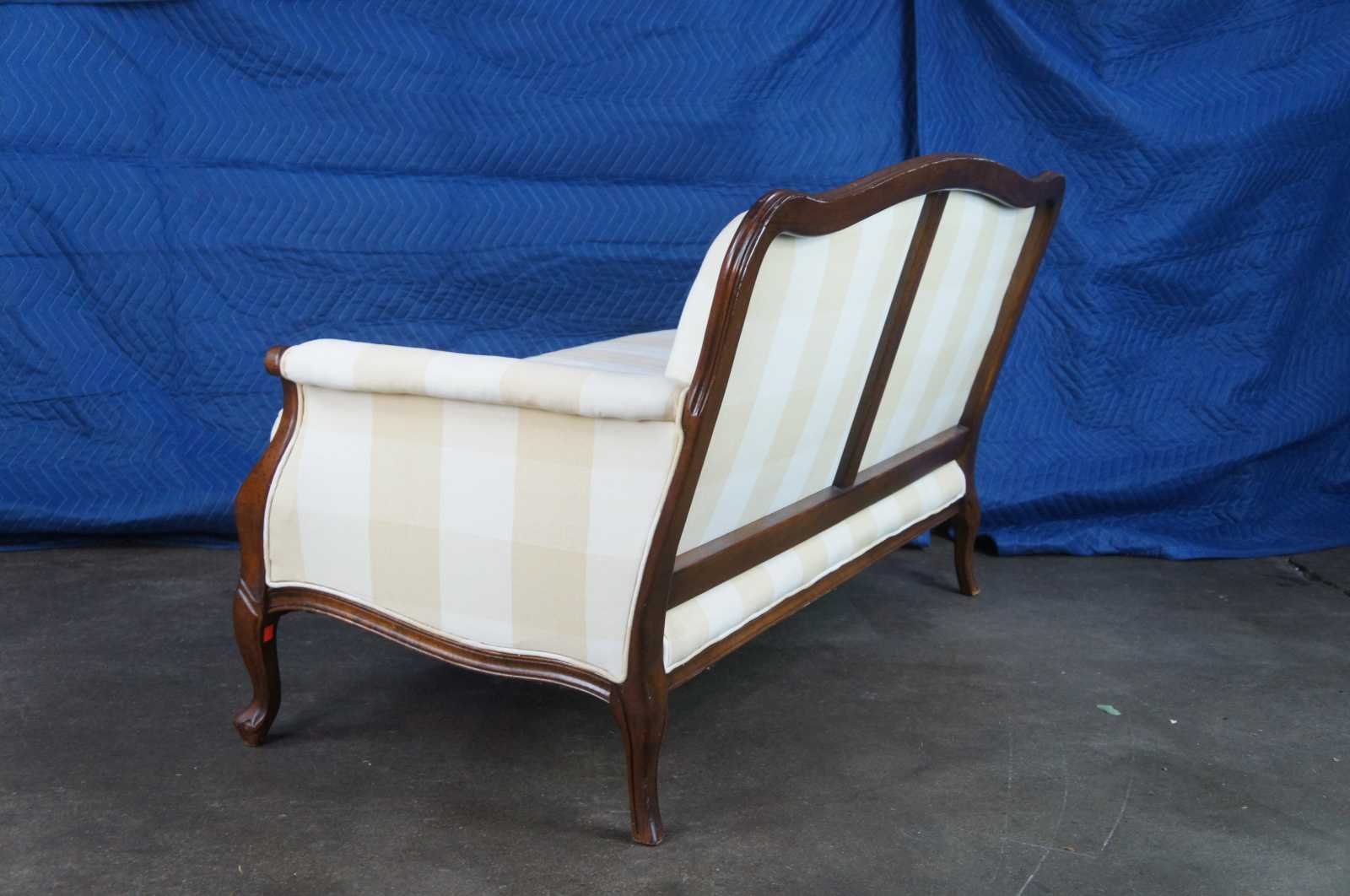 Antique settee or love seat made from naturally distressed walnut with French styling complimented by yellow and white plaid upholstery.