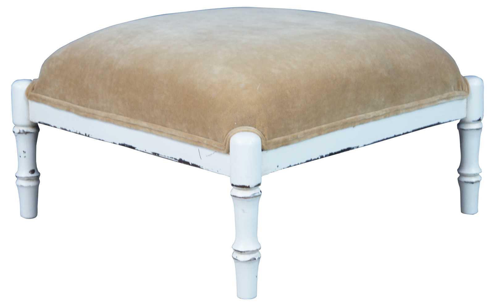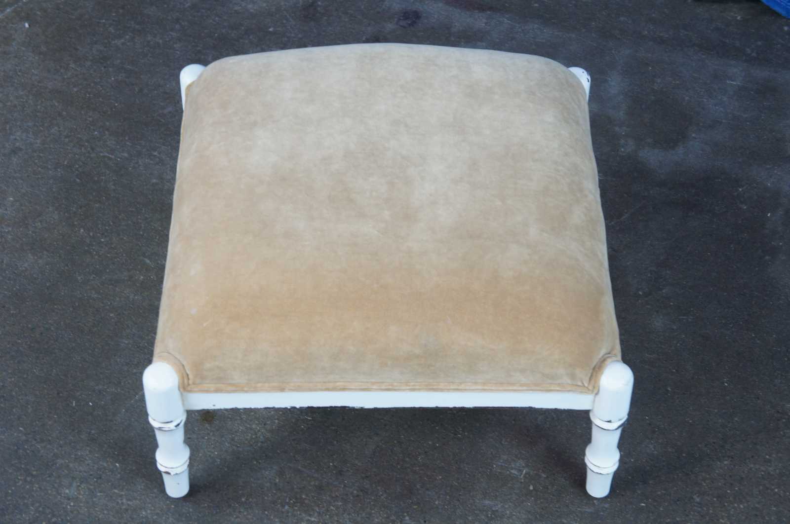 Vintage Ballard Designs square form ottoman or foot stool. Features a white distressed finish allowing the natural understones of the wood to be seen trhogh. Features turned legs and beige fabric with double cording.