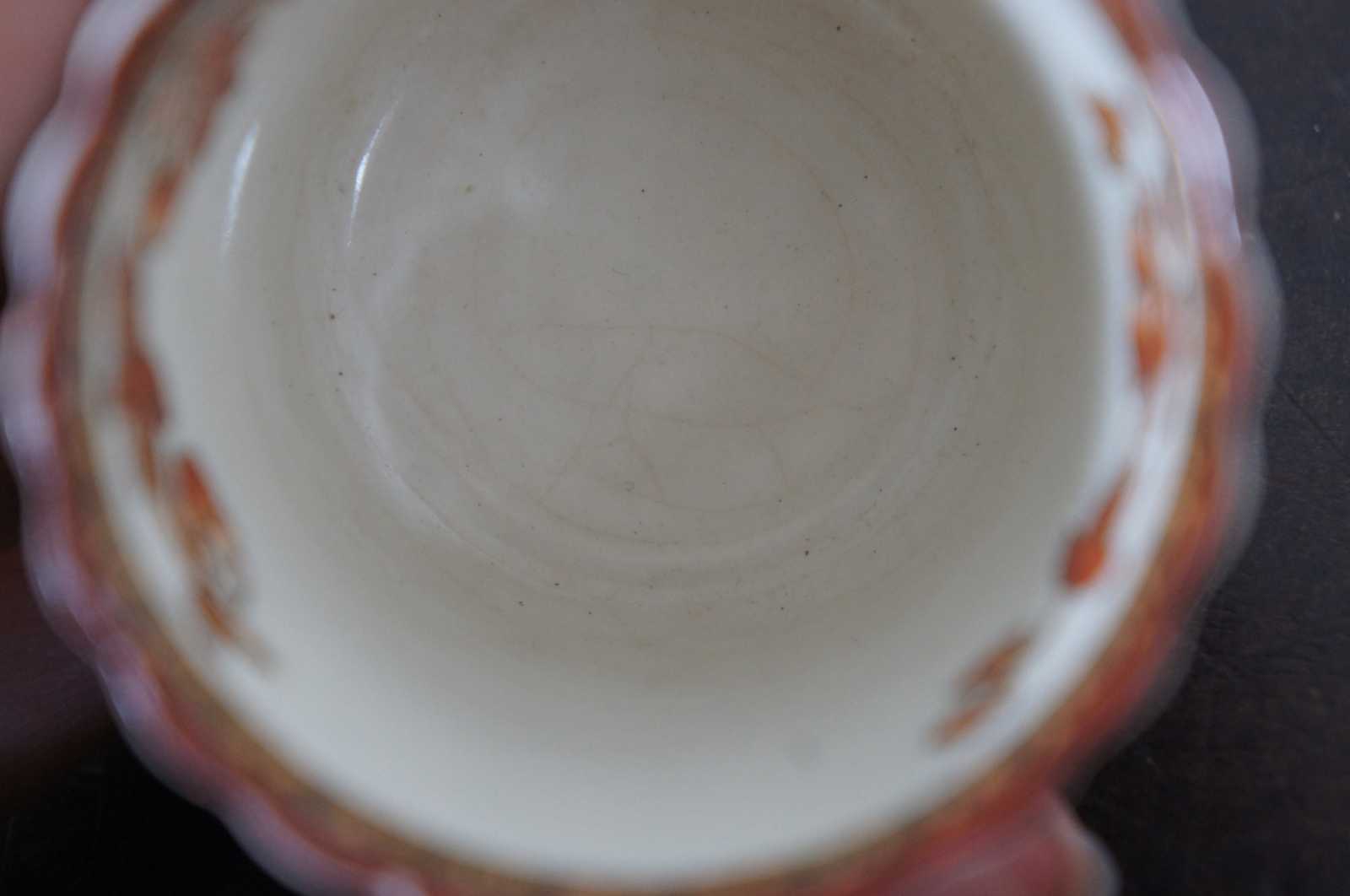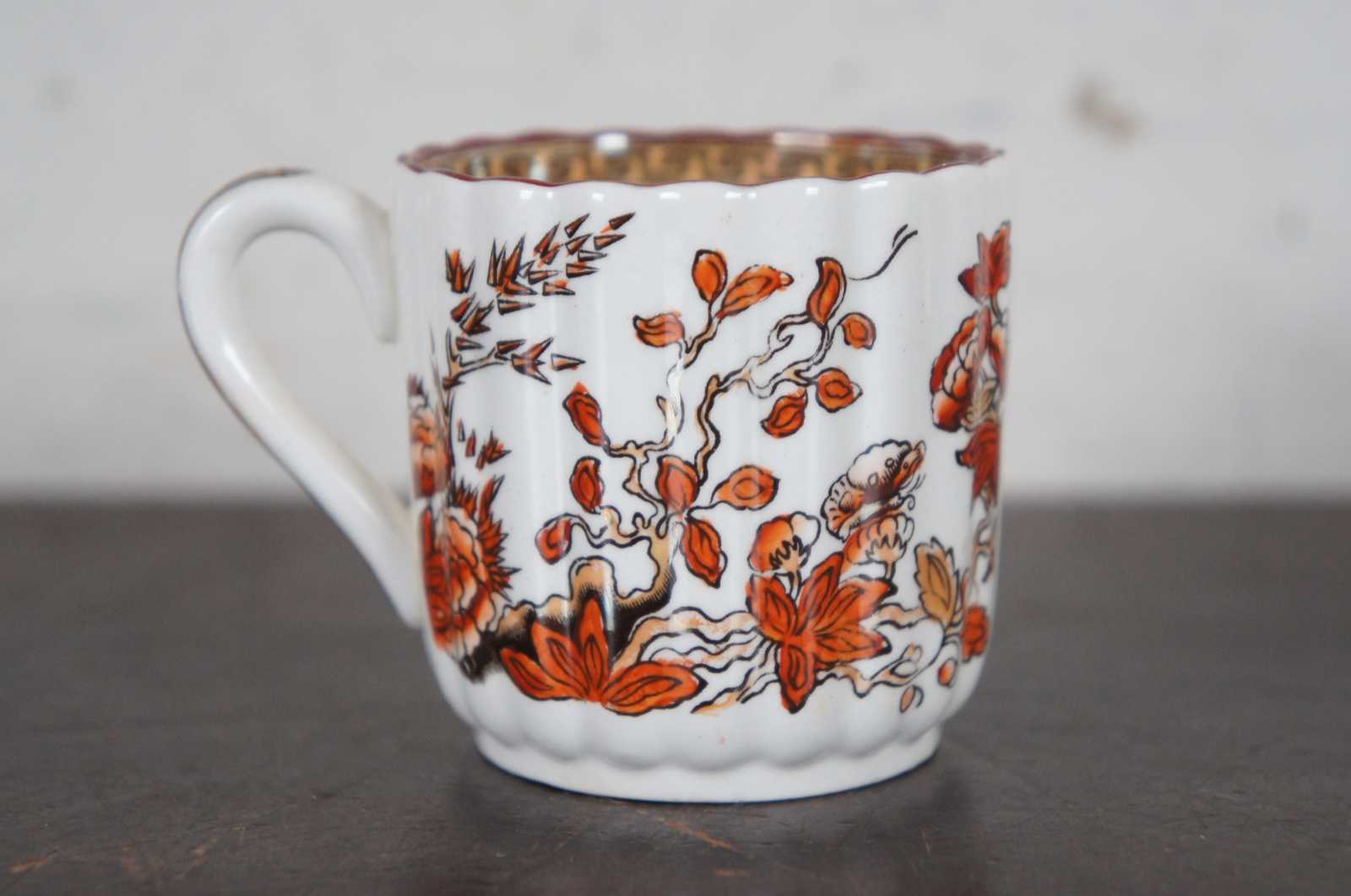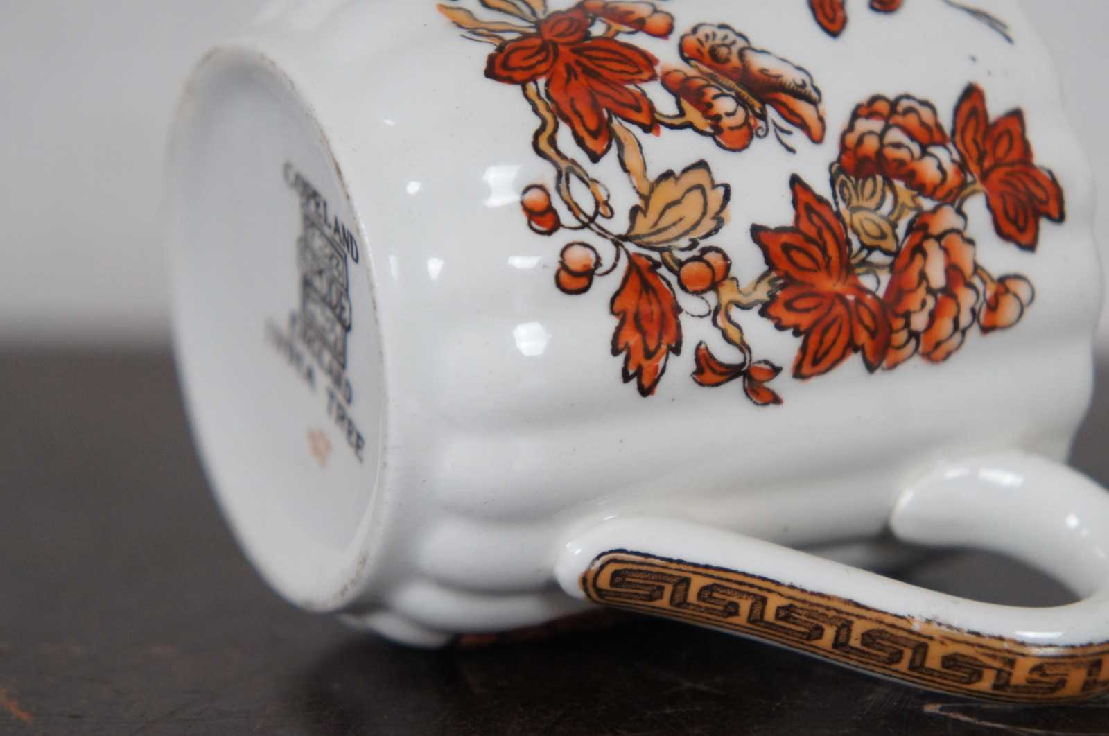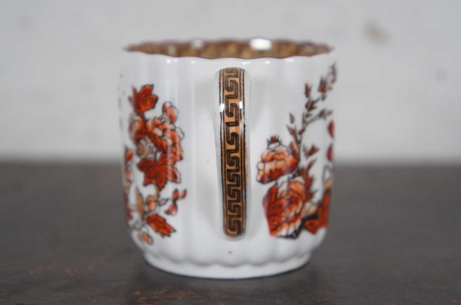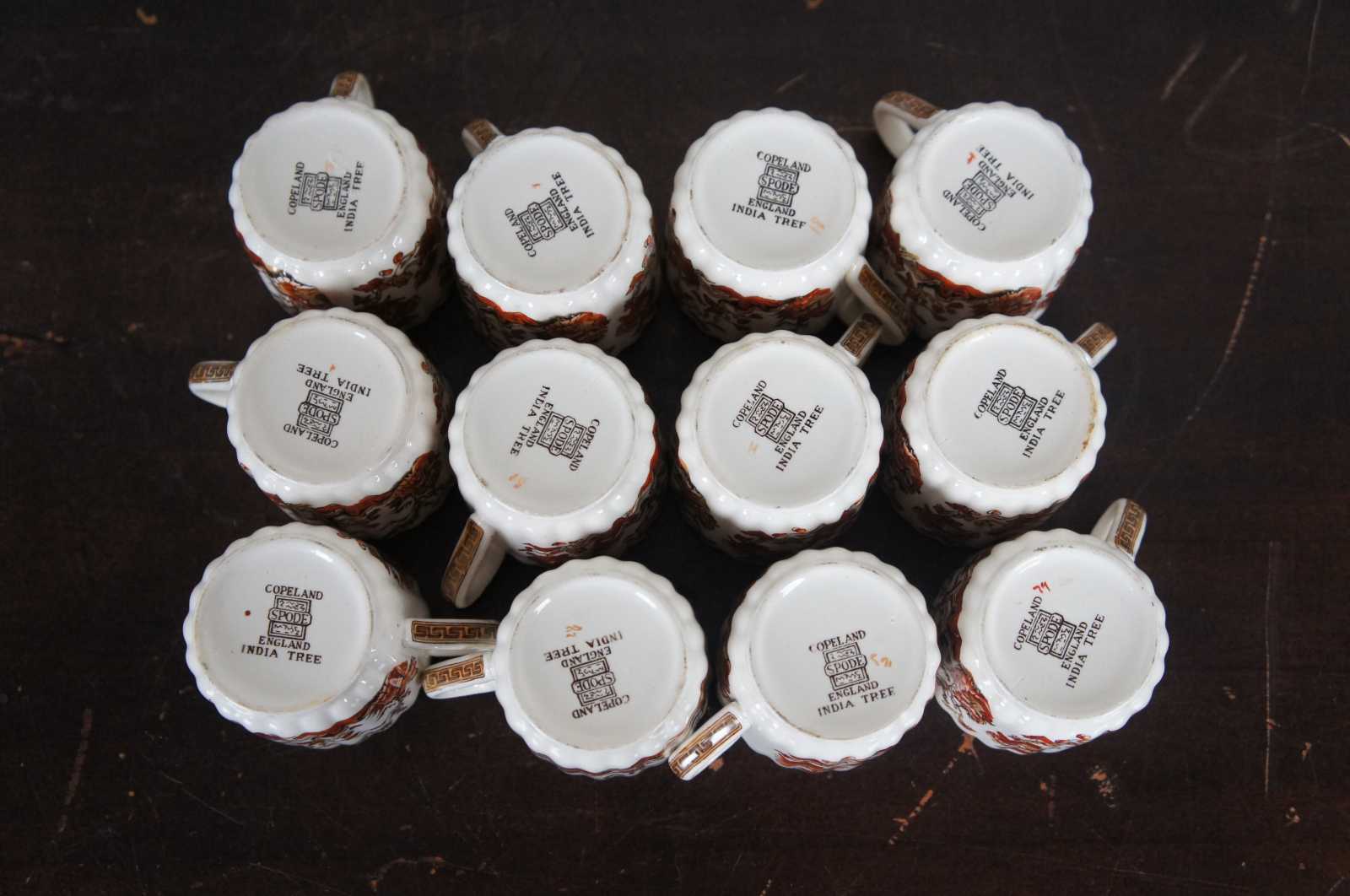 Set of twelve vintage Copeland Spode demitasse coffee cups in the India Tree pattern, featuring red-orange floral branches and Greek key accents.