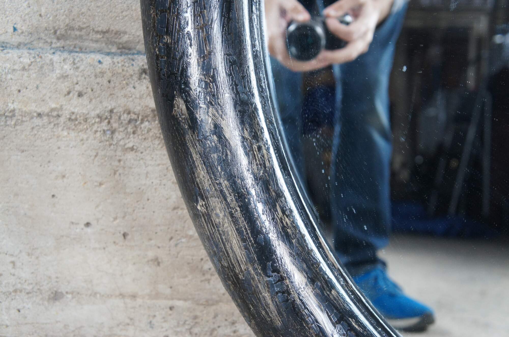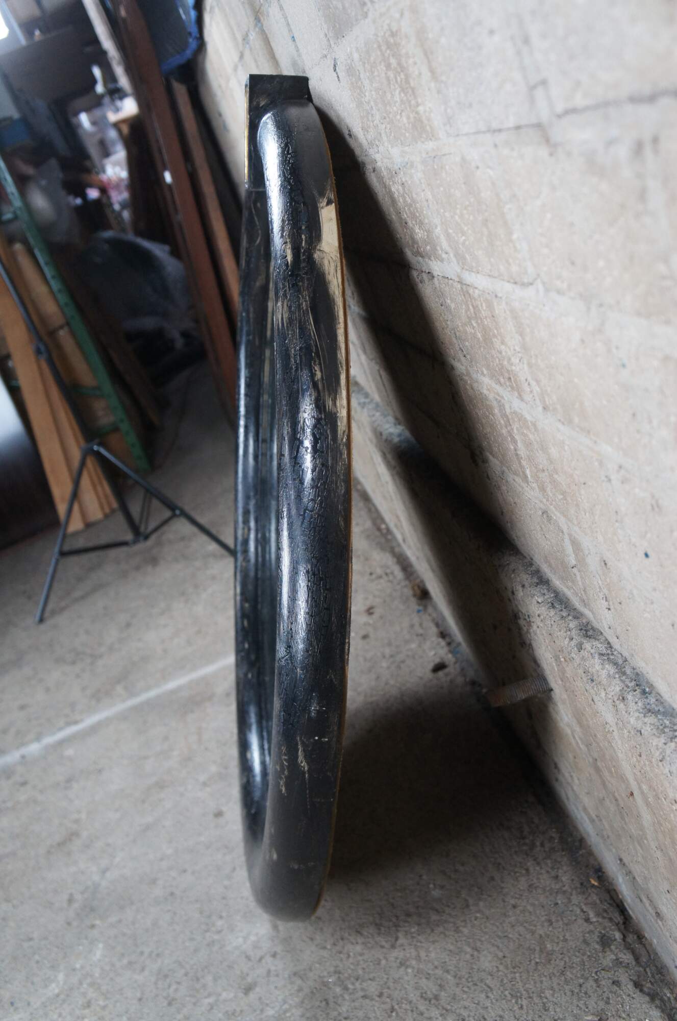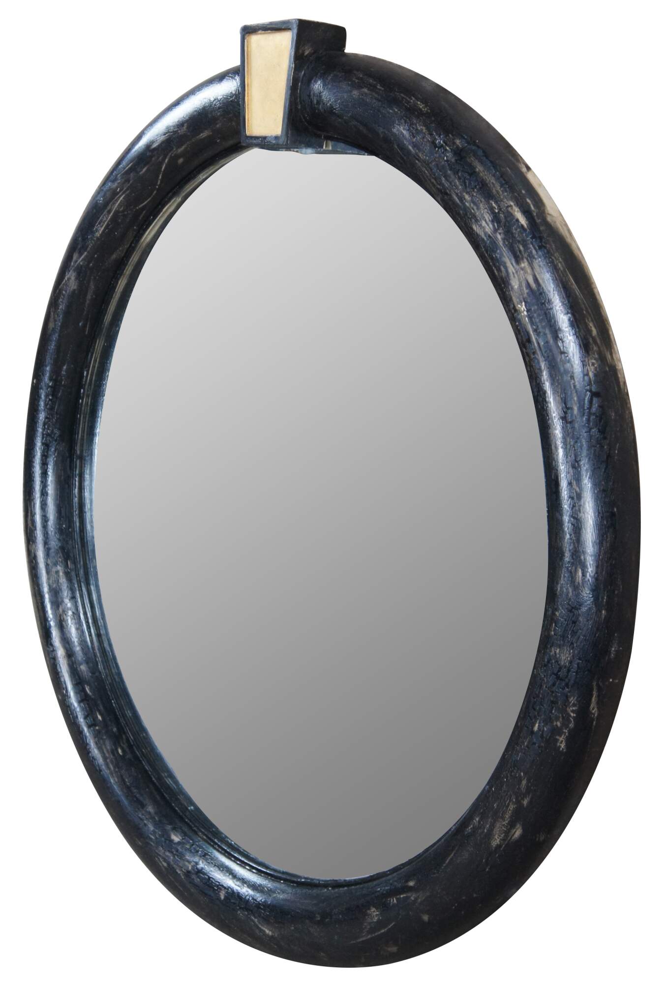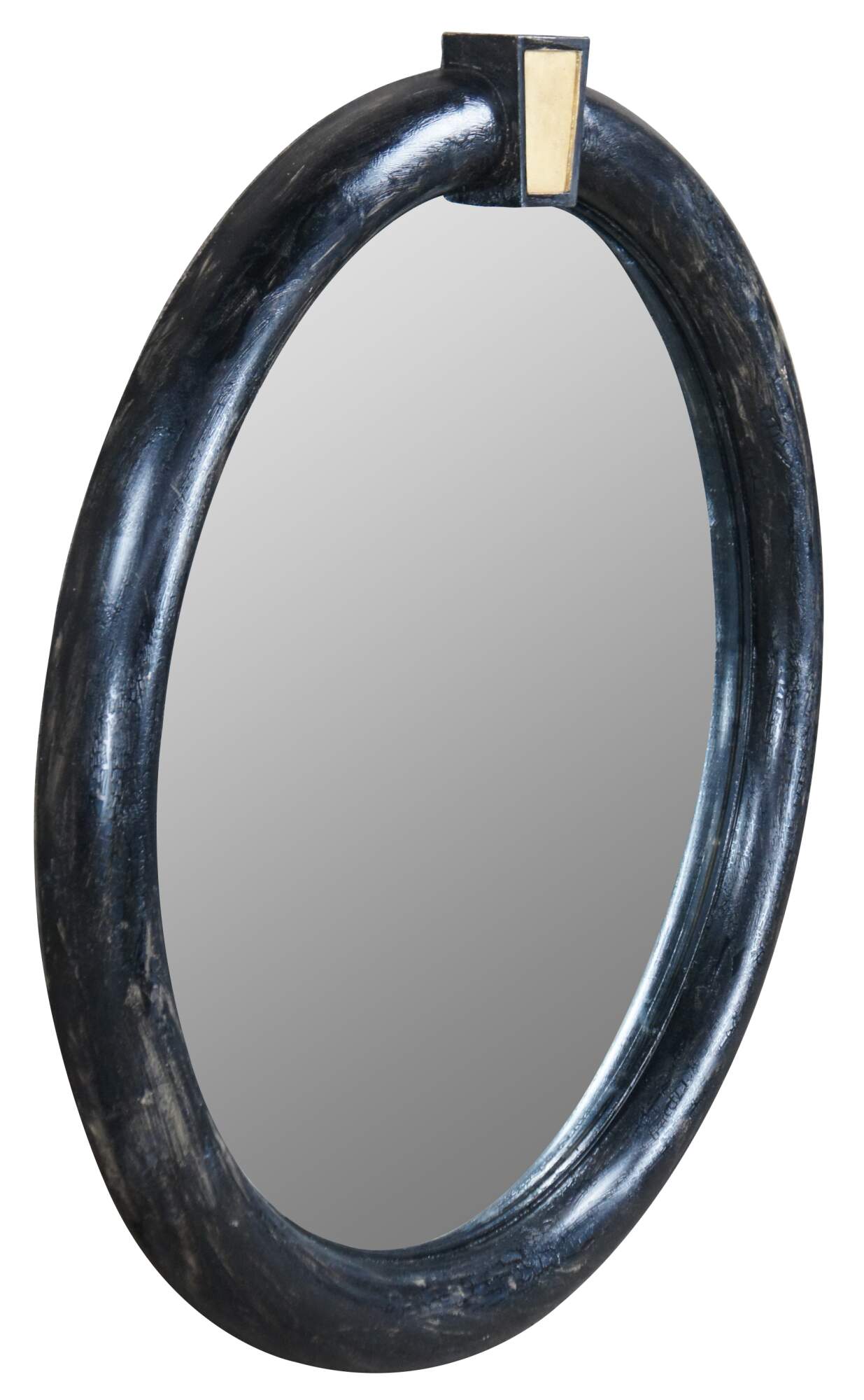 Late 20th century round wall hanging mirror. Finished in a distressed black with gold undertones