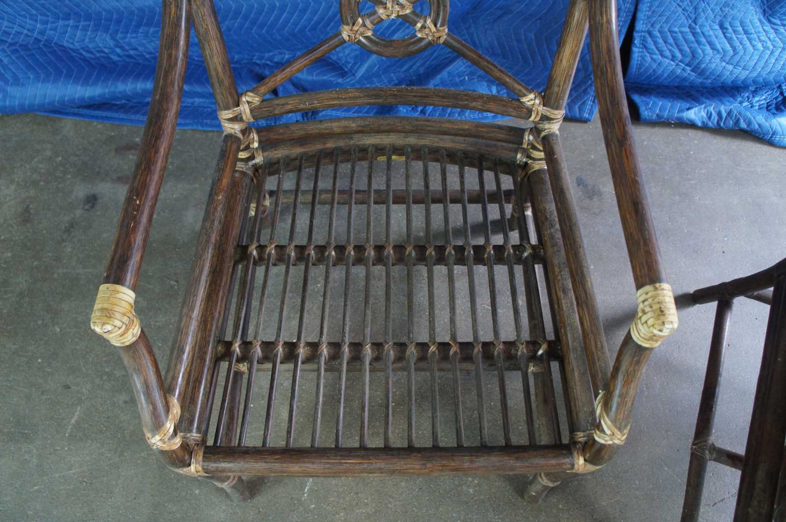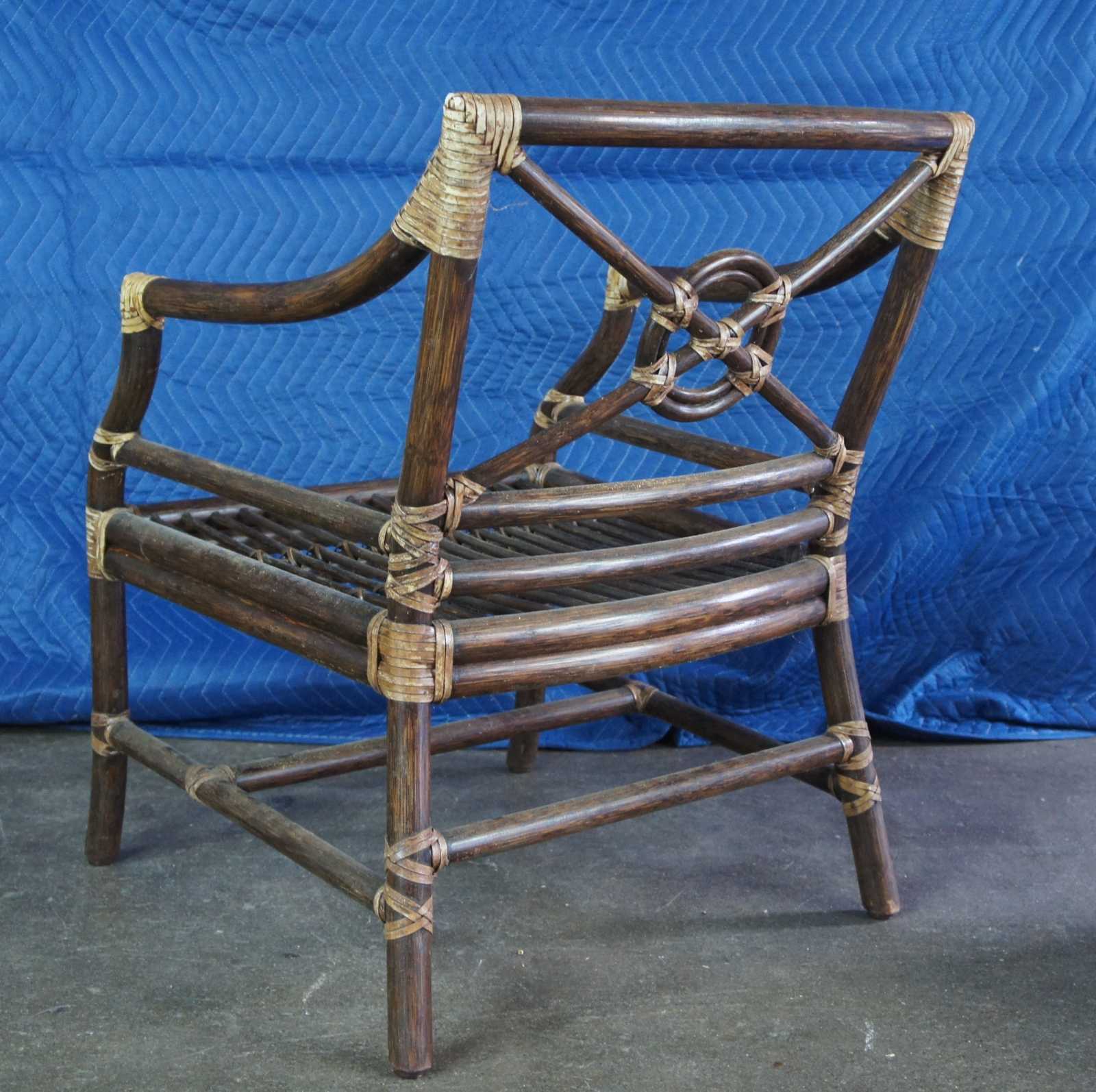Pair of 1970s McGuire Target Back or Bullseye lounge armchairs. Made of bamboo and rattan featuring a sloped arm and pierced target back. This particular chair model is always highly coveted by McGuire enthusiasts.