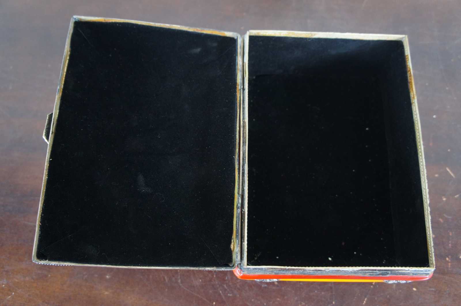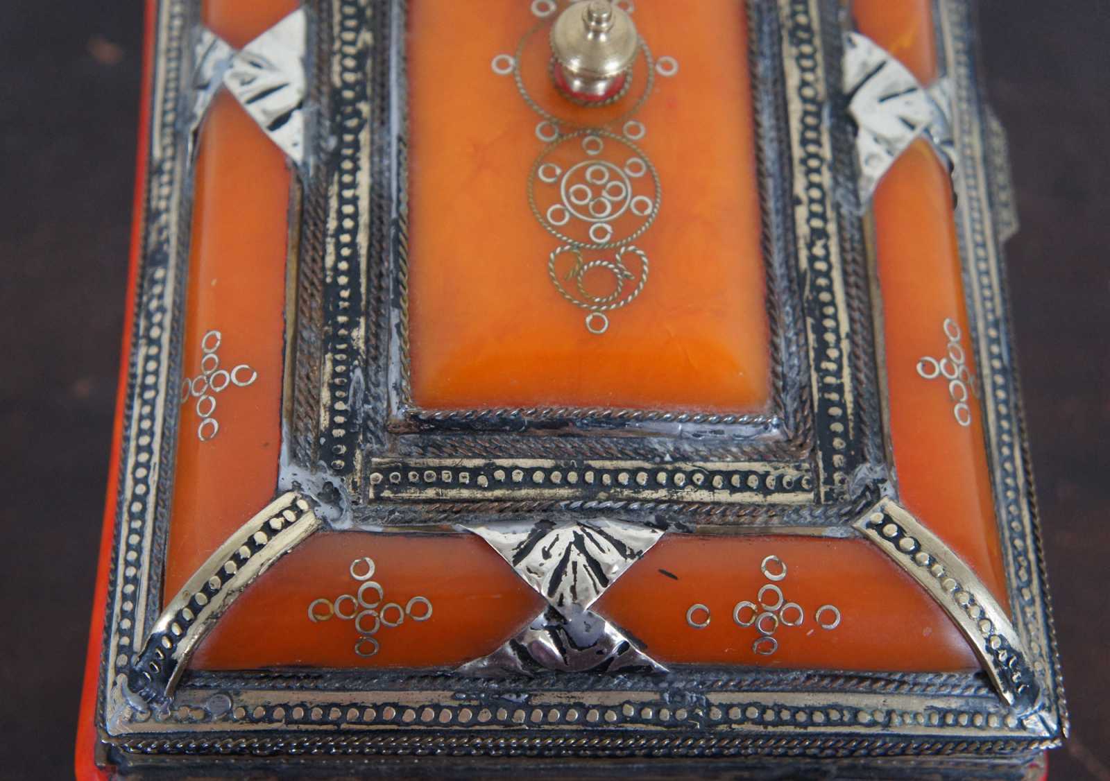 Antique red / amber and orange / butterscotch, and silver bakelite jewelry / trinket casket featuring stamped silver overlay, black velvet lining and footed base.