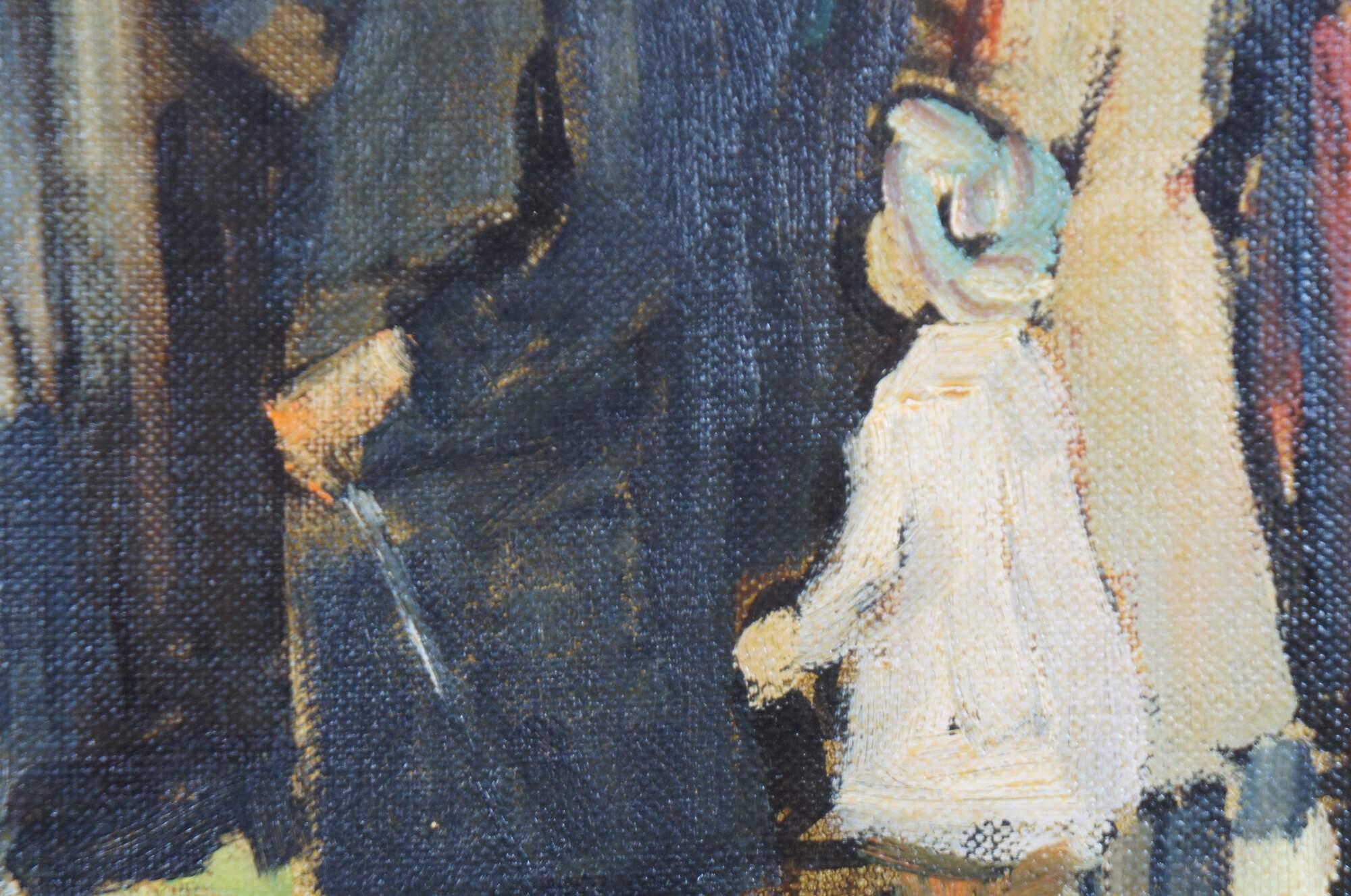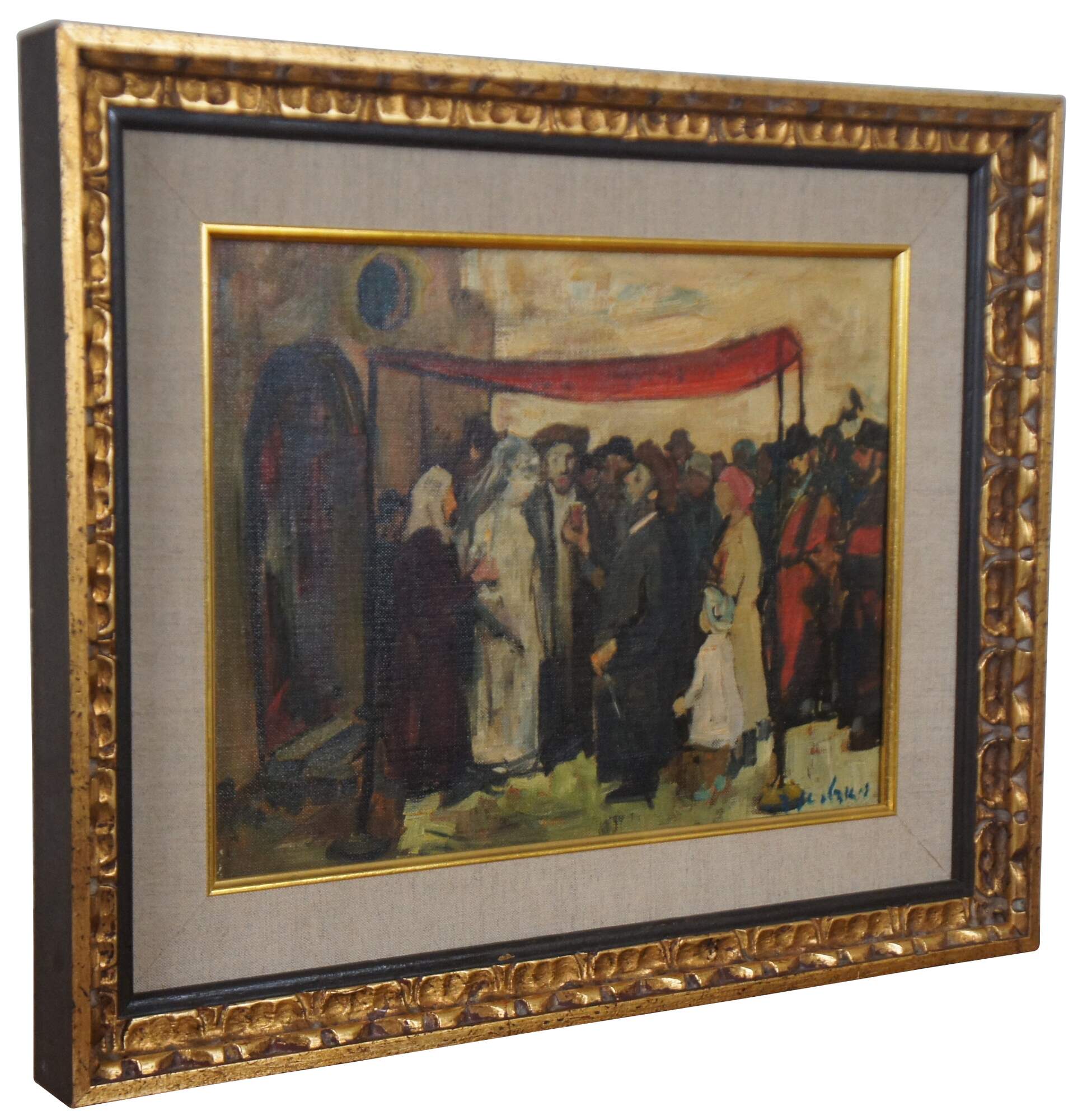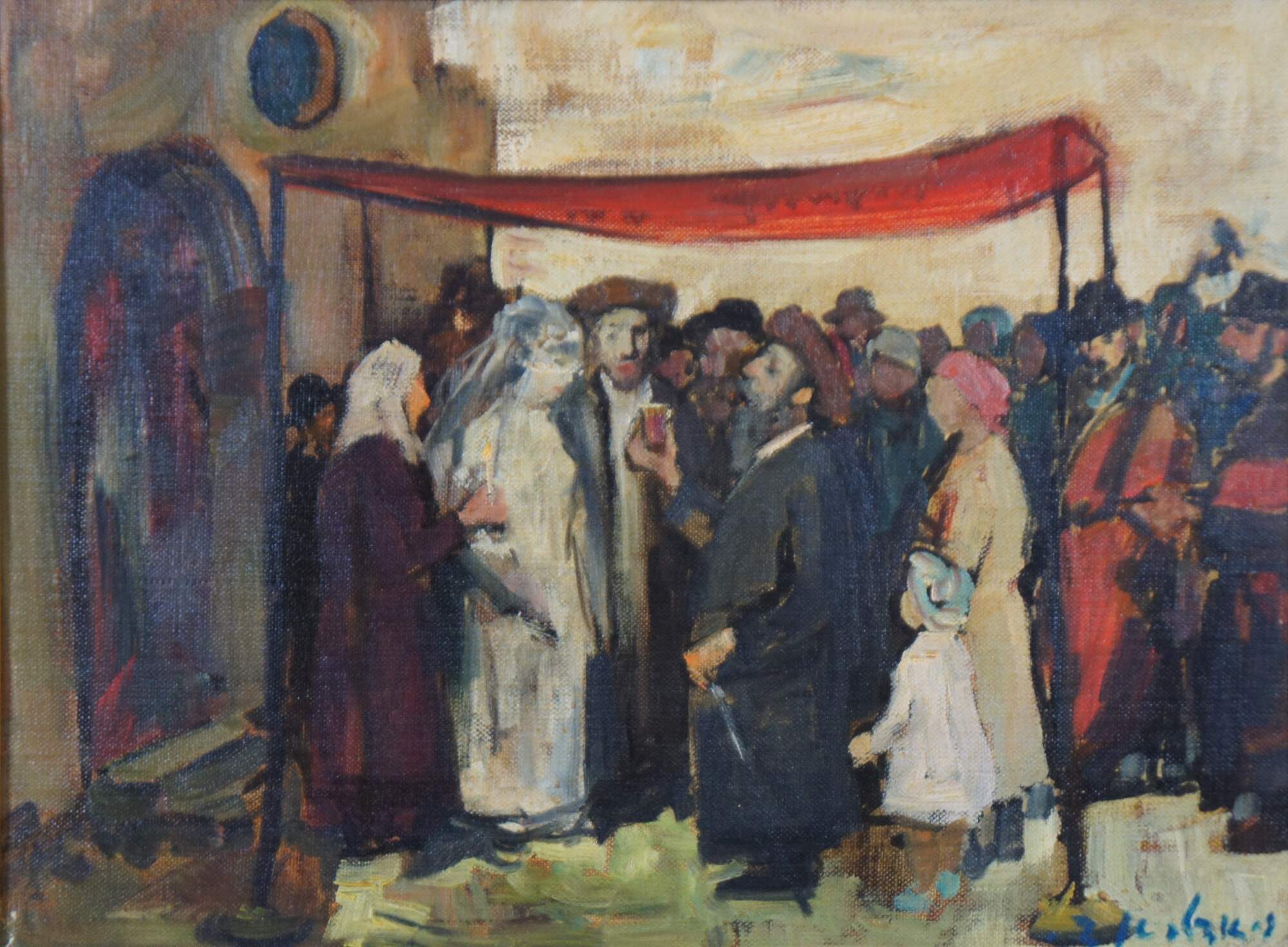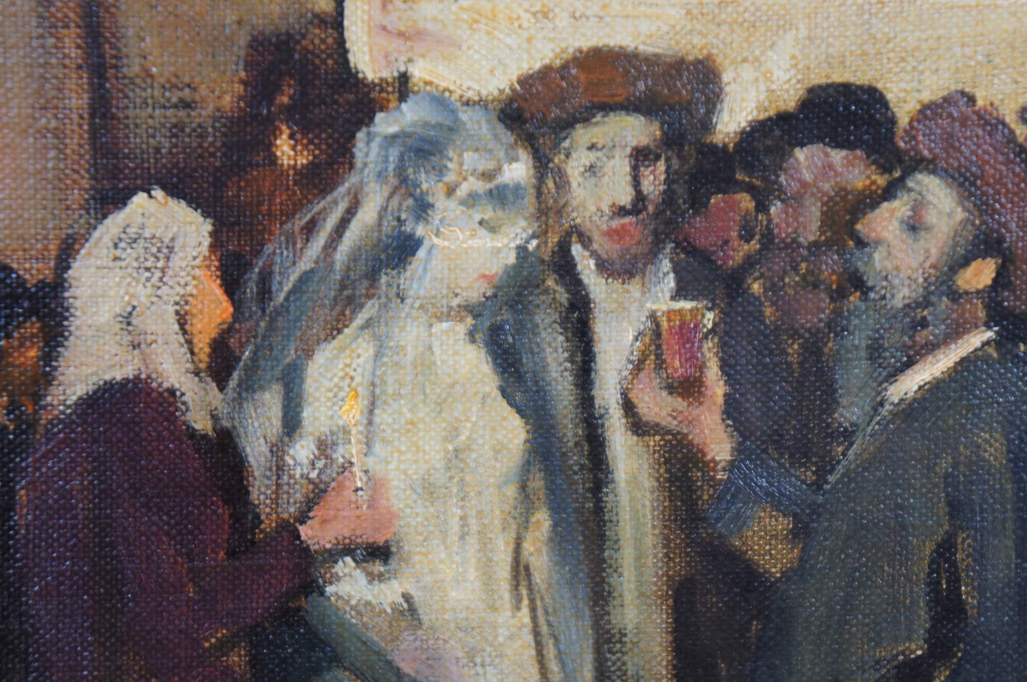 Vintage oil on canvas painting by Adolf (Adi) Adler showing a Jewish wedding scene with Chuppah and Rabbis.