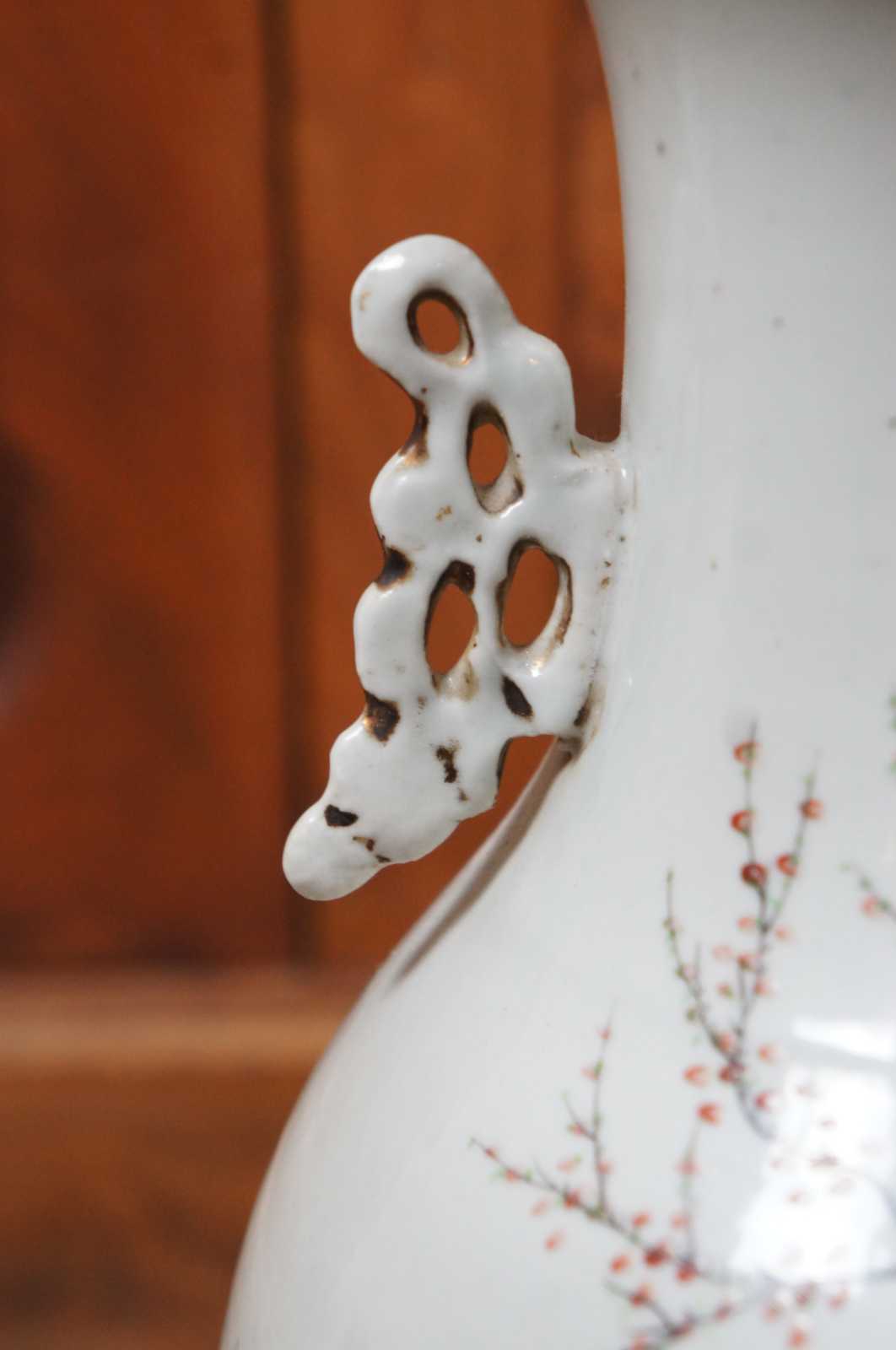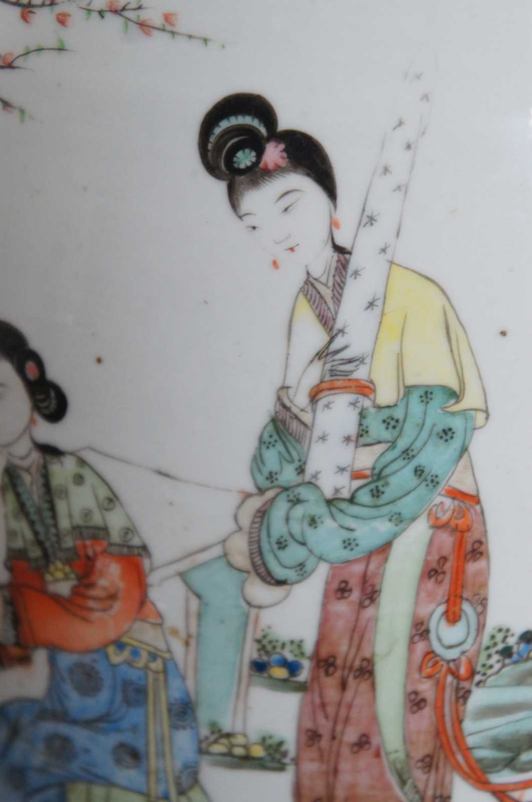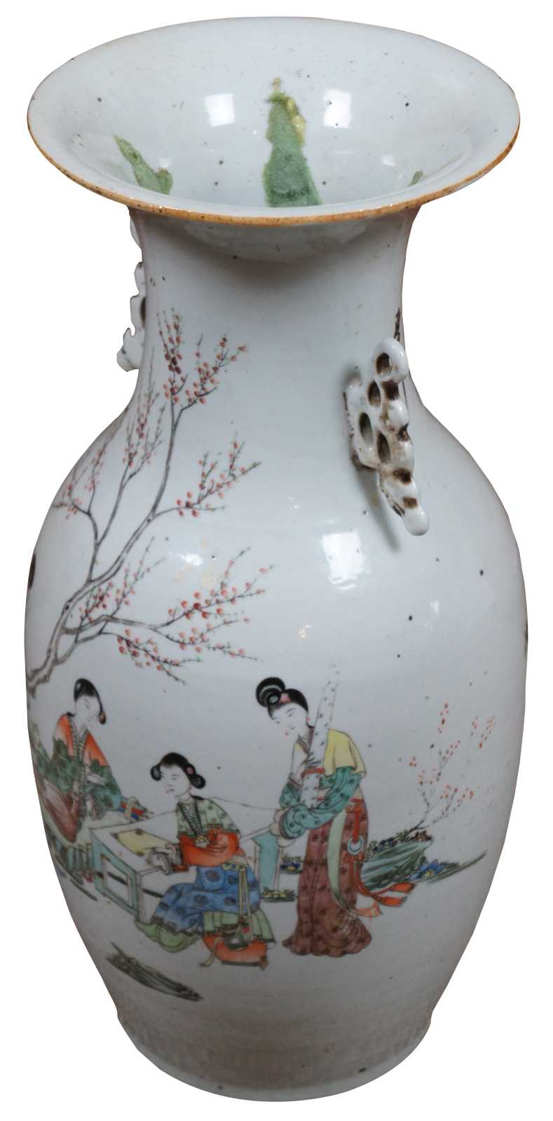 An impressive Antique 19th century Chinese polychrome floor vase with double handles, a scene of geisha figures seated in a garden, and calligraphy on the back.