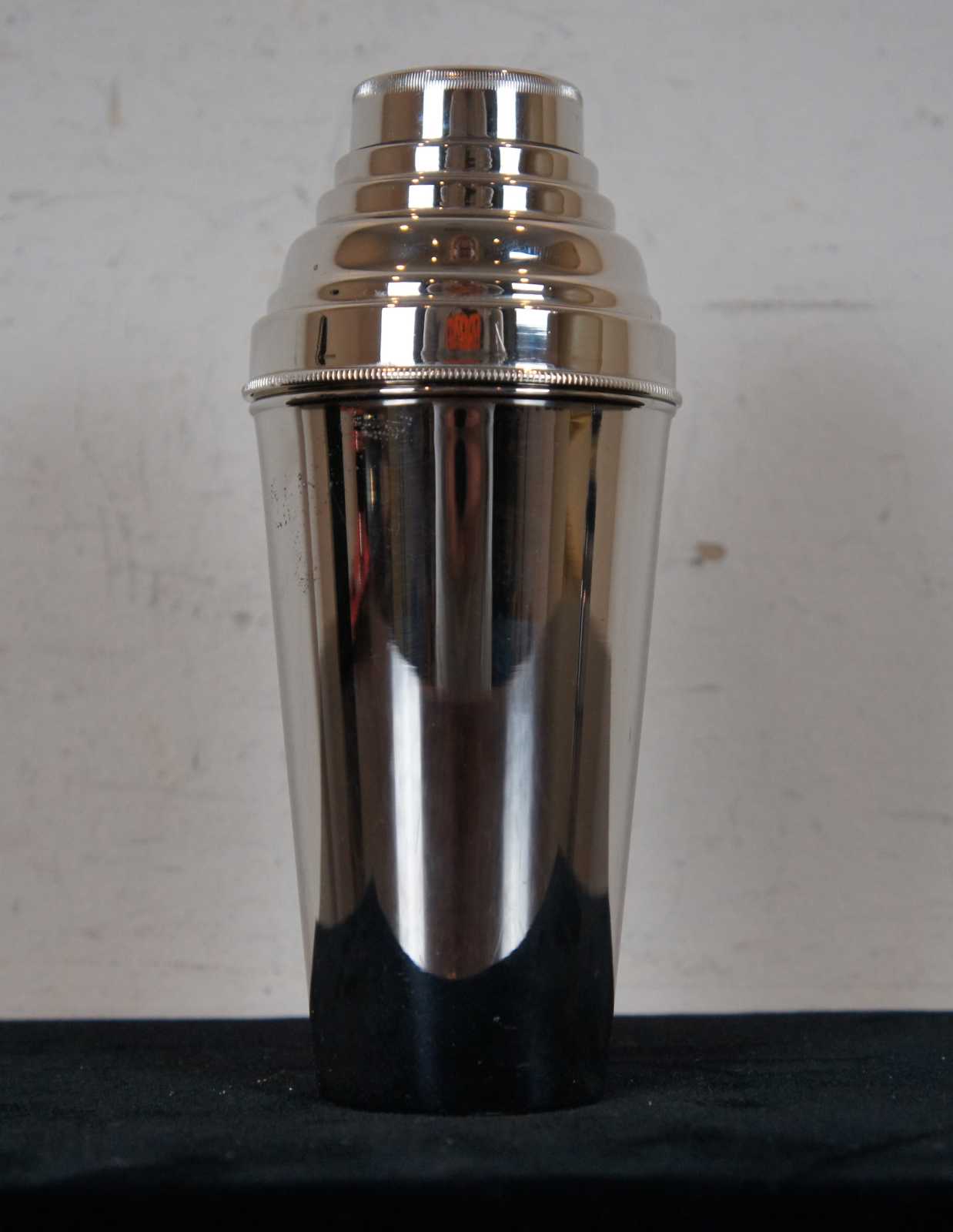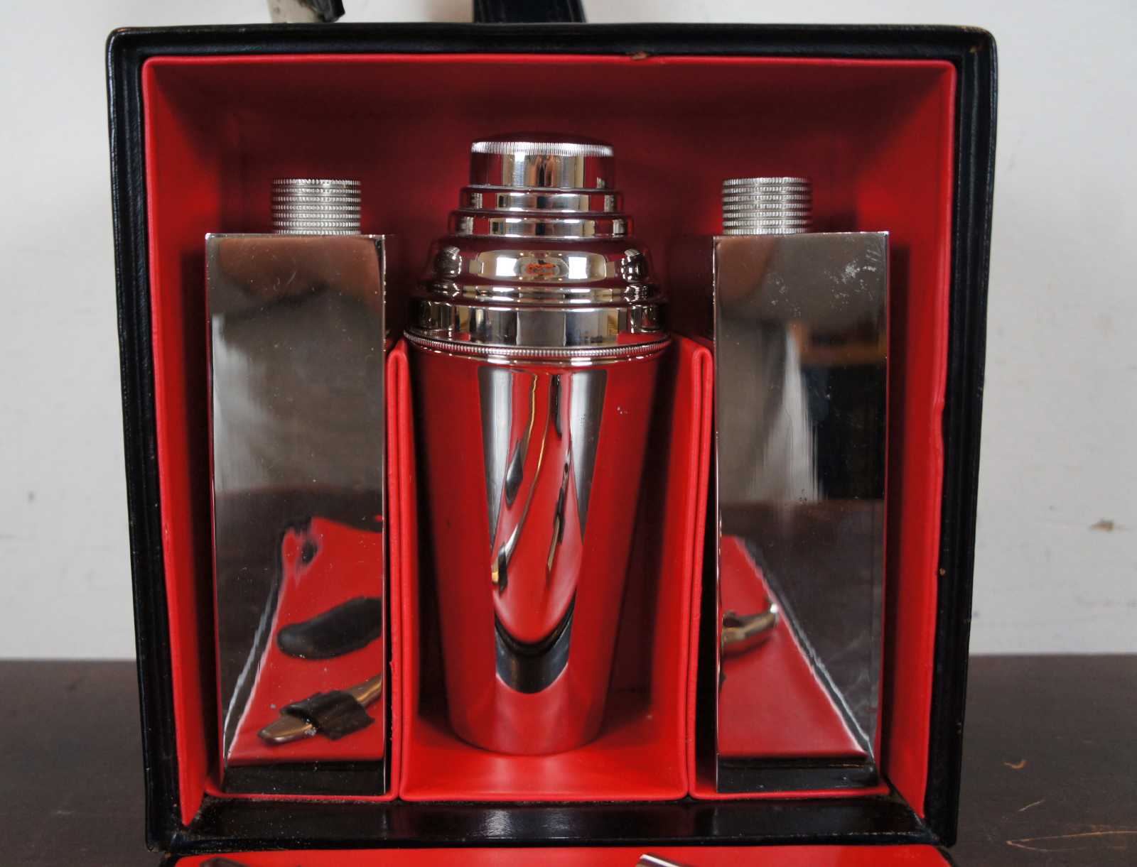 Mid century Rostfrei German travel bar set in a black leather case; includes two flasks with nested shot glasses, bottle opener, stirring spoon, bar knife, and shaker.