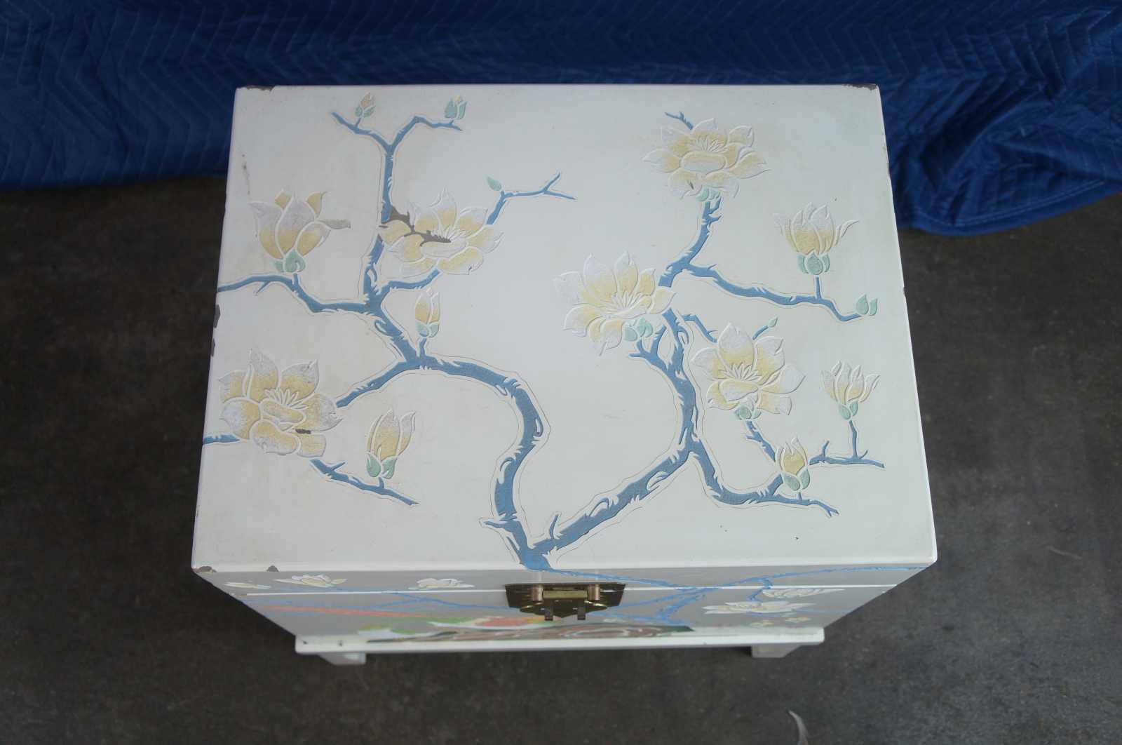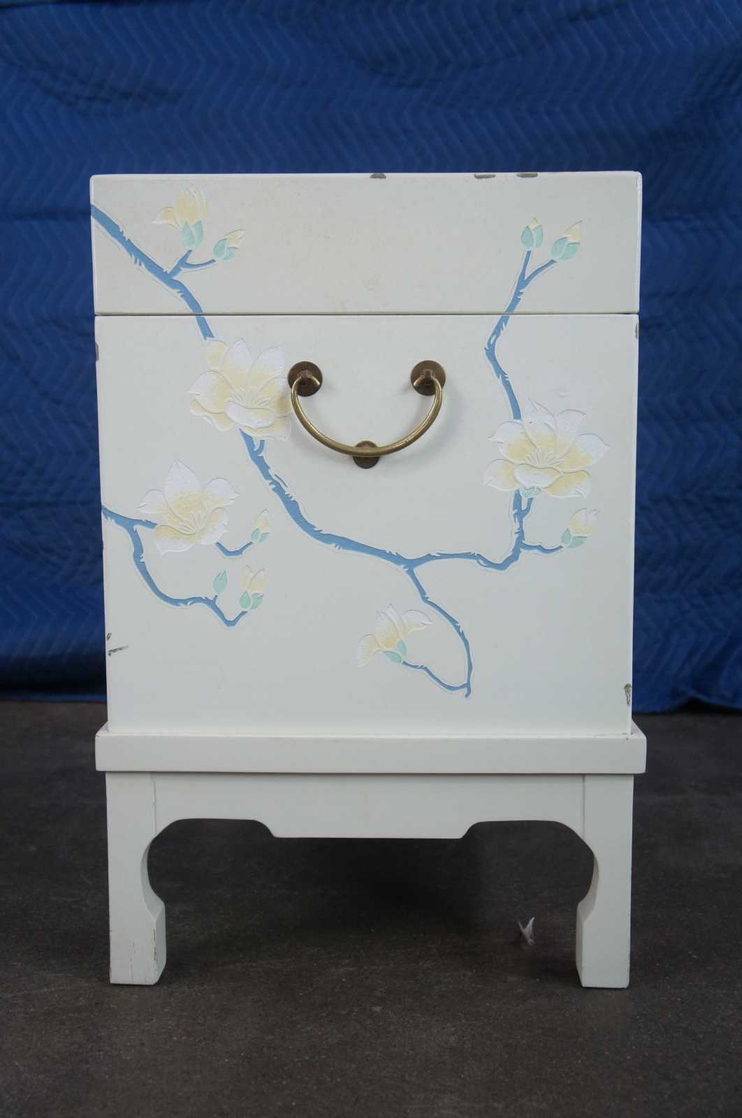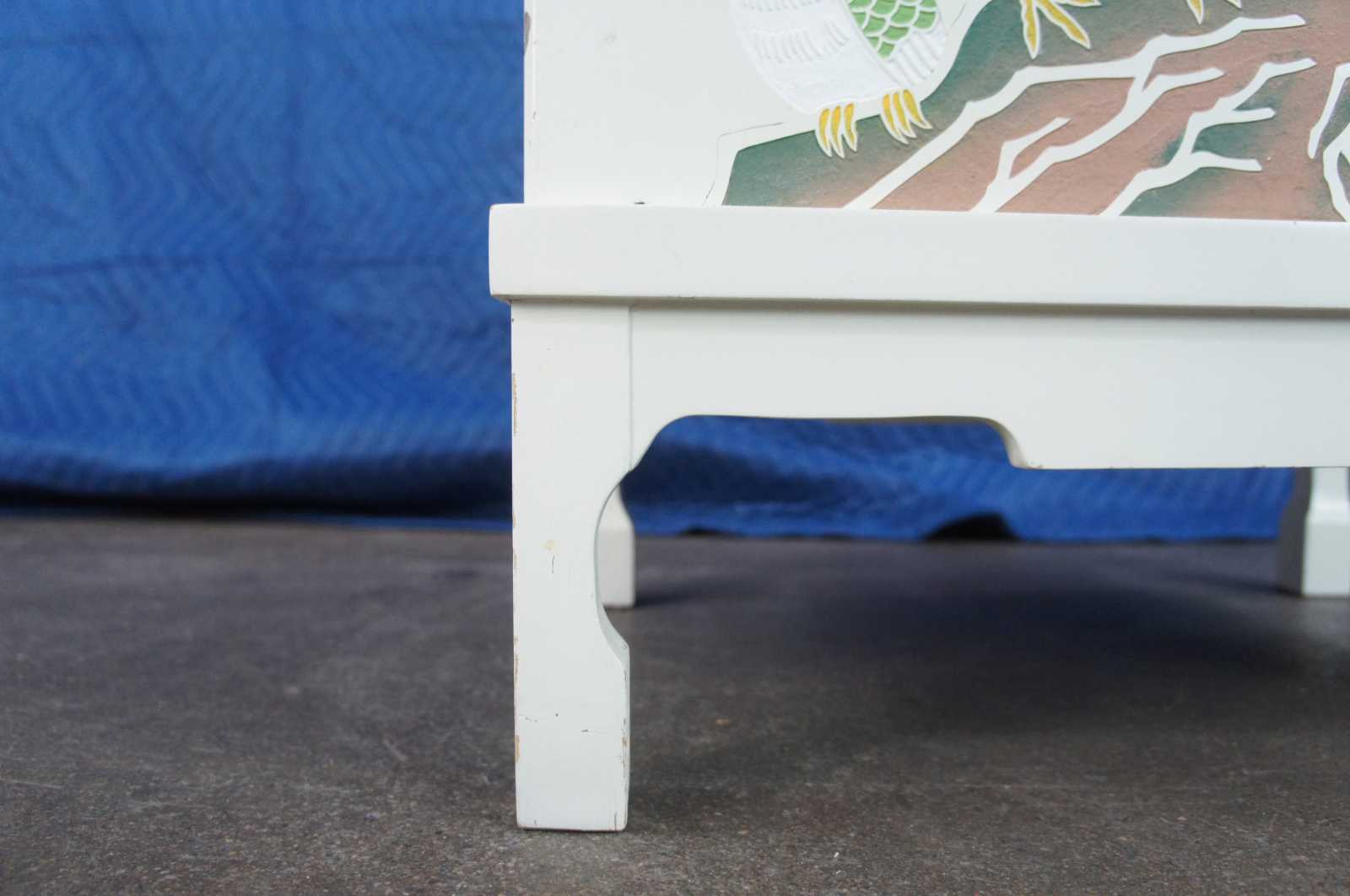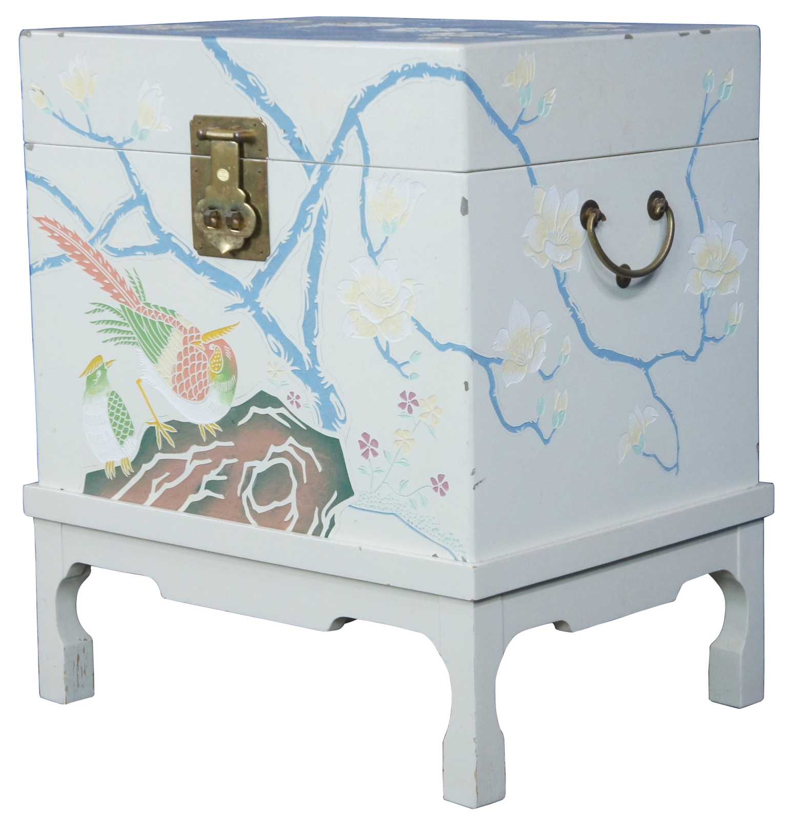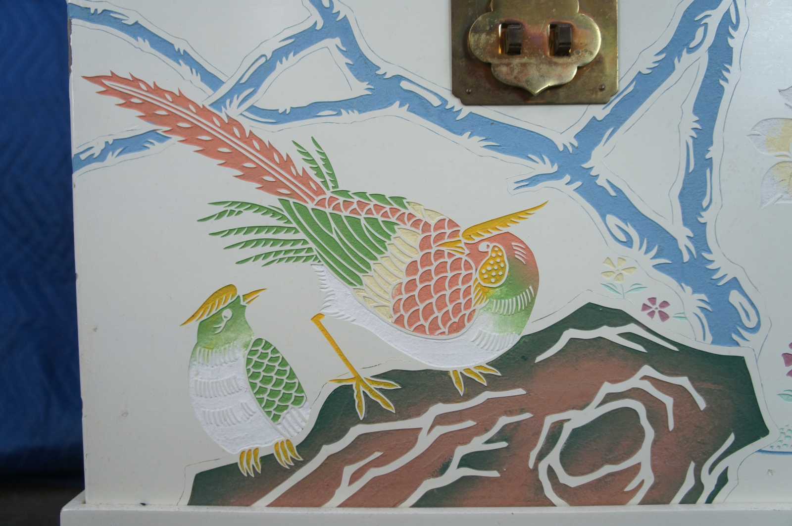 Mid Century keepsake box, chest or side table on stand. White Lacquer with low relief painted bird motif and brass hardware. Made in Hong Kong.