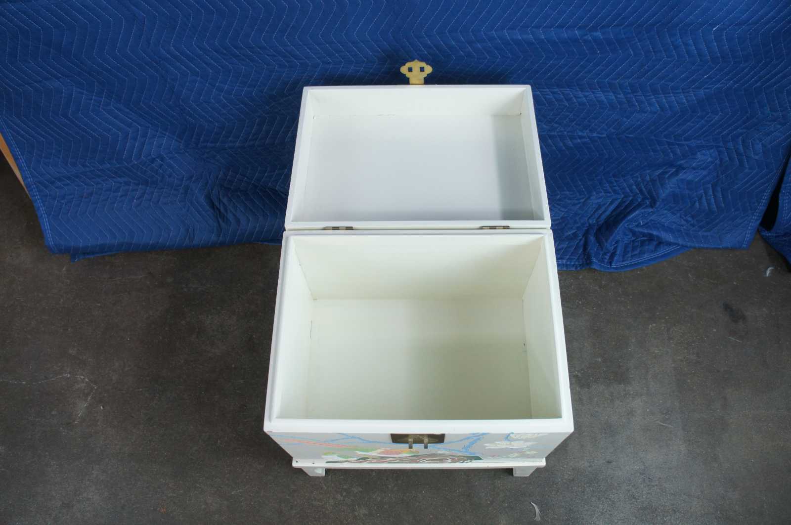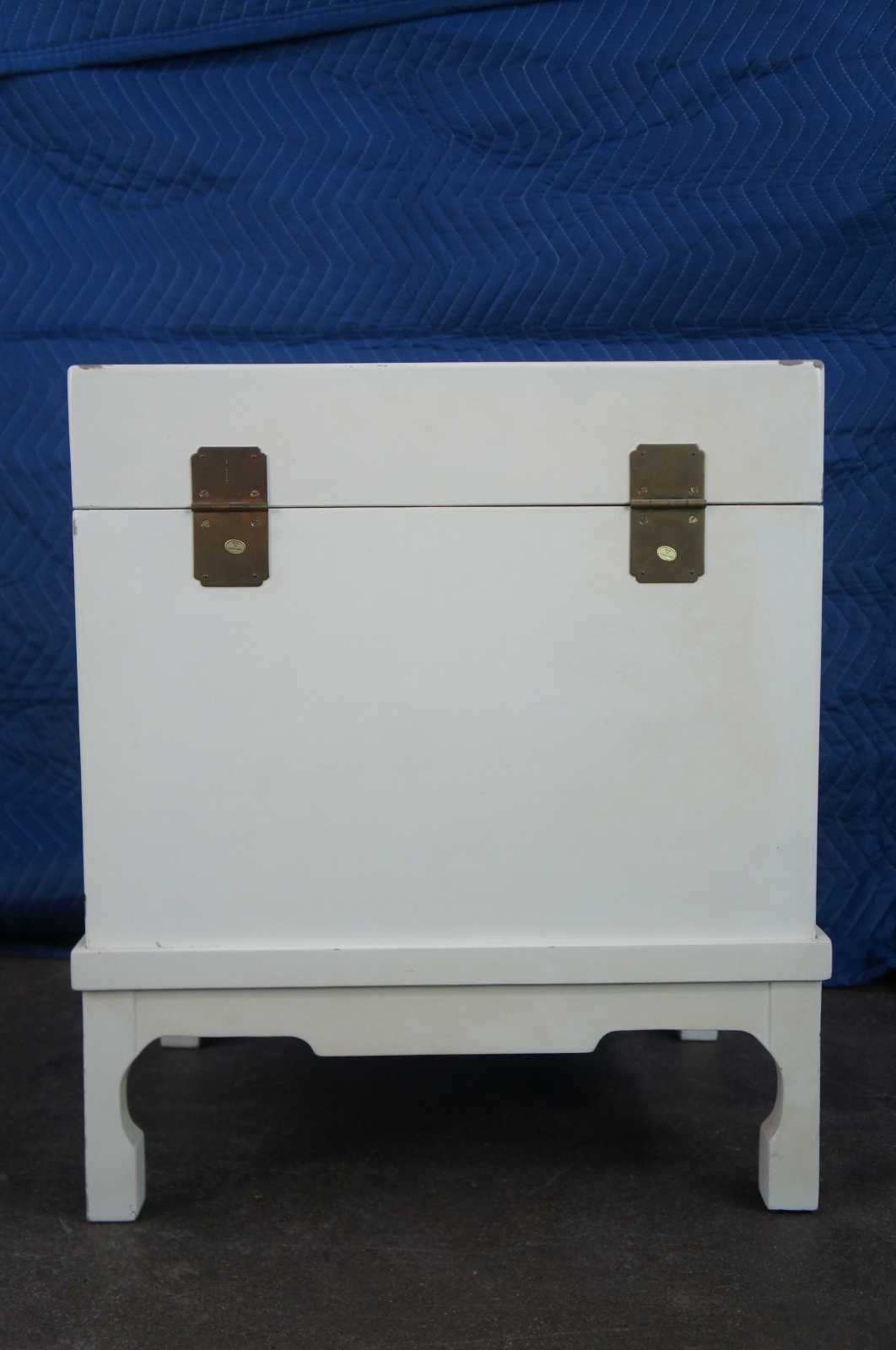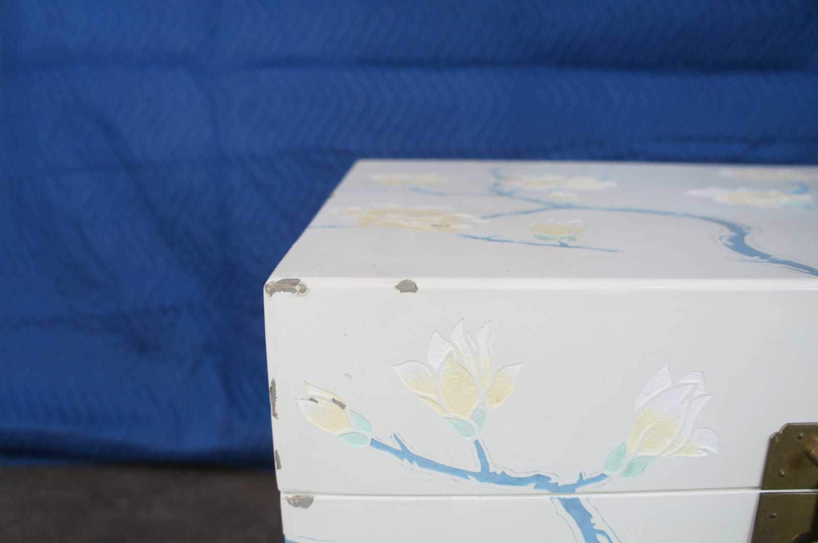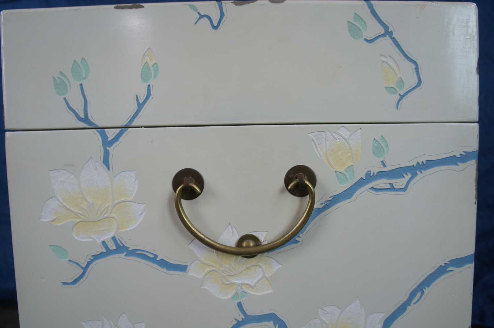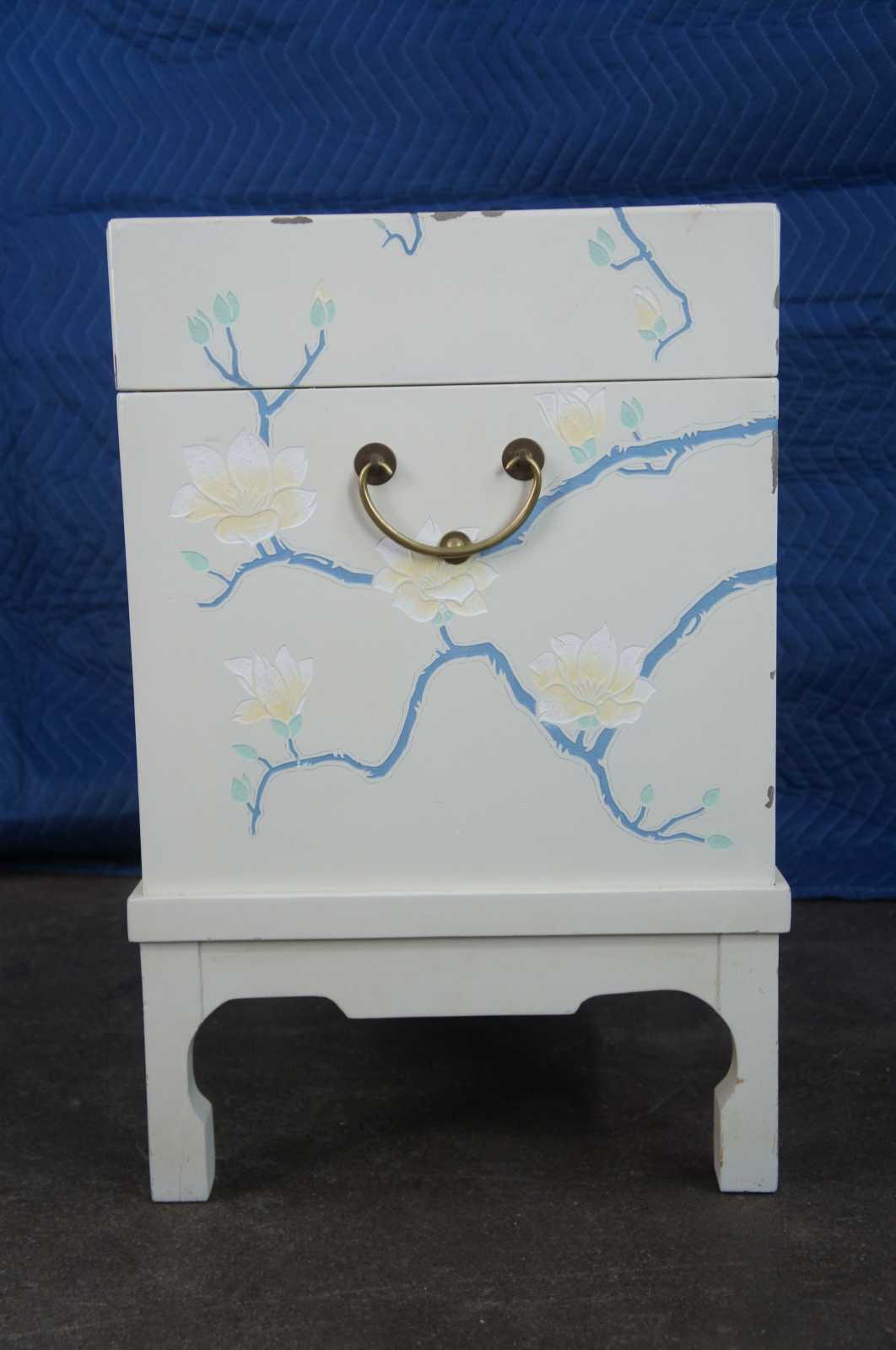 Mid Century keepsake box, chest or side table on stand. White Lacquer with low relief painted bird motif and brass hardware. Made in Hong Kong.