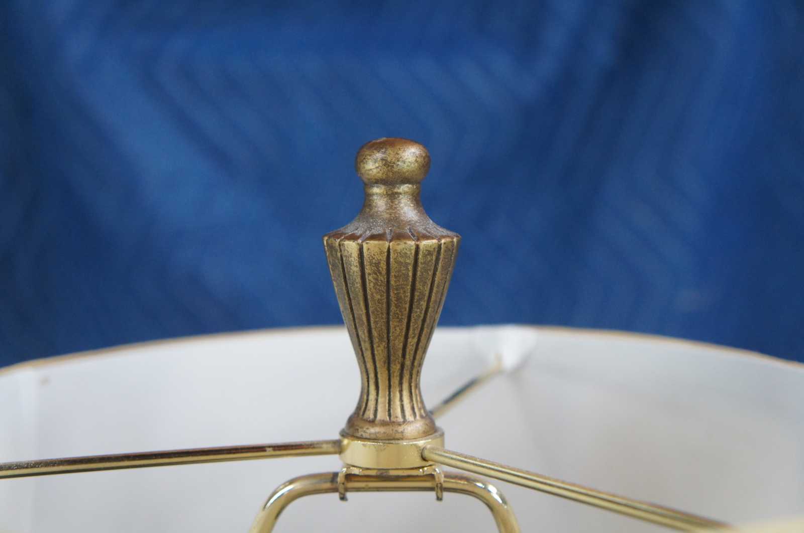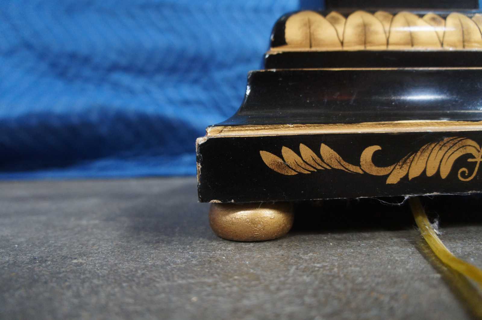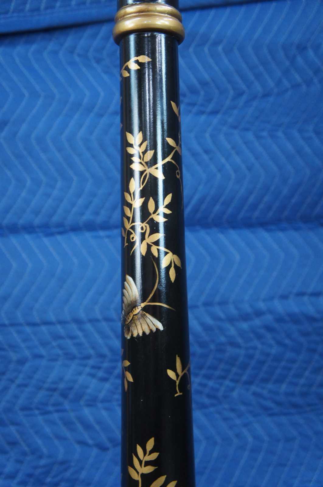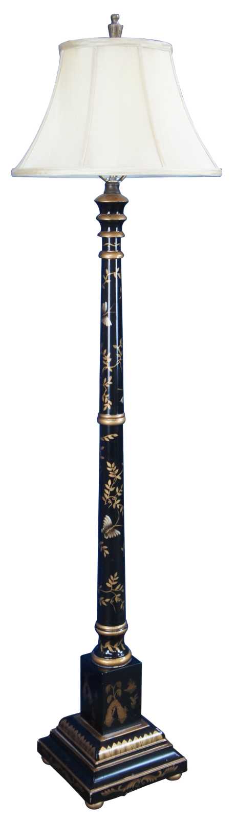 Vintage Chinese floor lamp featuring black lacquered design with gold detail showing a landscape of islands with floral accents and butterfly.
