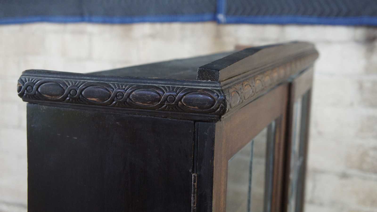 Antique English leaded glass curio cabinet or bookcase featuring Queen Anne styling with a rose or flower slag glass insert and cabriole legs.