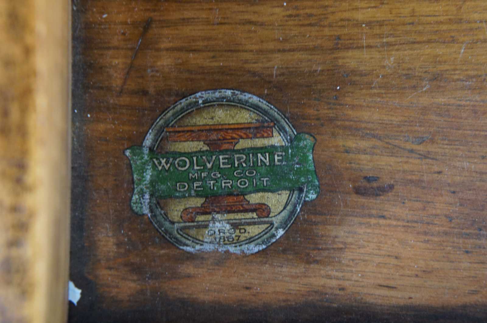 The Wolverine Manufacturing Co. of Detroit Michigan made reproduction style and Arts and Crafts furniture from the late 1880s through the early 1900s. The company specialized in tables, pedestals, phone and plant stands, tabourettes, and cabinets for parlors and libraries.