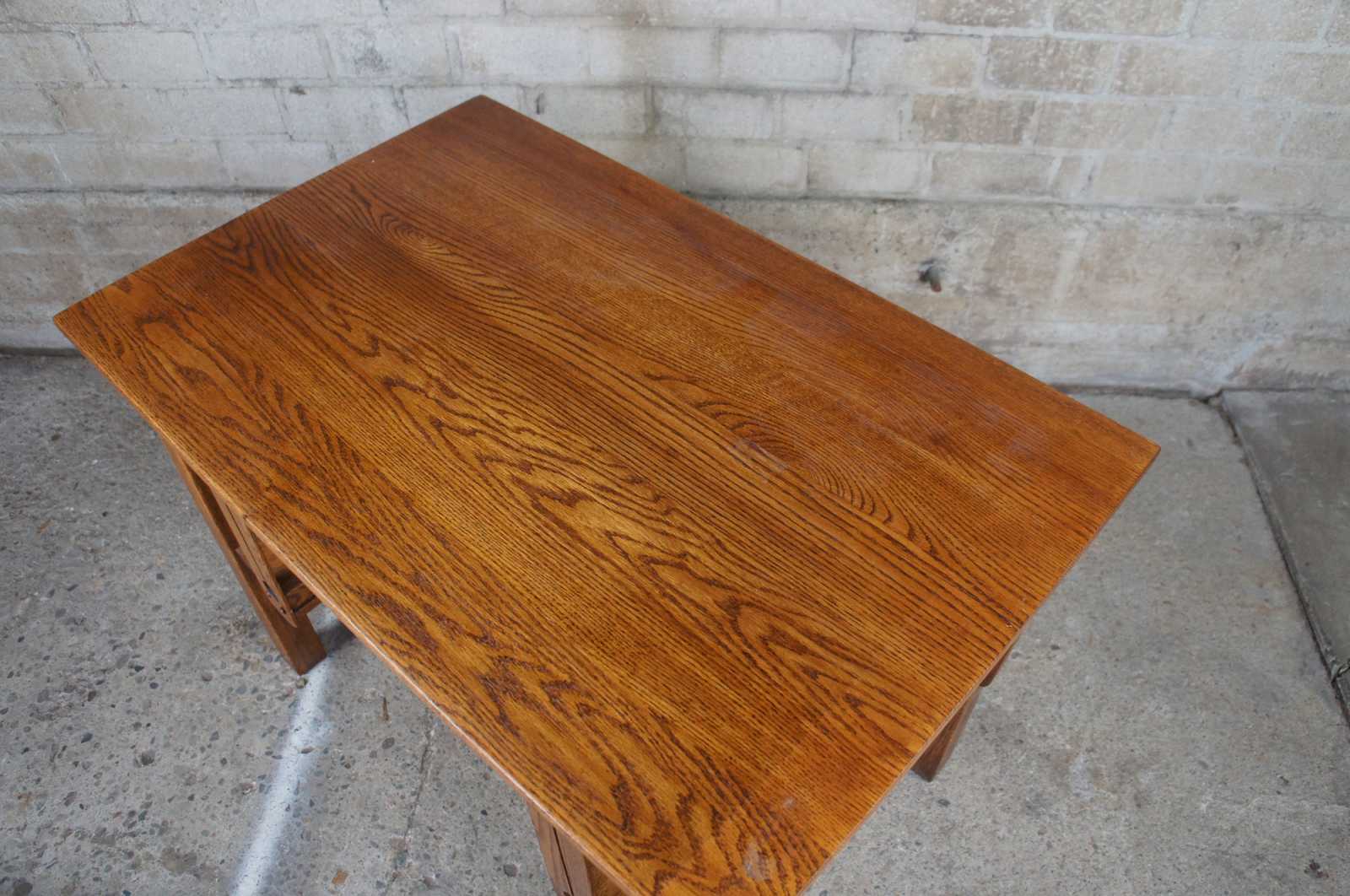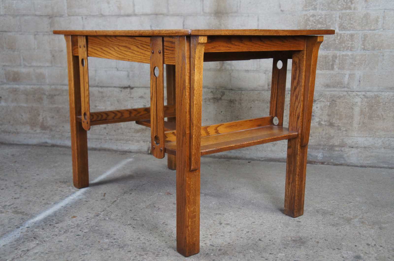 Antique Wolverine Mfg Co arts and crafts library table or desk. Made of quartersawn oak featuring mission styling with bookcases on each side and one storage drawer.