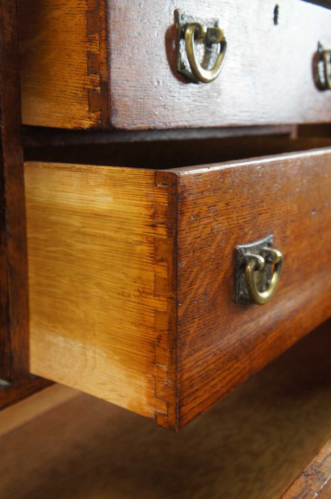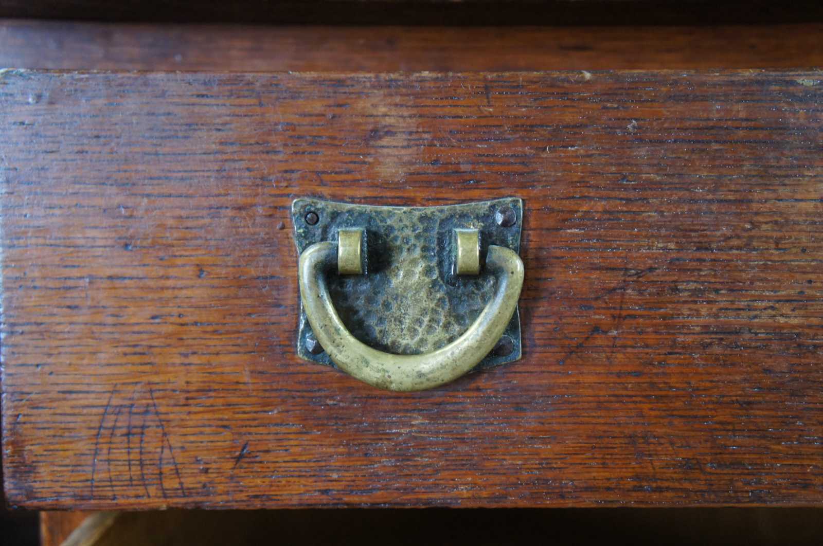 Early 20th Century Stickley Brothers Quaint Furniture sideboard. Made from quartersawn oak with two centally located drawers flanked by outer cabinets and large lower drawer. Includes hammered rustic brass hardware and a serpentine backsplash. Brass plaque nailed into backing, marked Quaint Furniture Stickley Bros. Co. Grand Rapids Michigan. The brass plaque was introduced by the Stickley Bros in 1902.