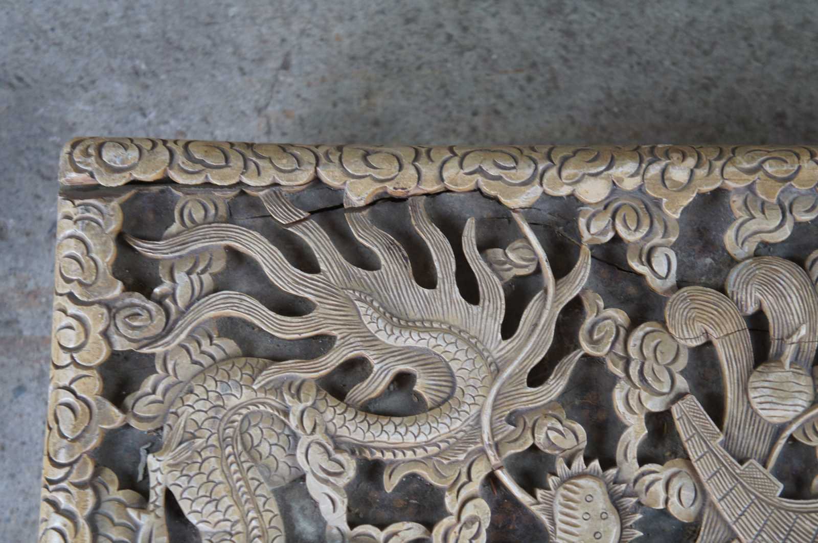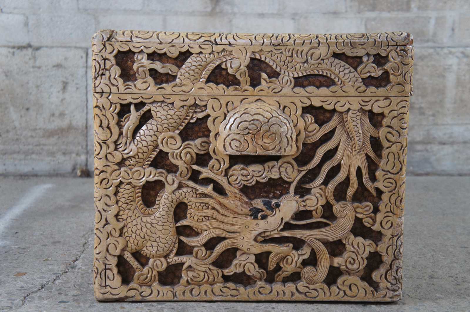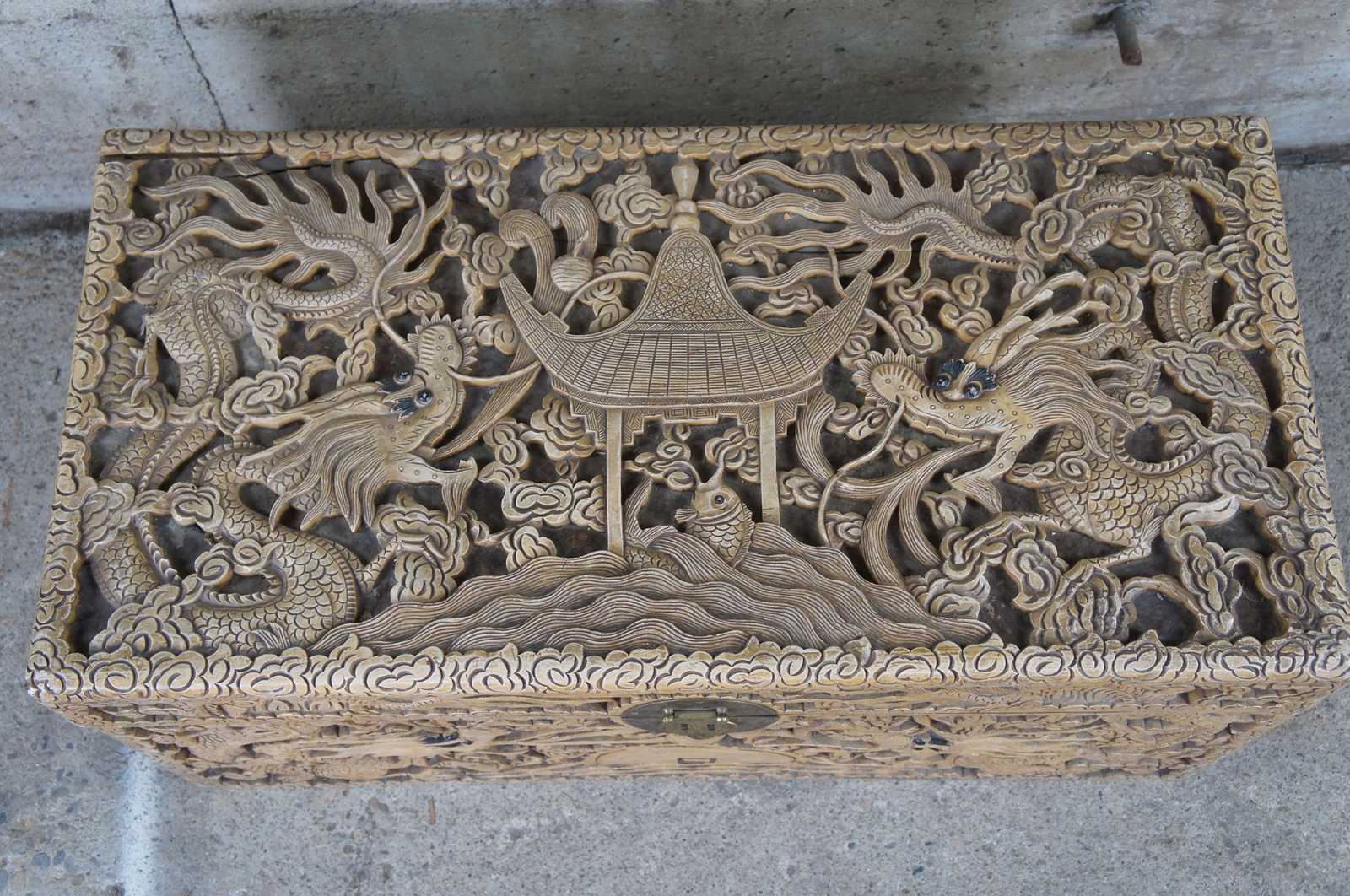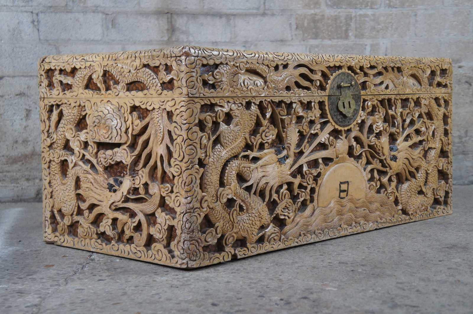 An exceptional and rare early 20th century camphor wood chest. Profusely carved in high relief sculpting with fire breathing dragons amidst a field of clouds waterside sunset and pagoda scene with fish. Features handles, brass center plate and paper tag along underside.