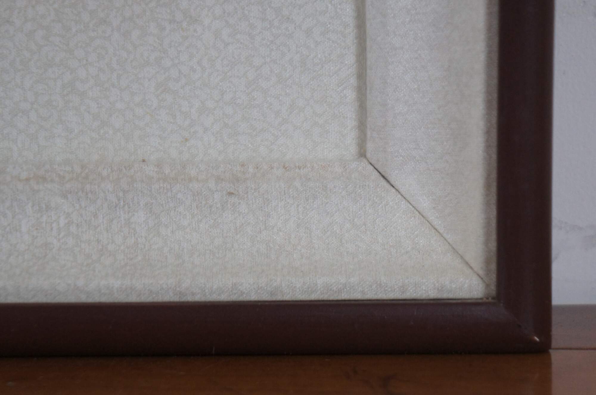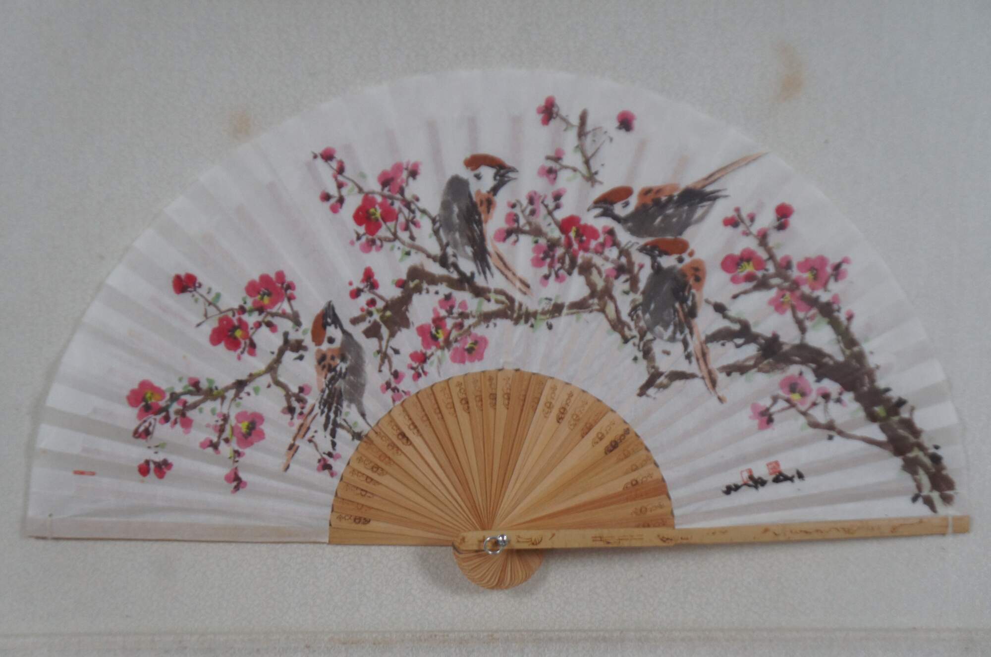 1985 Chinese Yu Tang watercolor painted hand fan featuring a design of sparrows on branches of cherry or plum blossoms, framed in a shadowbox lined with silk.