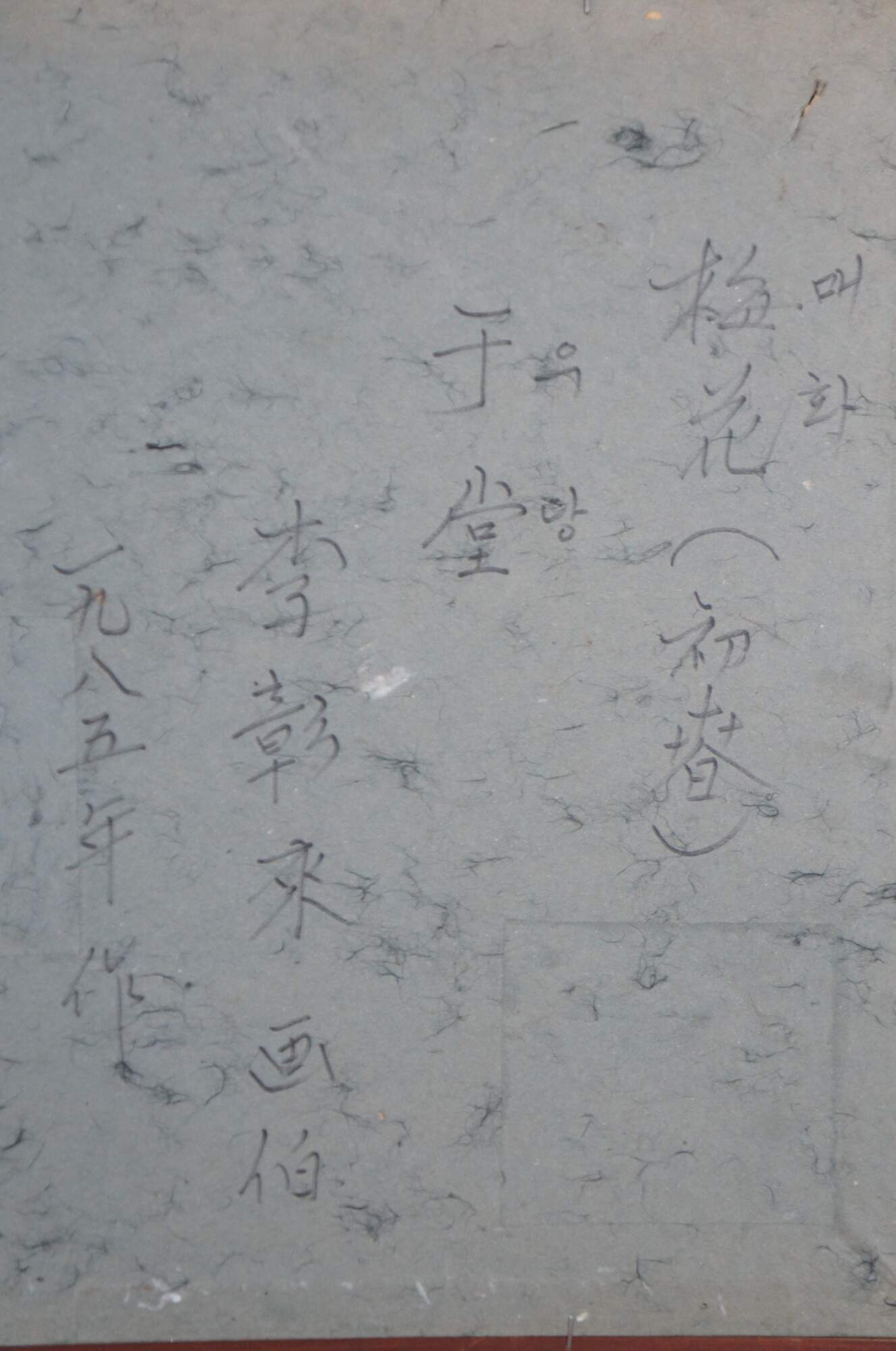 This art was made in 1985, by Yu Tang (pseudonym/esteemed name for artist Zhanglai Li) and the title is “Plum Blossom (Early Spring)”. Note: There are Korean next to (1) and (2).