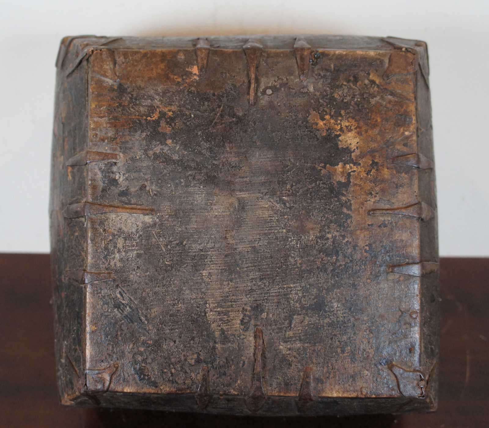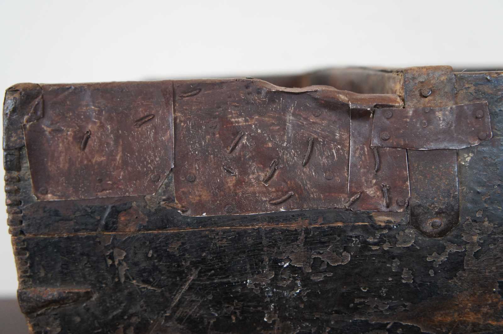 19th century Chinese wooden grain or rice measure / harvesting bucket with handle across the middle and primitive iron accents.