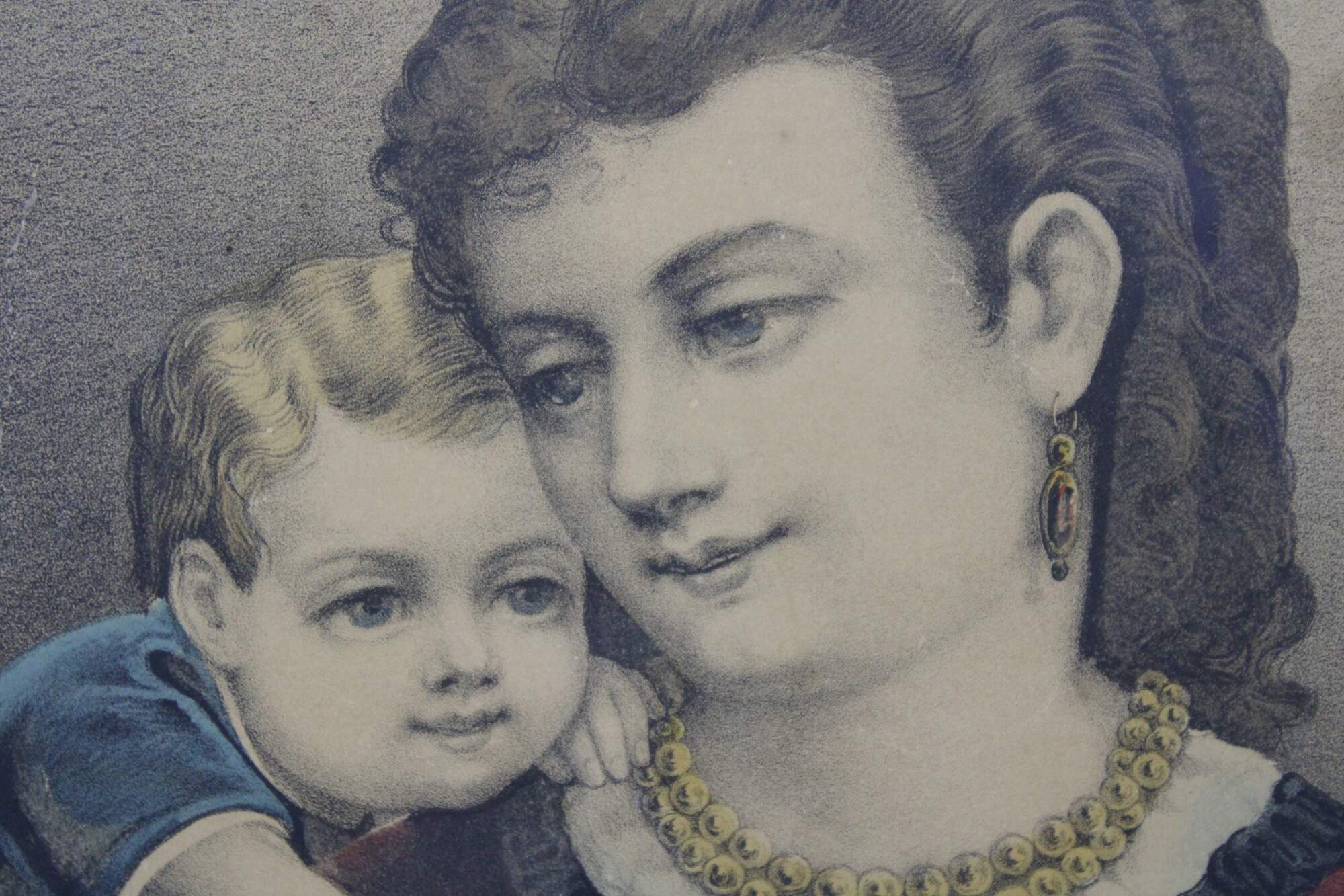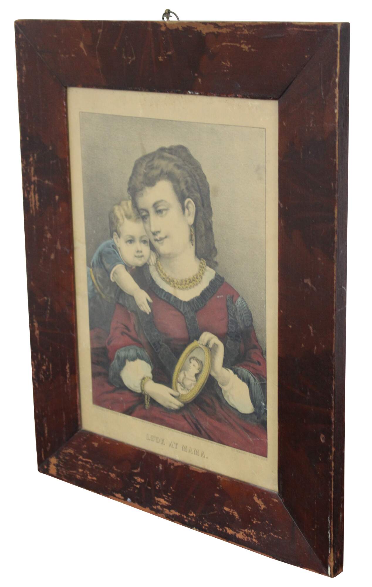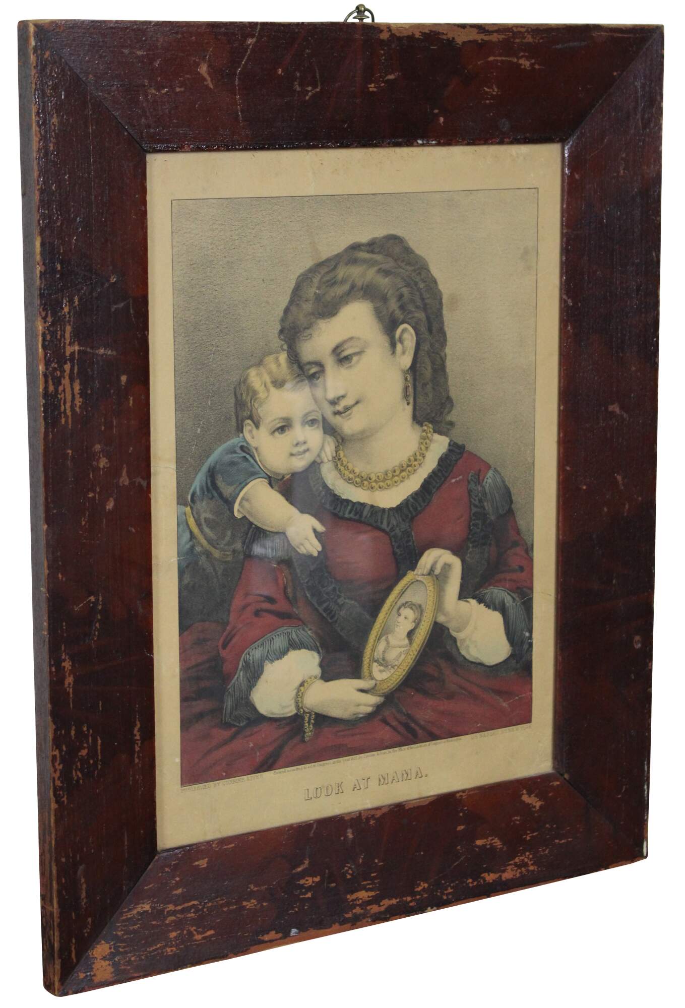 Circa 1870’s antique Currier & Ives colored lithograph print titled “Look at Mama,” featuring a mother showing a portrait of herself to an infant at her shoulder.