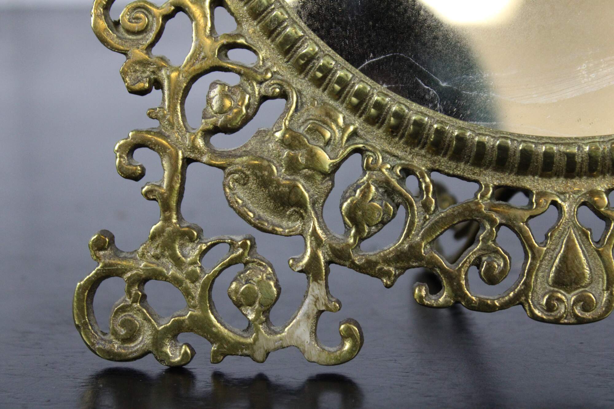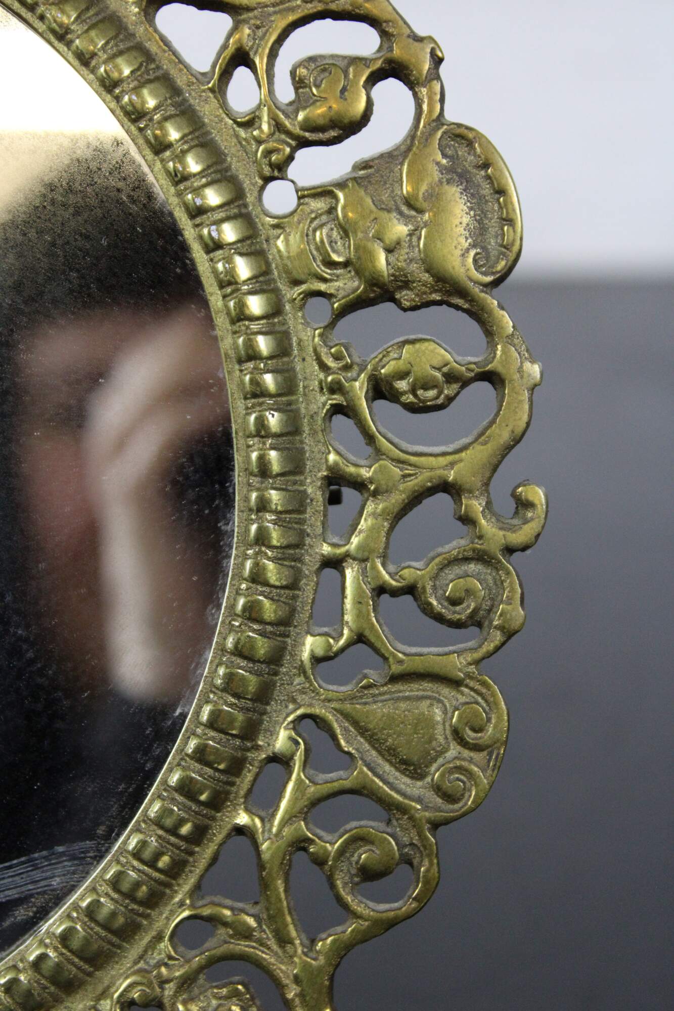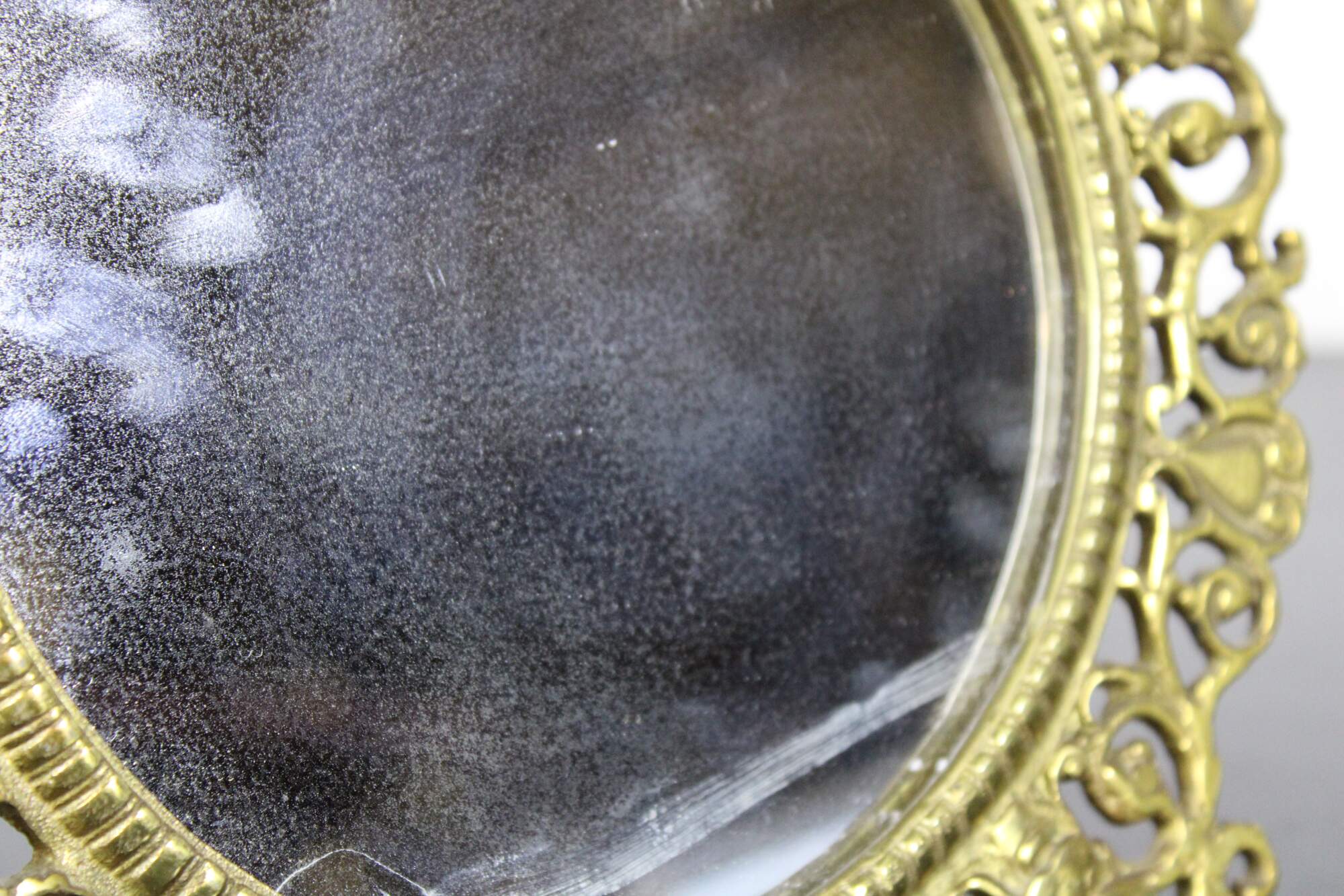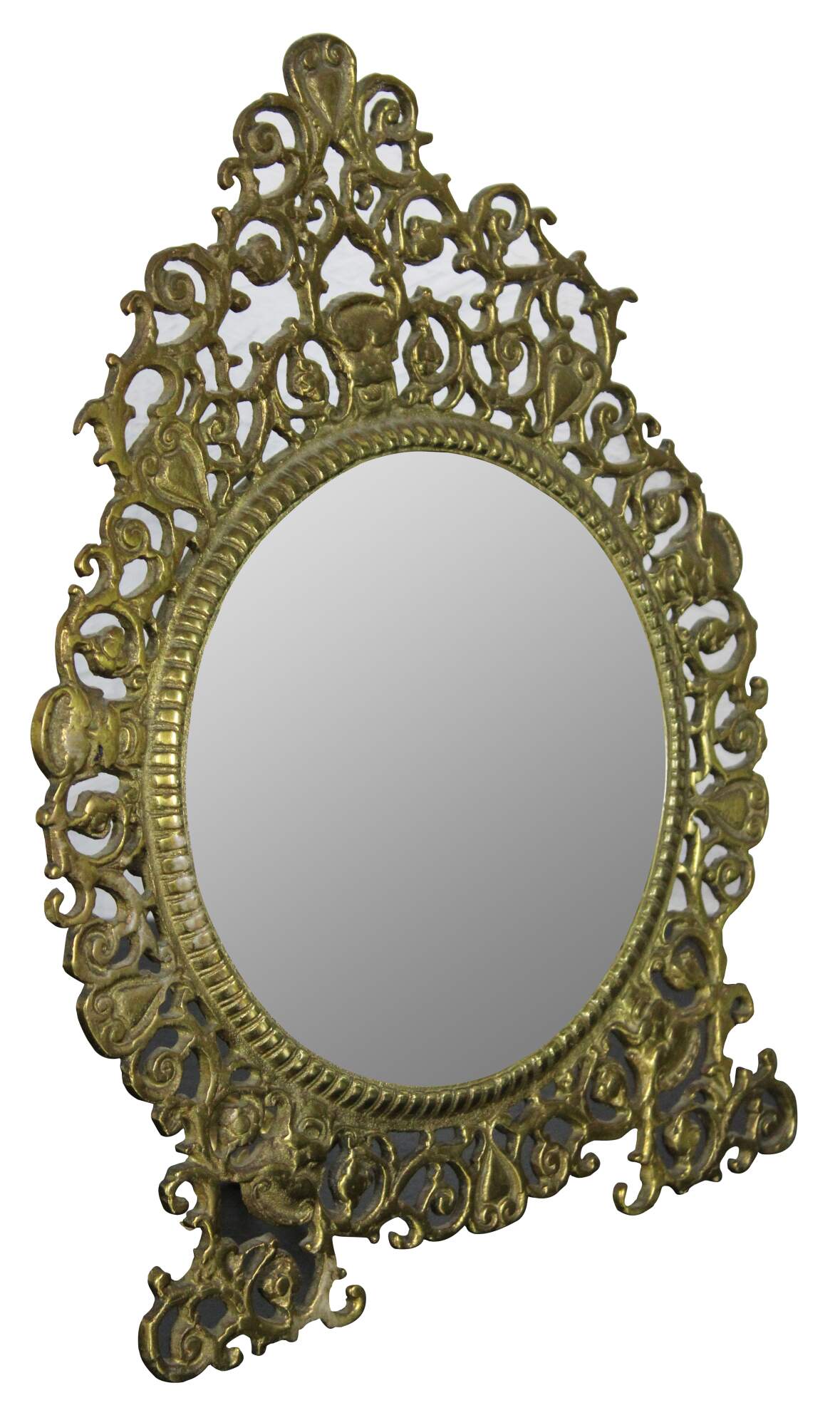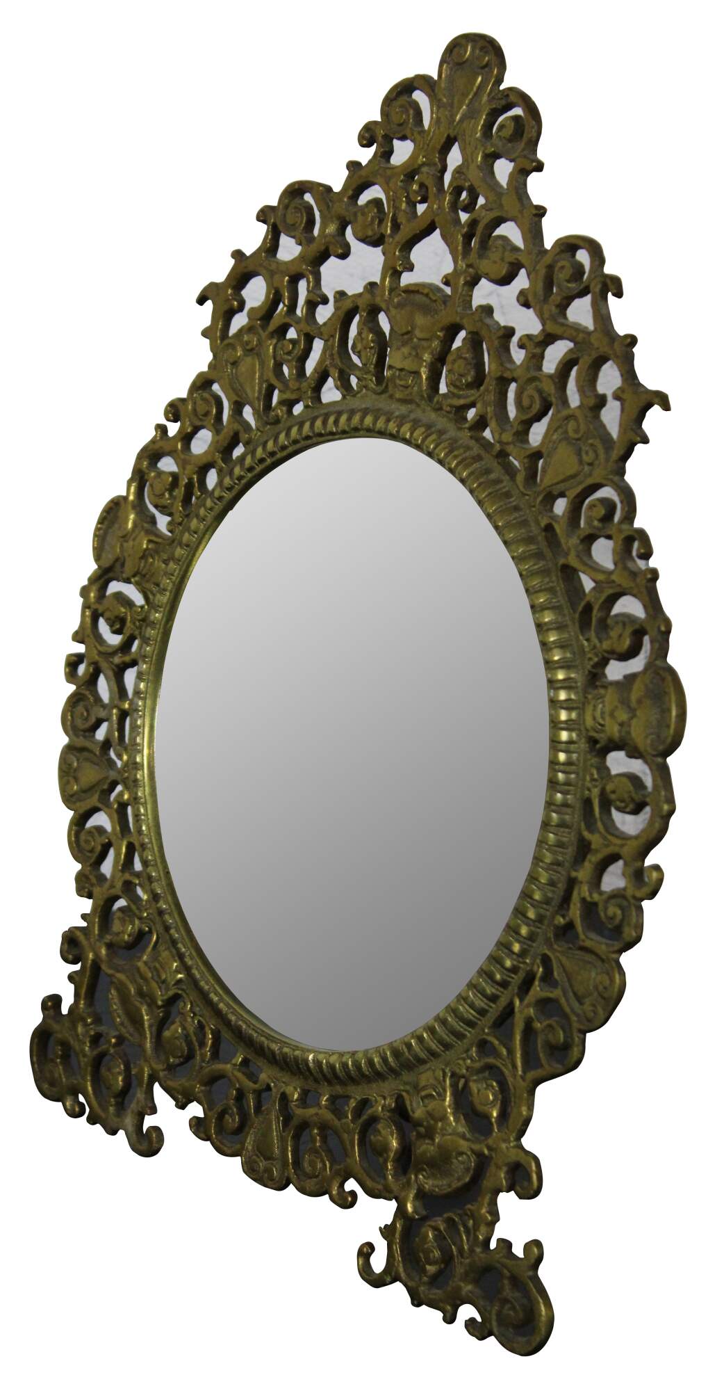 Vintage gilded brass vanity mirror by Virginia Metalcrafters with swirling baroque styling around a round mirror. Marked VM 14-1 on reverse.