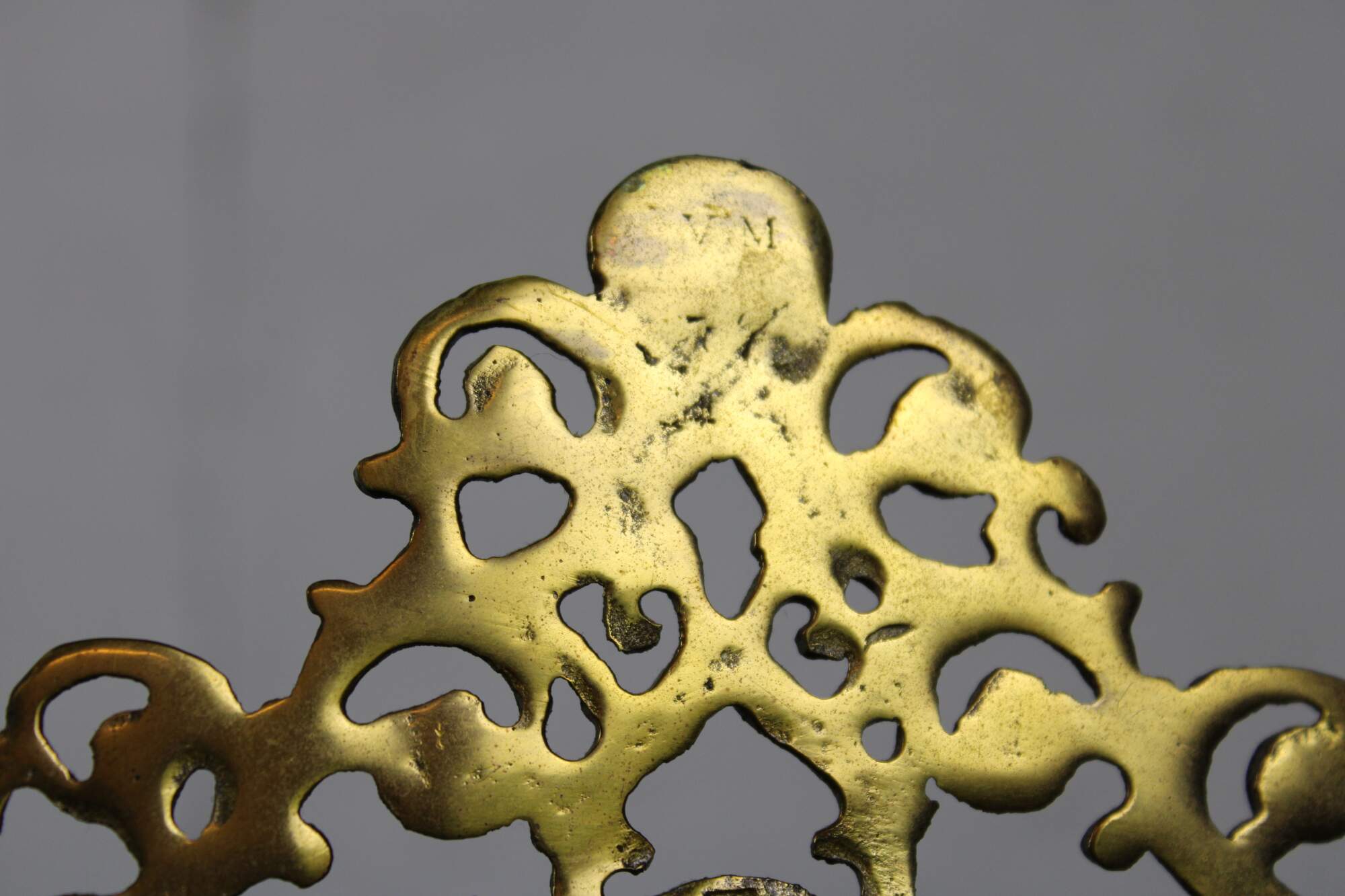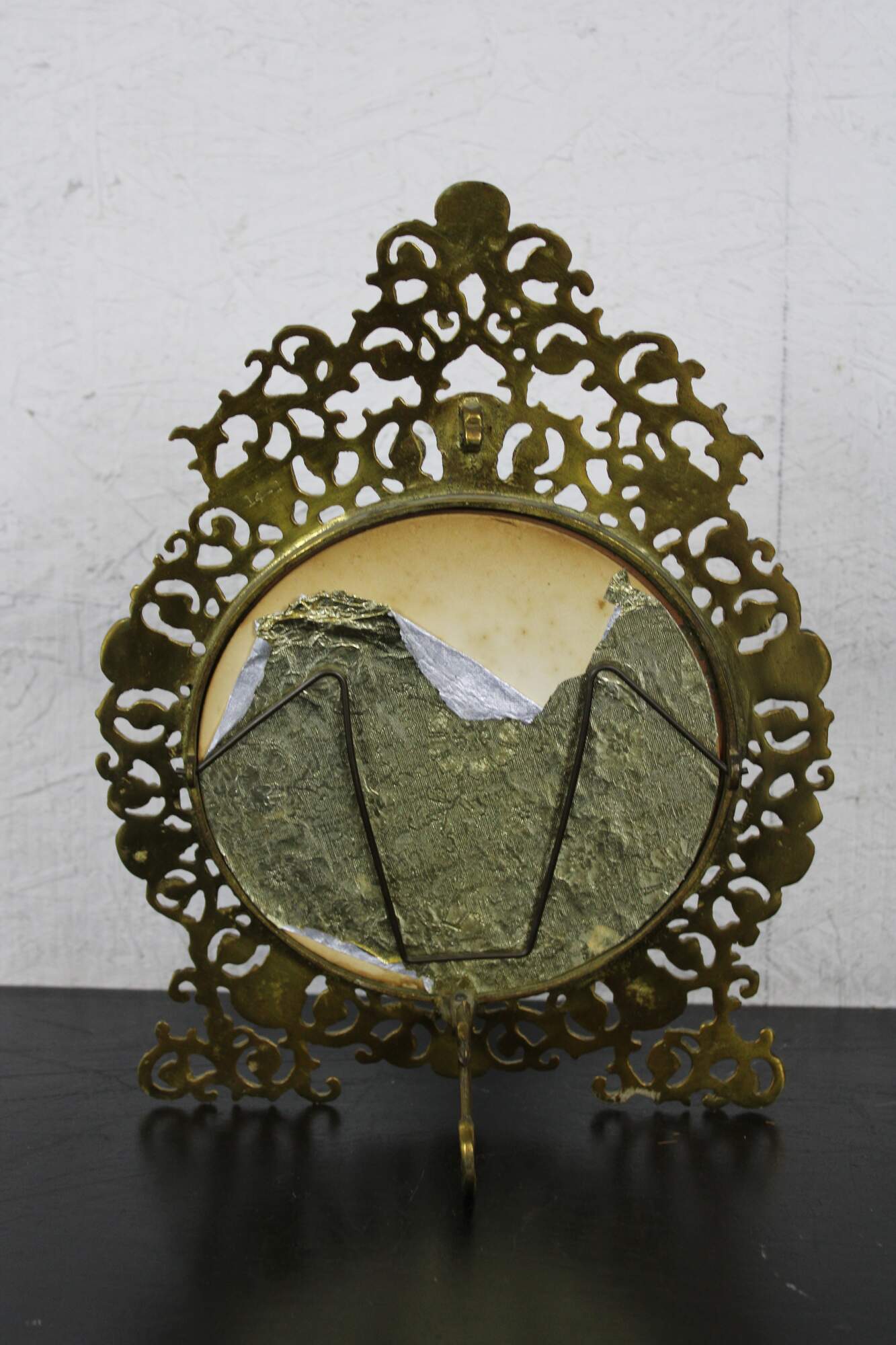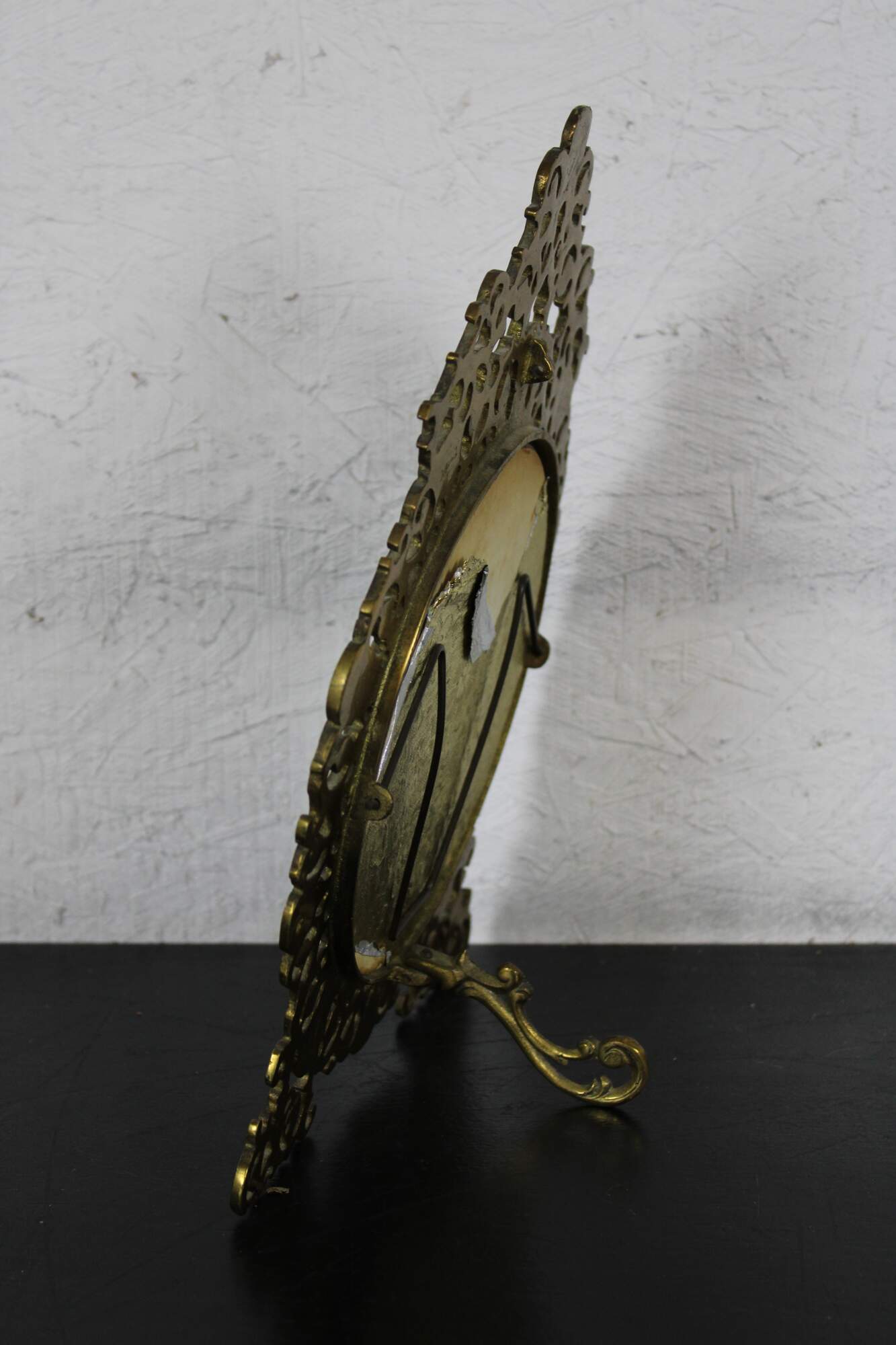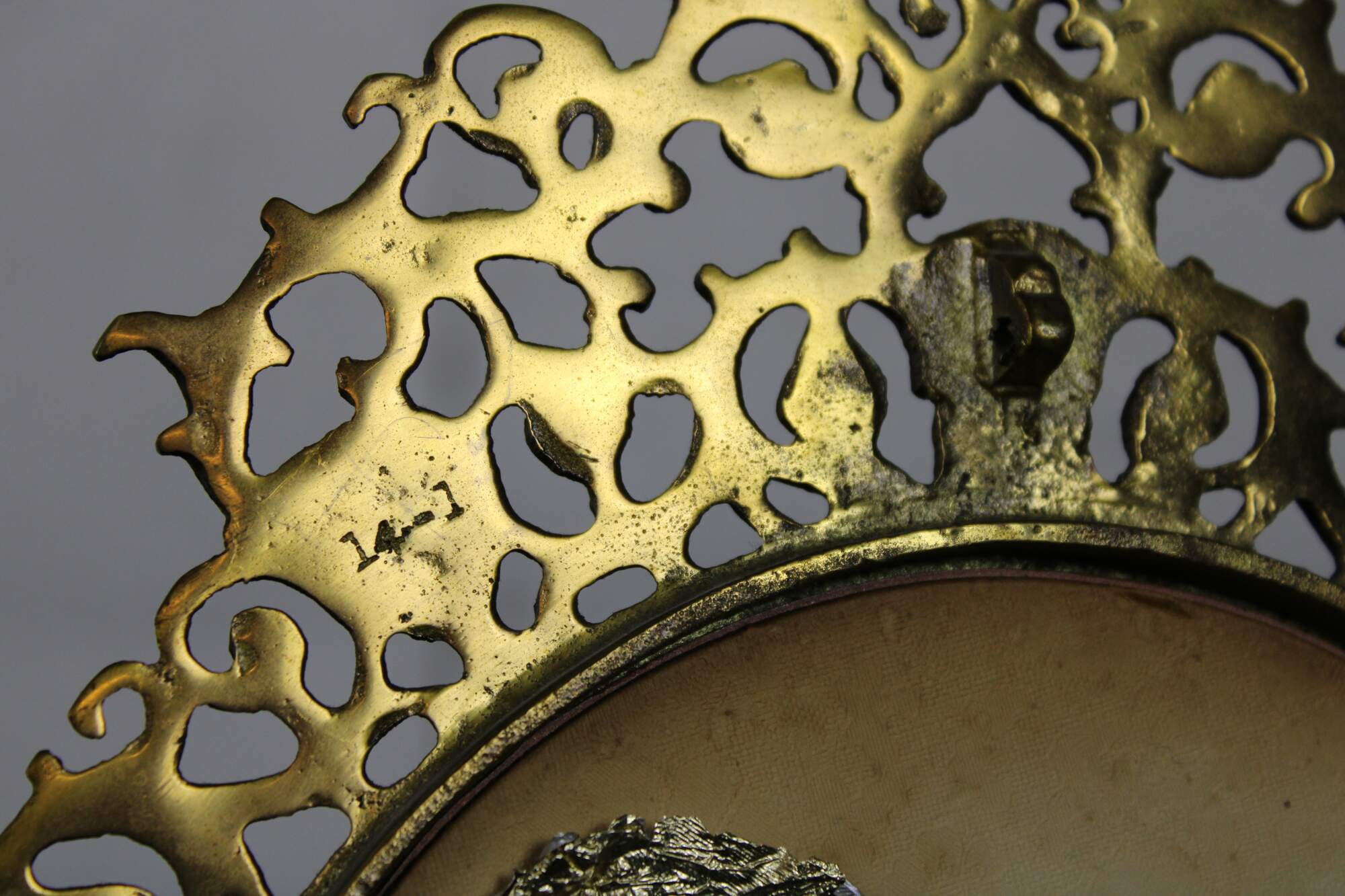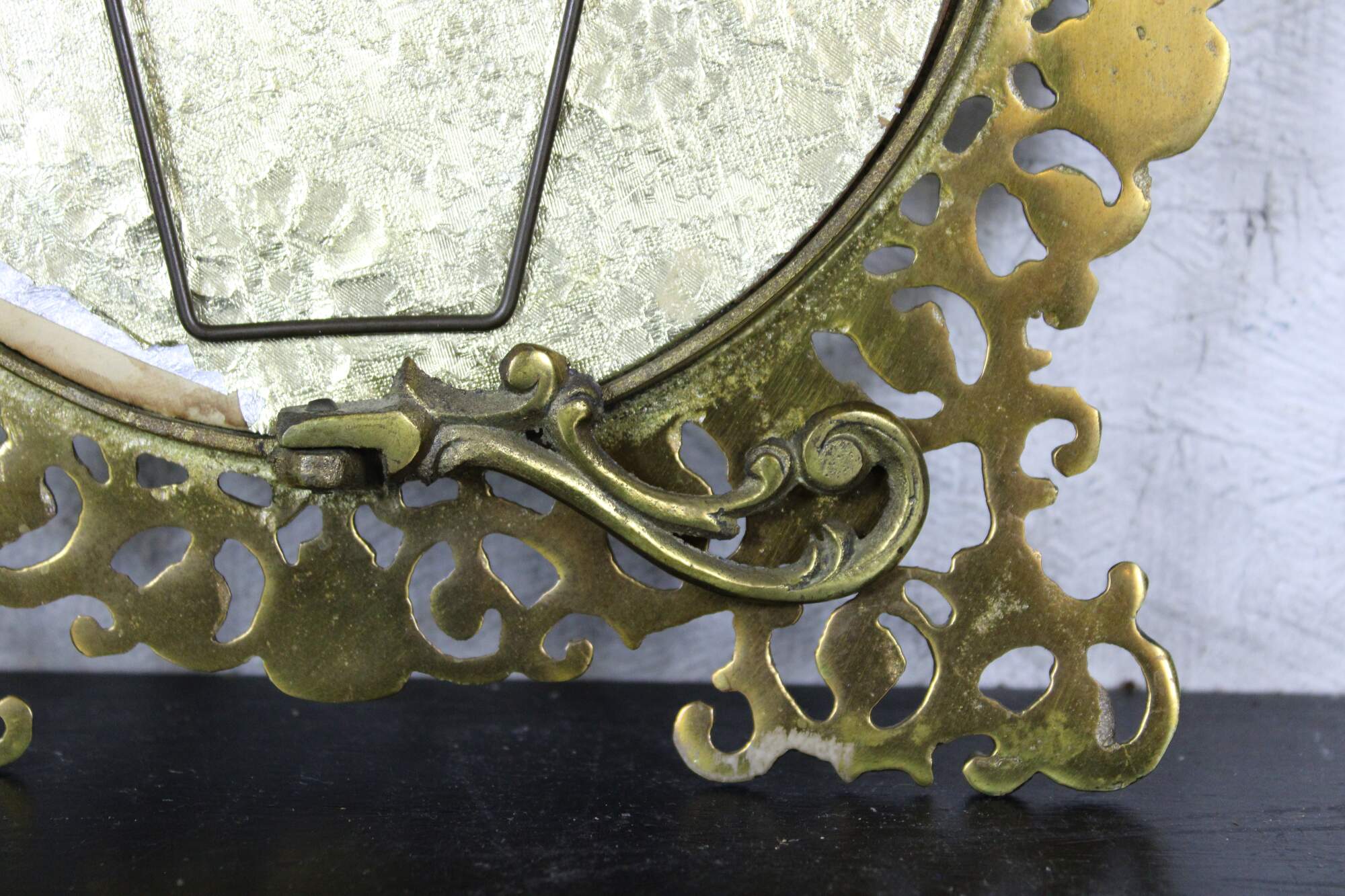 Vintage gilded brass vanity mirror by Virginia Metalcrafters with swirling baroque styling around a round mirror. Marked VM 14-1 on reverse.
