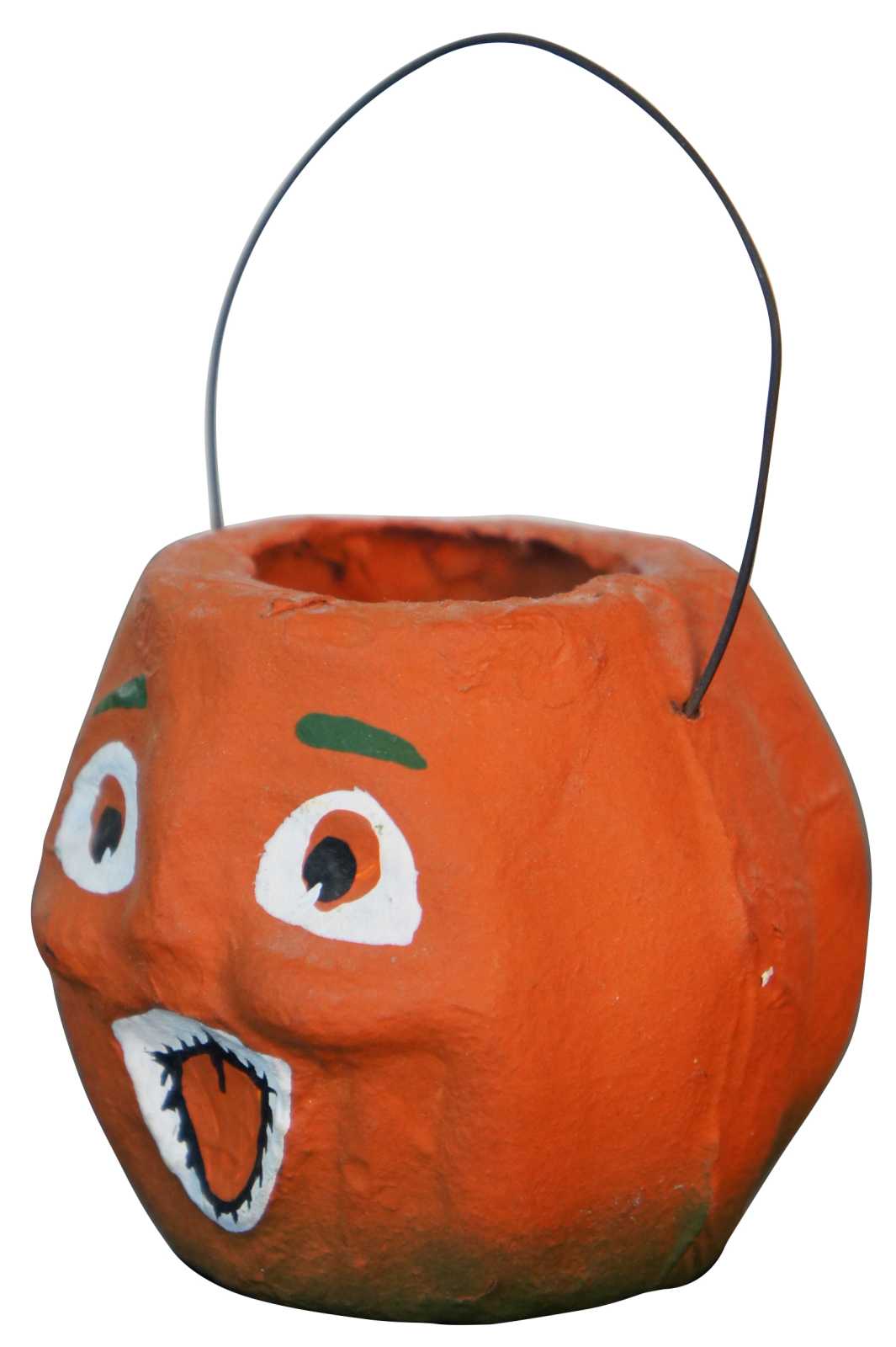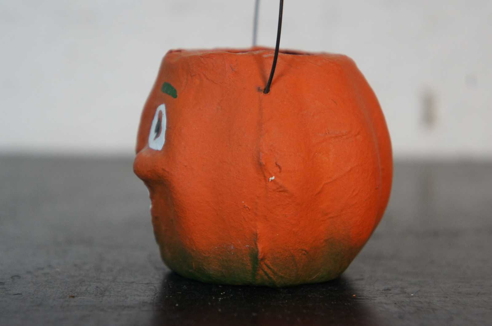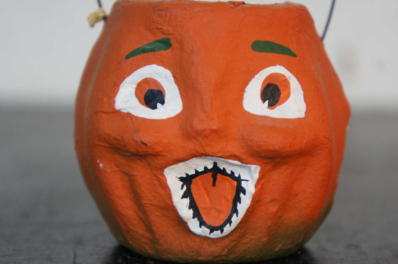 Antique paper mache miniature jack-o-lantern shaped candy bucket with painted face and wire handle.