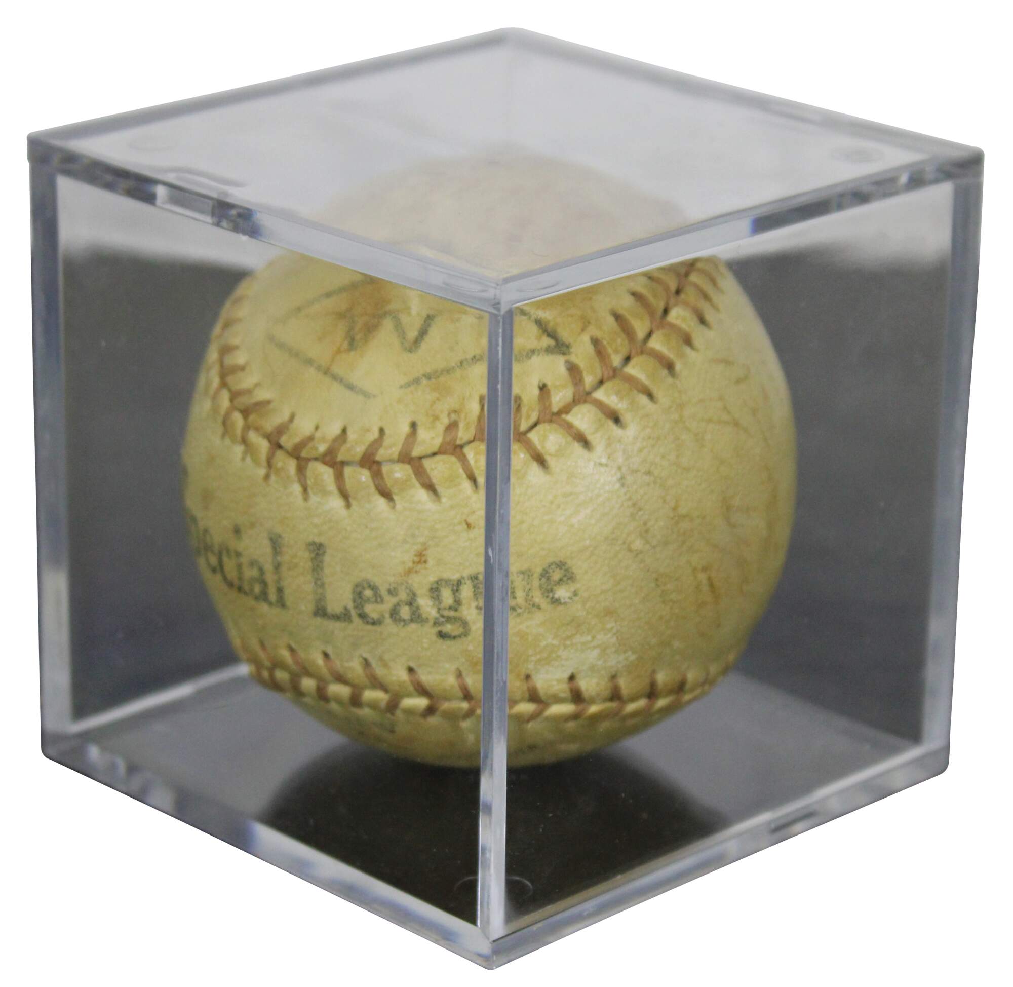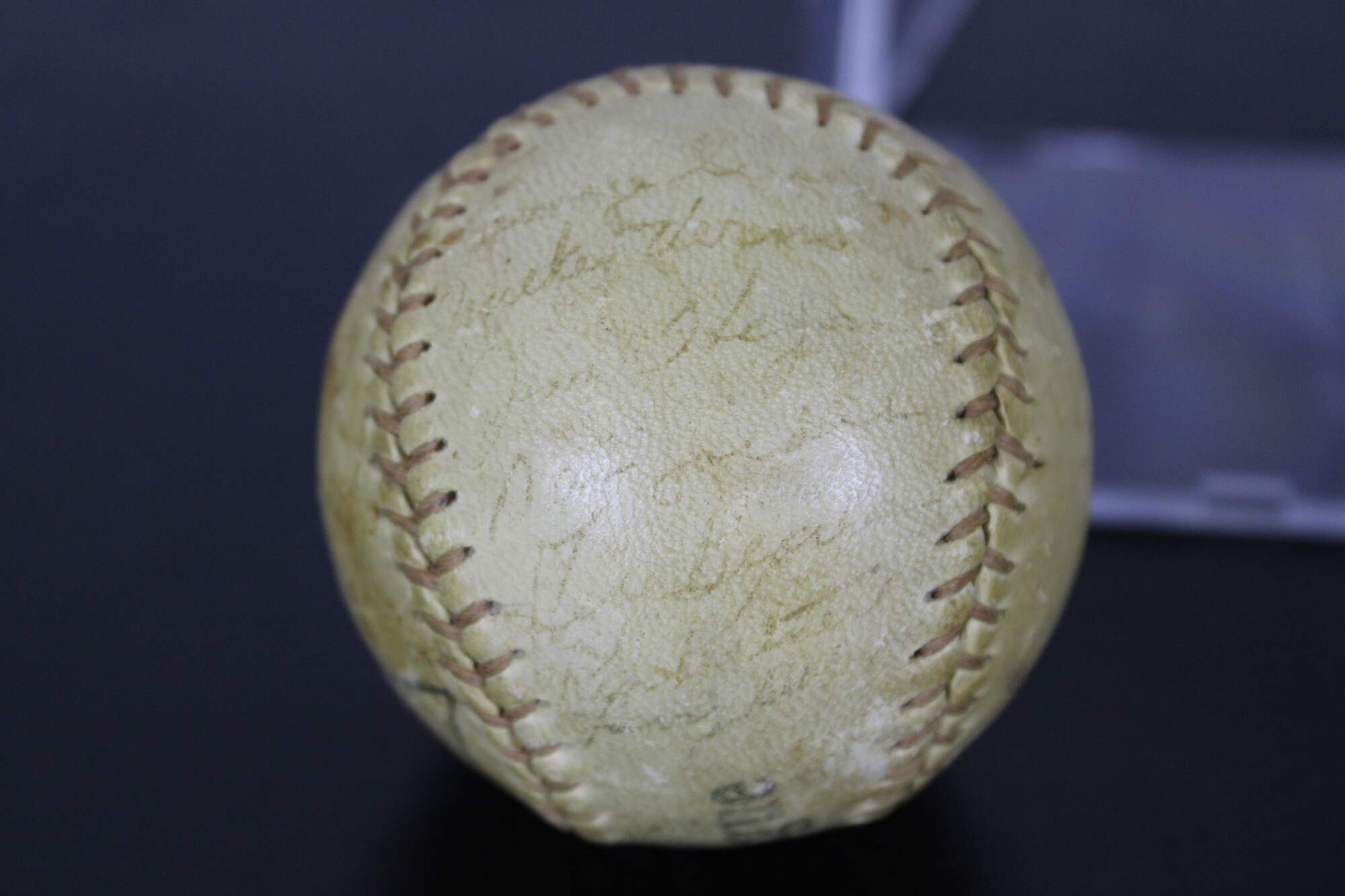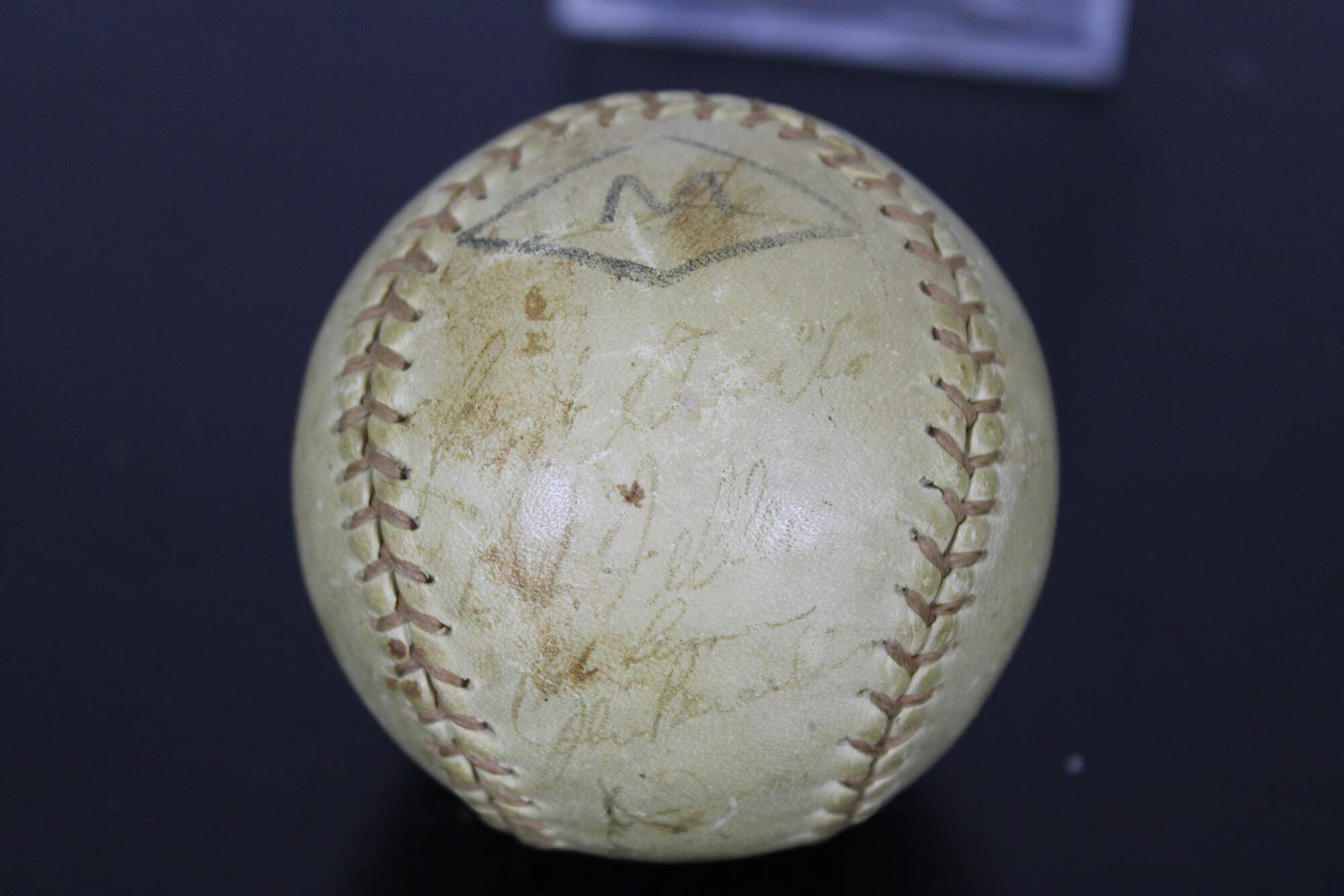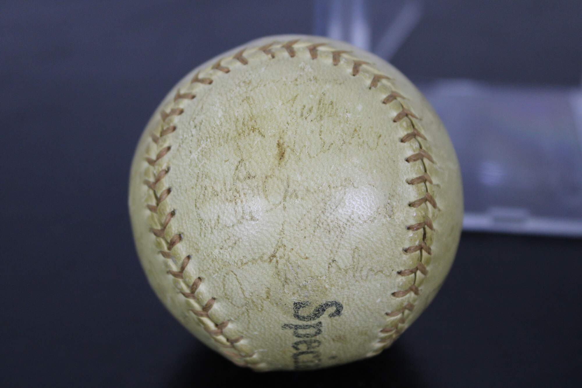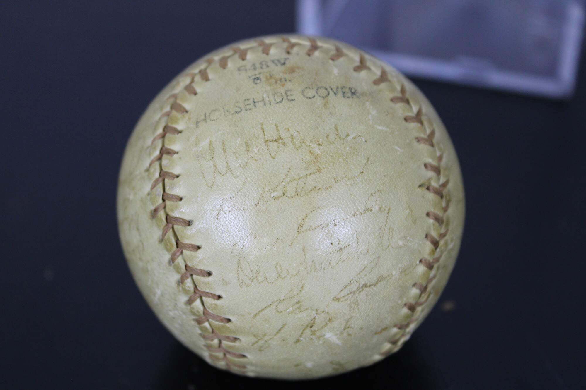 Vintage Special League S48W horsehide baseball signed by members of the 1949 Cleveland Indians baseball team. Ball includes approximately 26 signatures (some are extremely faded). Identifyable names include: Satchel Paige, Mickey Vernon, Jim Hegan, Frank Papish, Joe Gordon, Coach Mel Harder, Ken Keltner, Dale Mitchell, Ray Boone, Hal Peck, Bobby Avila, Bob Feller, and Johnny Bearding.