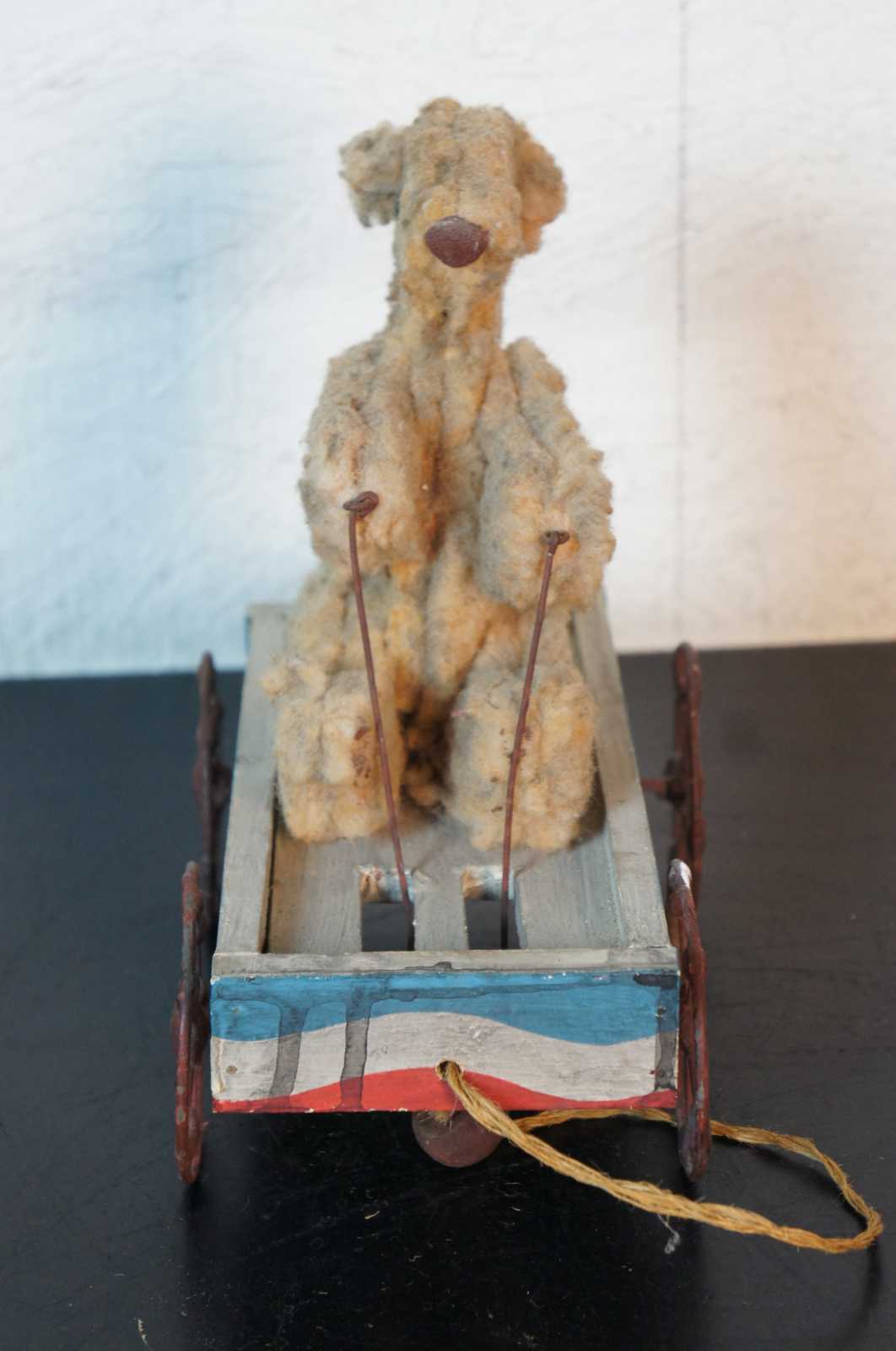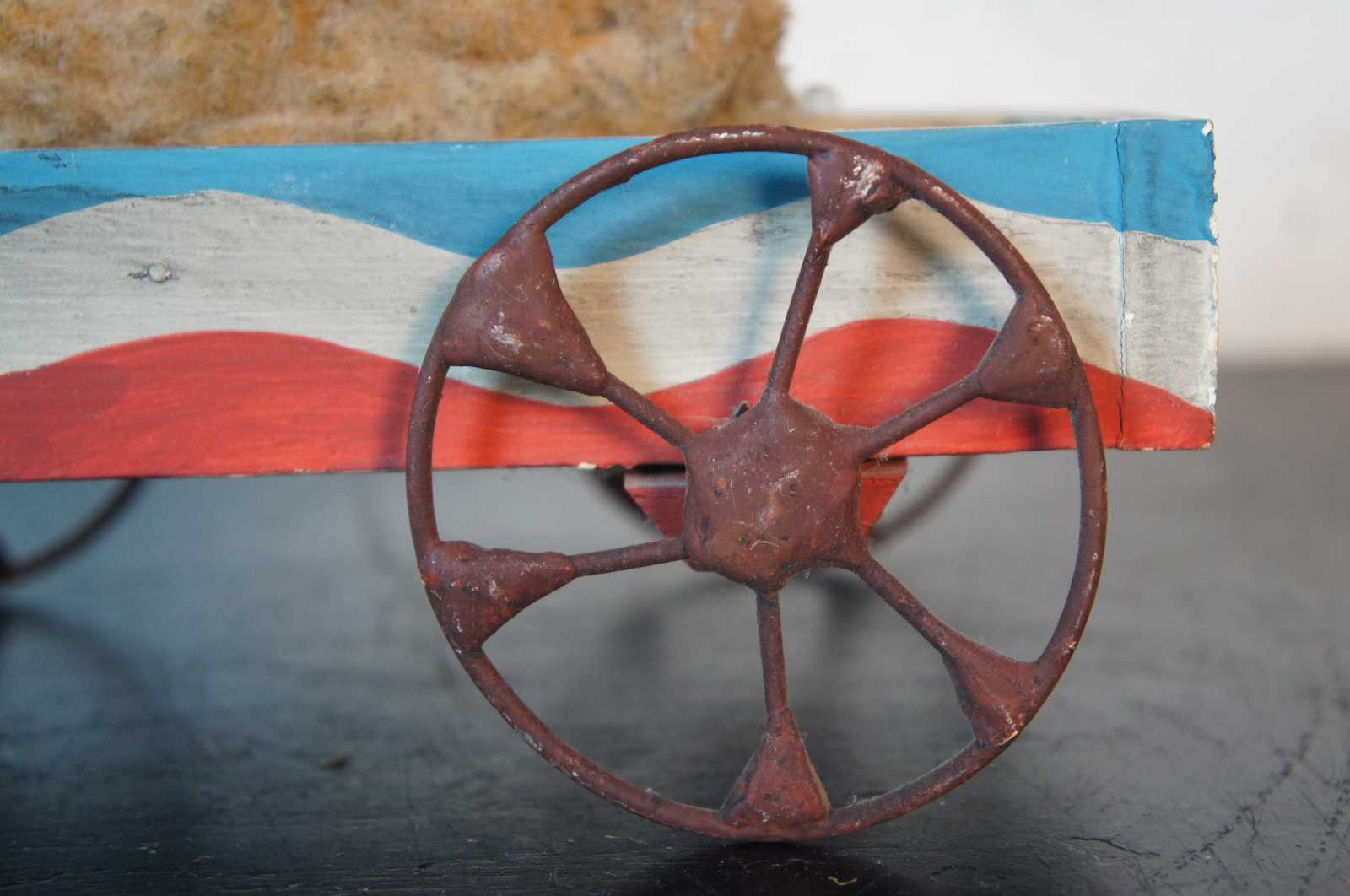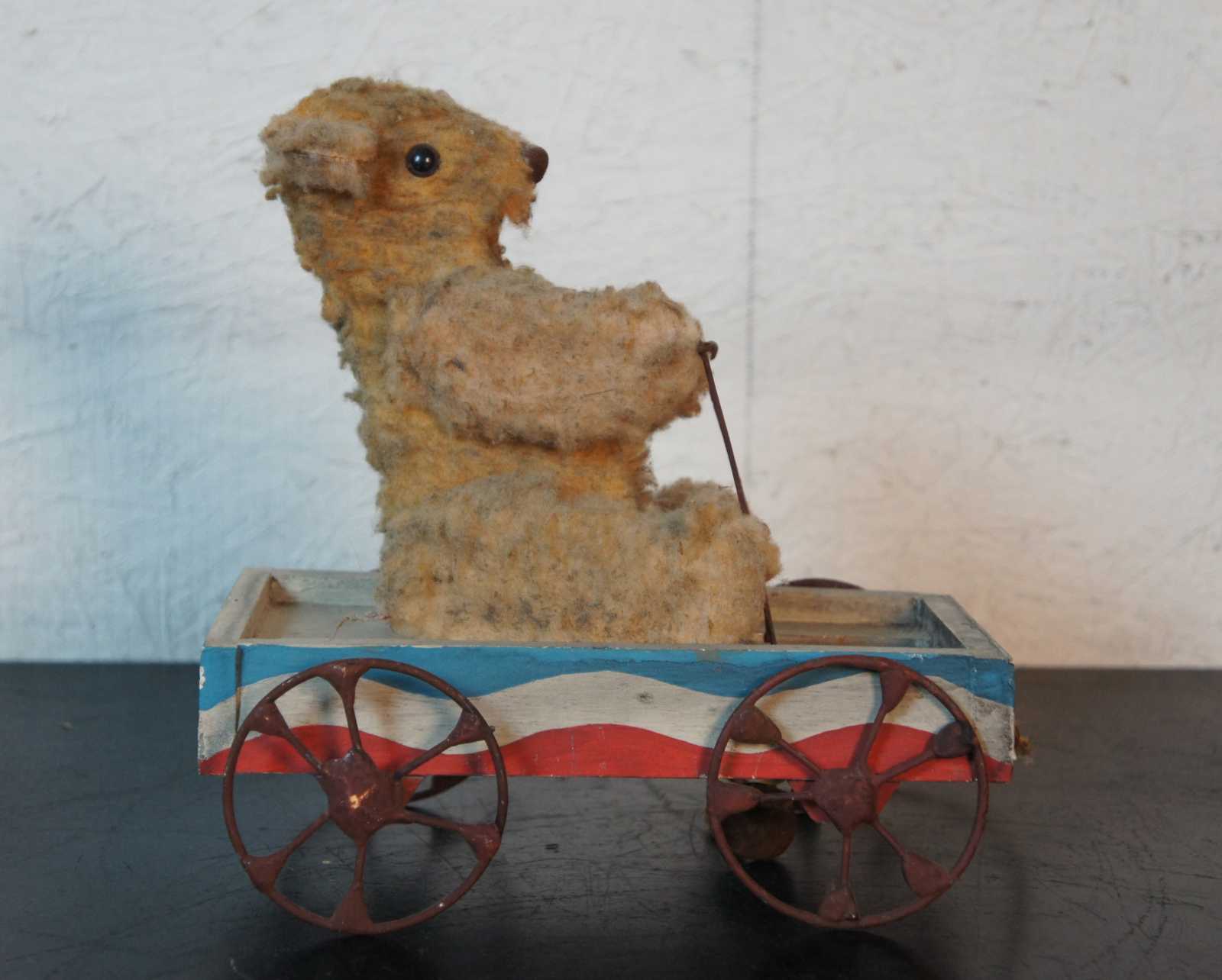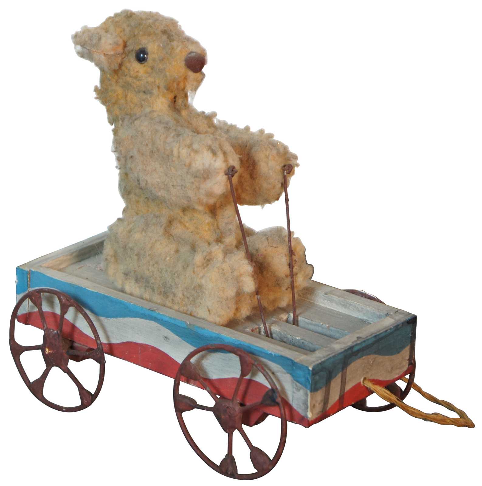 Antique wheeled platform articulating pull toy featuring a teddy bear stuffed animal seated in a red white and blue wagon with arms that move up and down as it rolls.