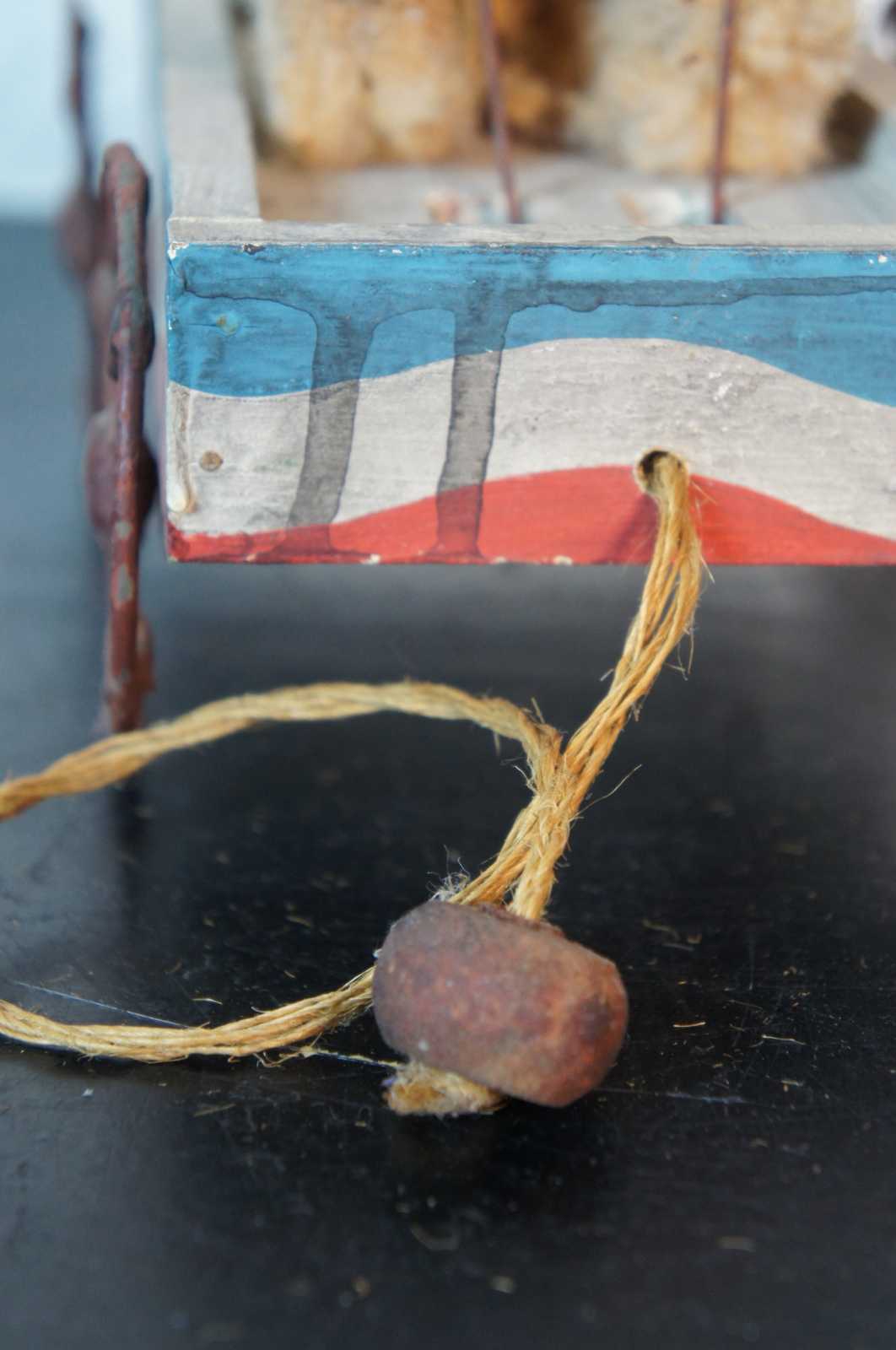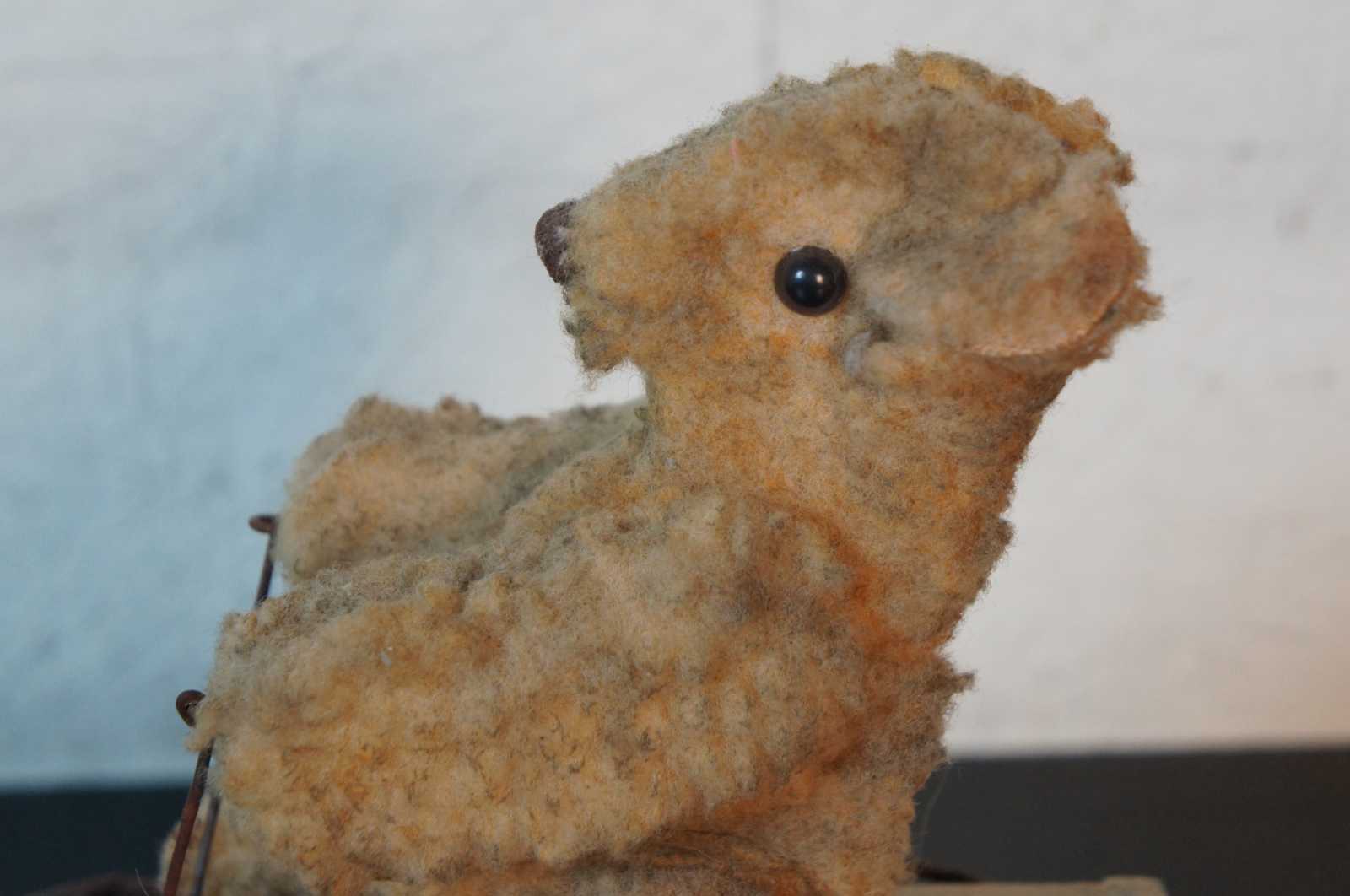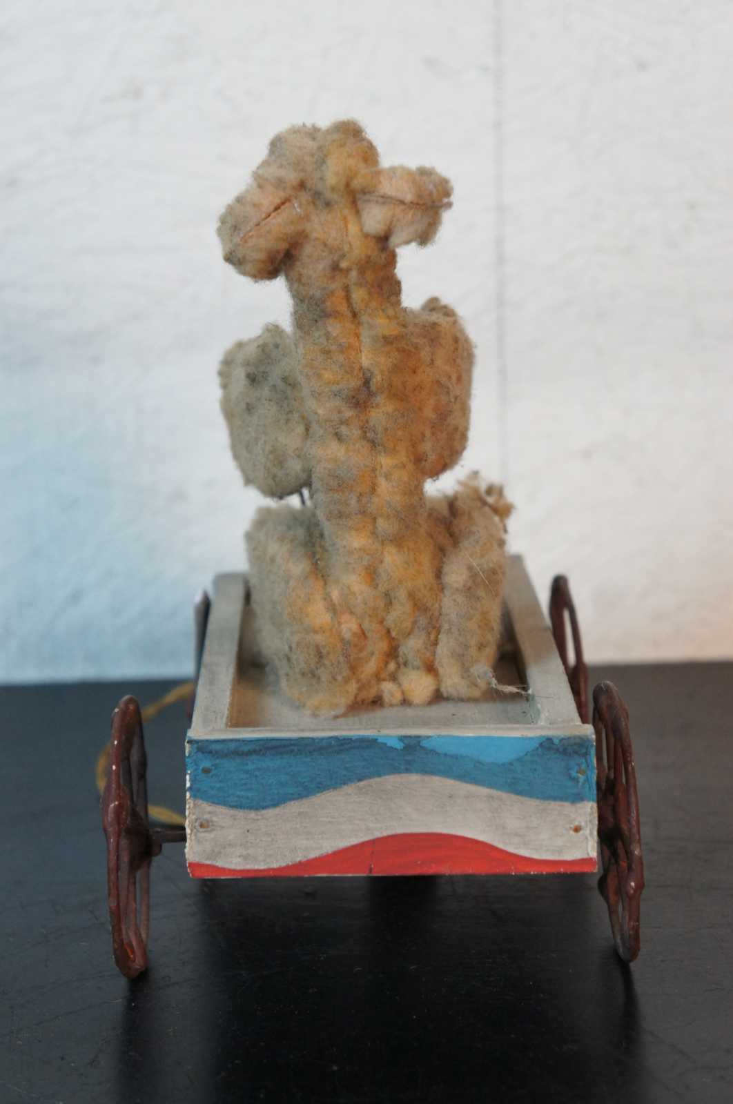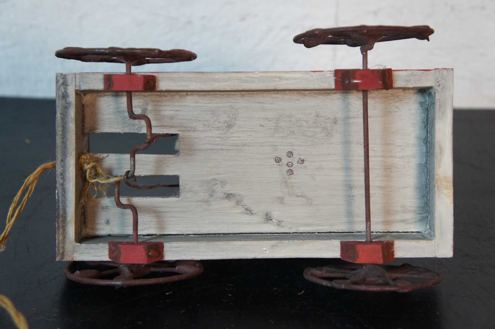 Antique wheeled platform articulating pull toy featuring a teddy bear stuffed animal seated in a red white and blue wagon with arms that move up and down as it rolls.