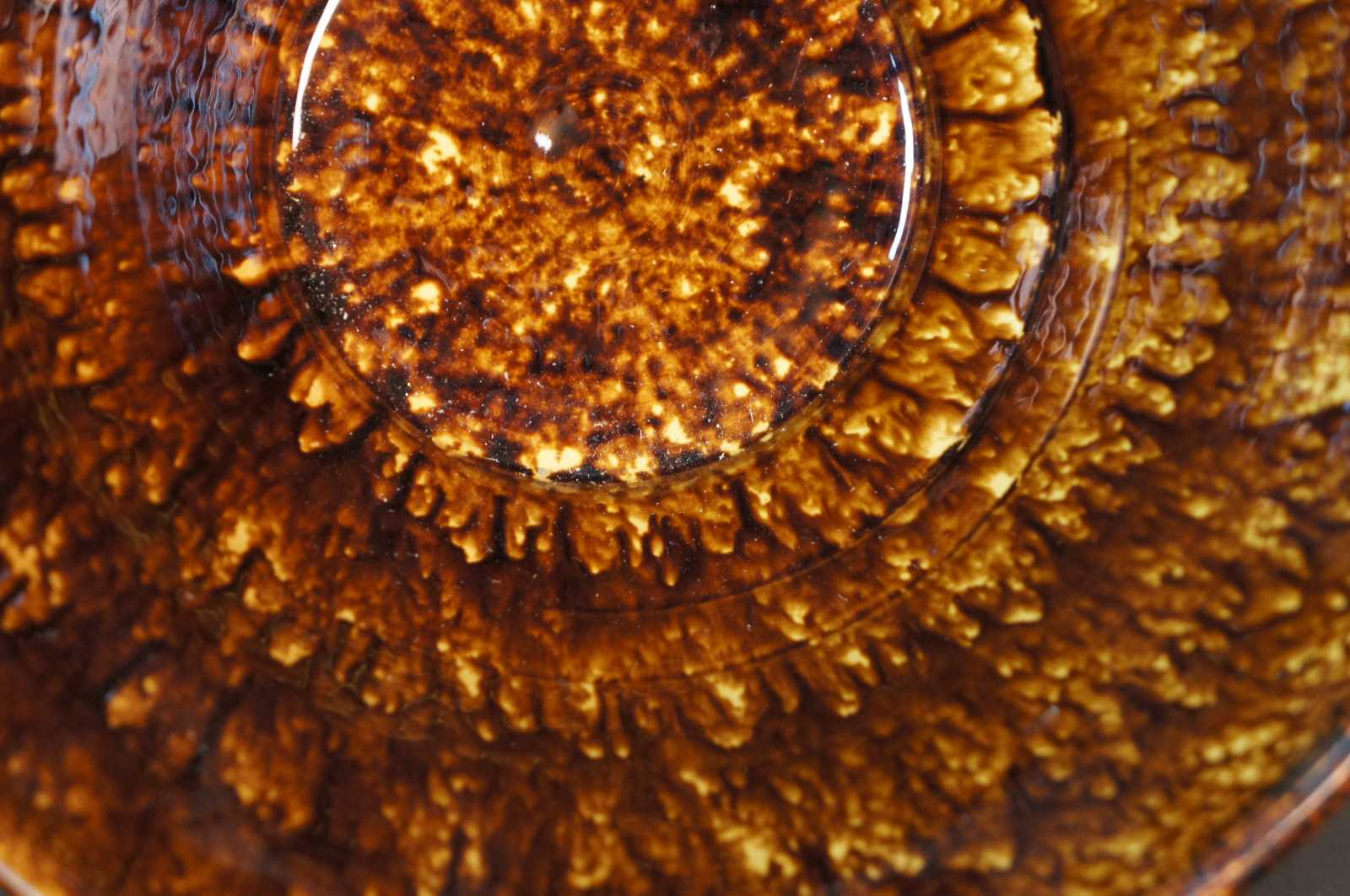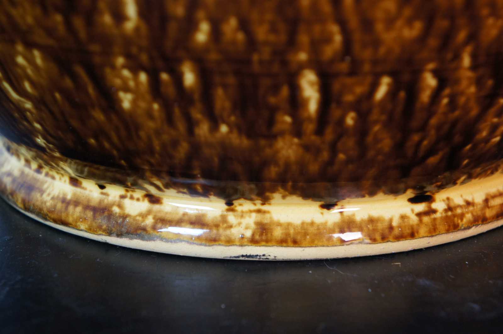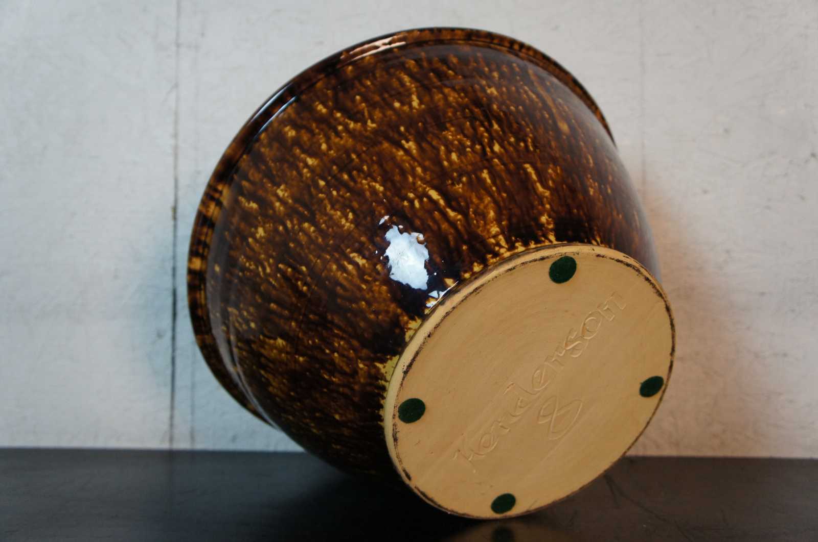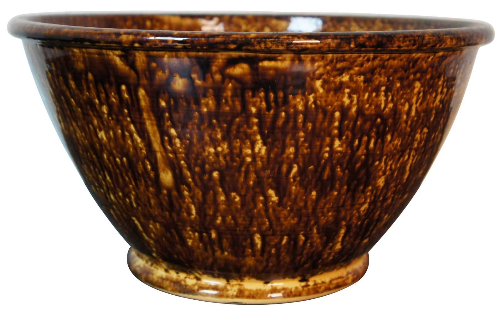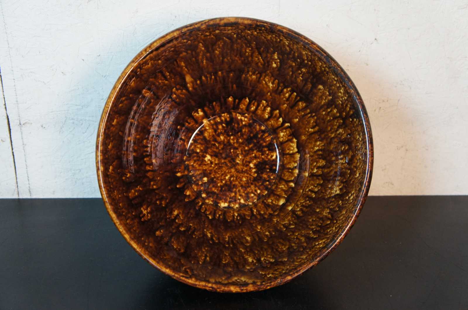 Vintage large two tone Rockingham wares / Redware brown drip glaze spatterware style mixing / fruit / serving centerpiece bowl by Kenneth Henderson, marked 8 on the base.