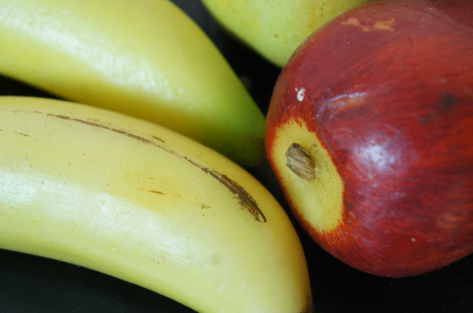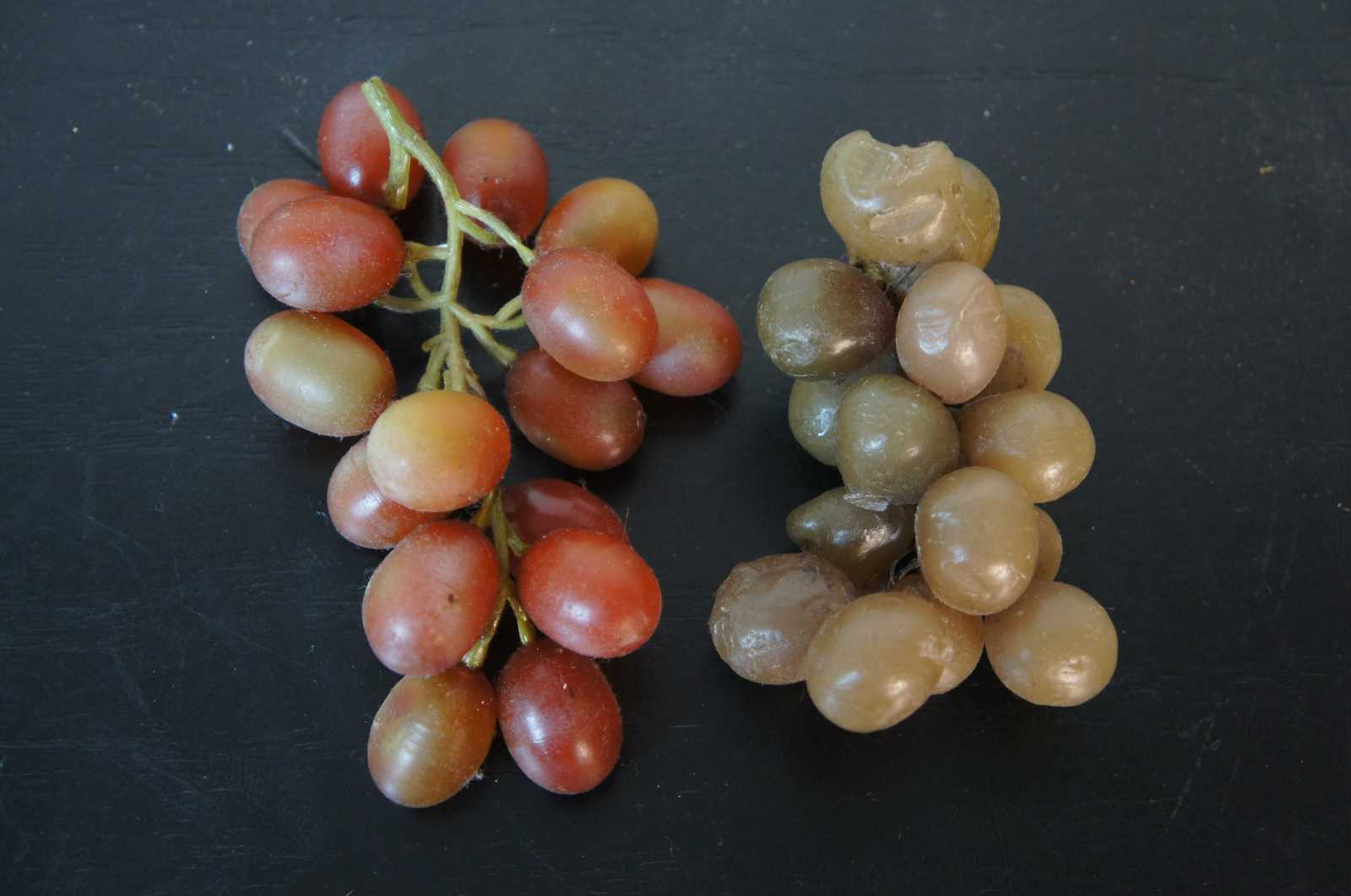 Lot of 40 pieces of antique and vintage wax fruits, including apples, oranges, bananas, grapes, pears and peaches.
