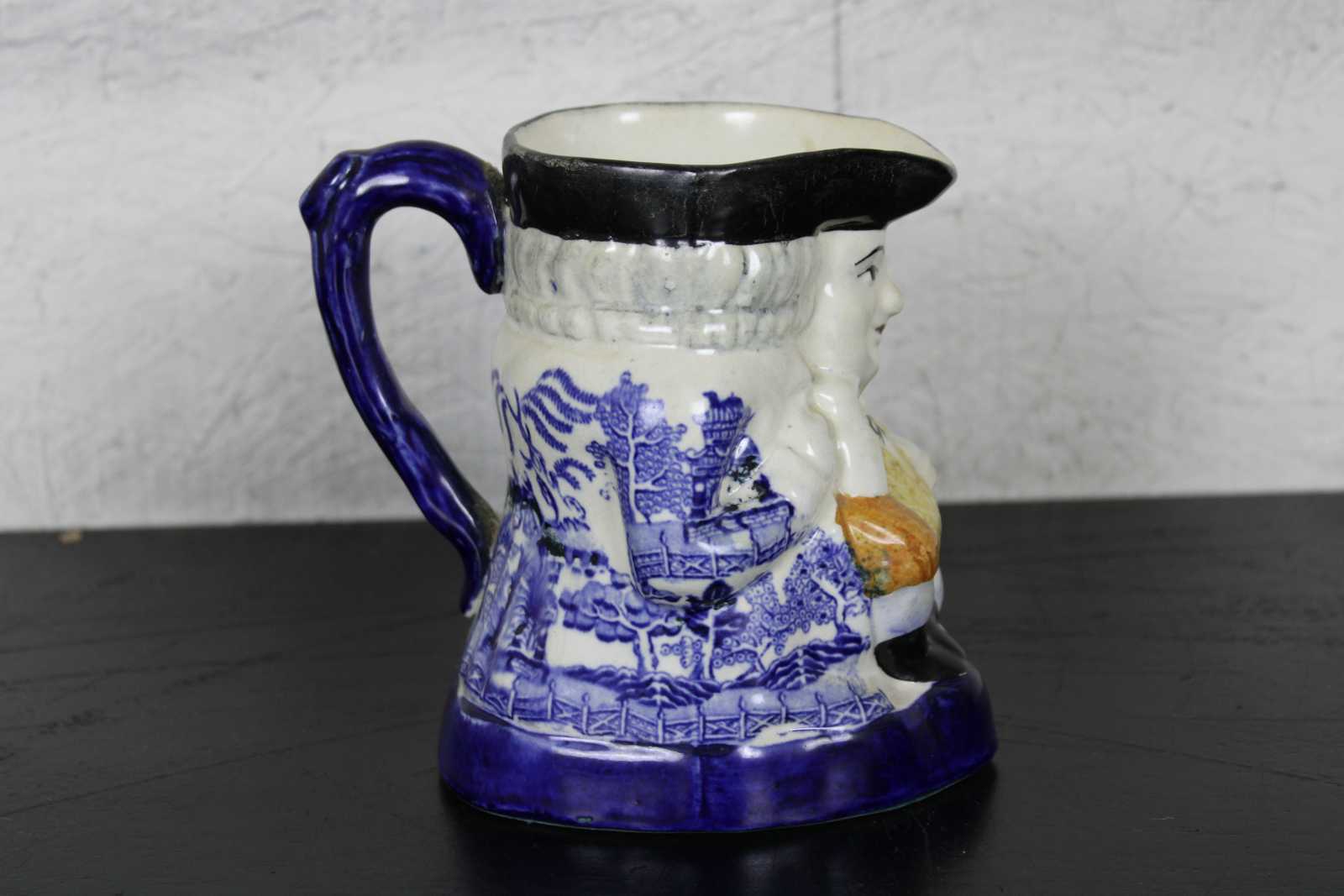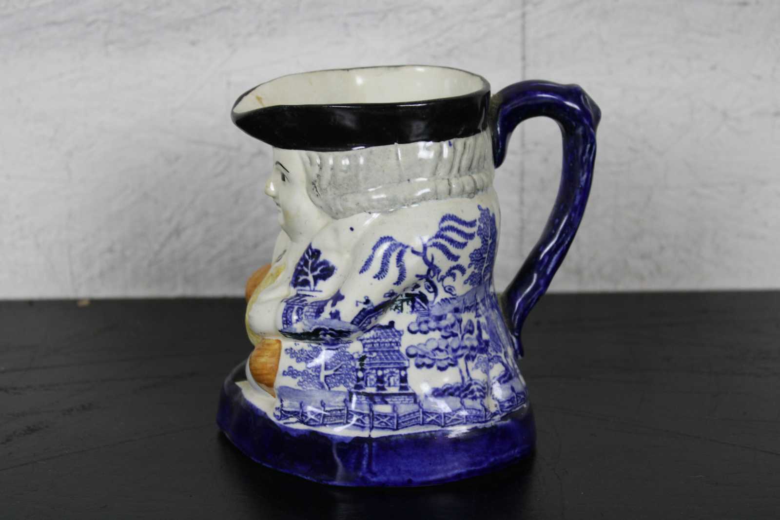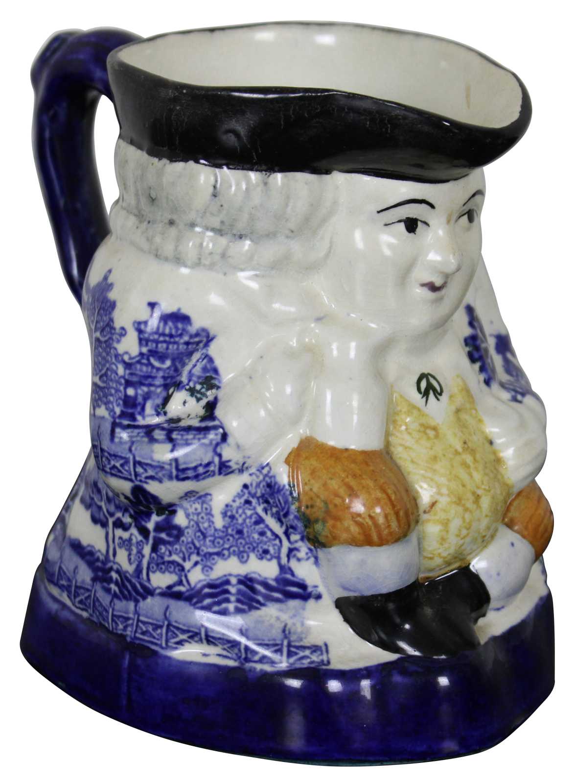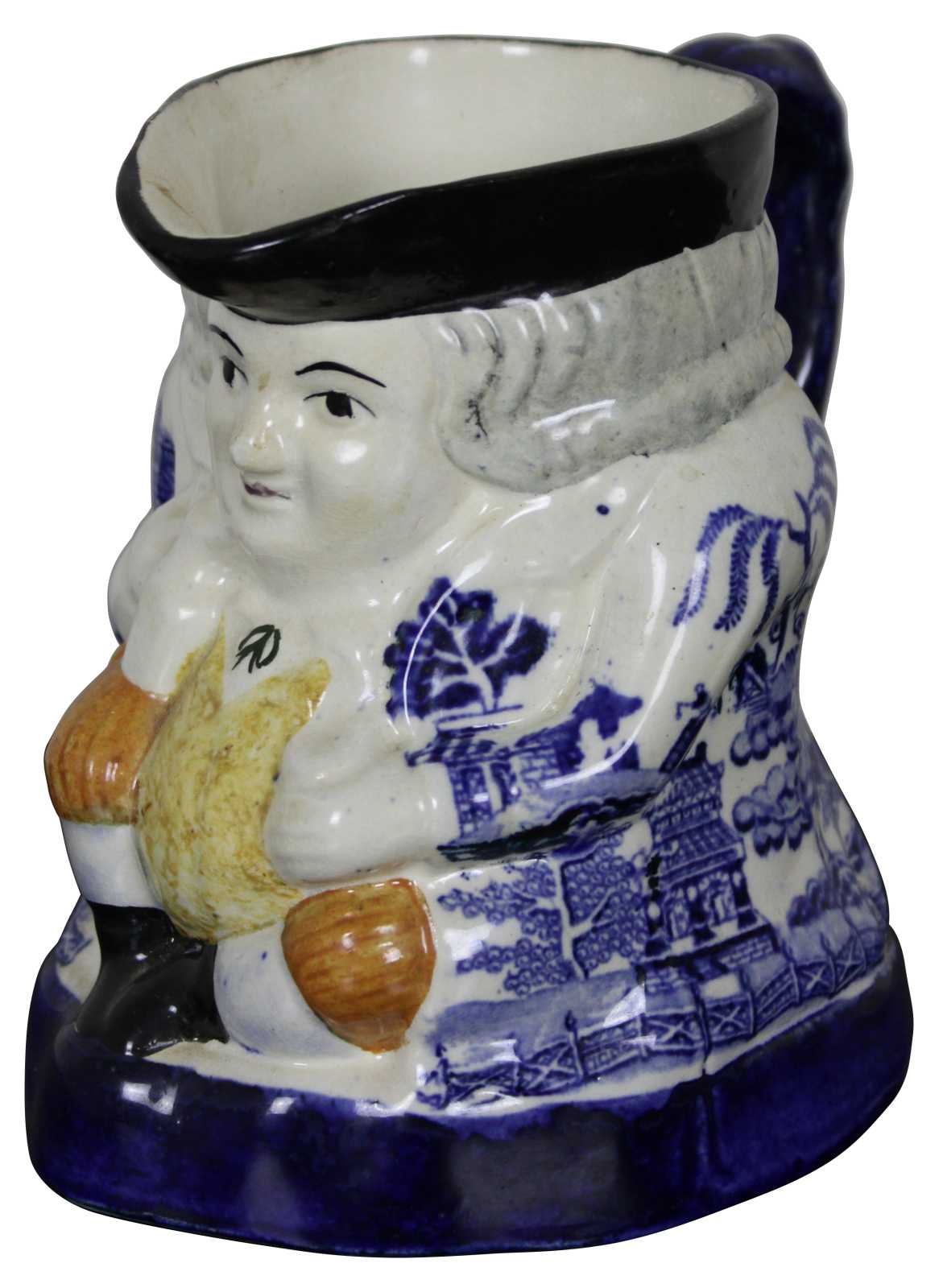 Antique turn of the century Old Staffordshire rare pottery toby jug in the shape of a colonial Englishman holding a cup and pitcher, and decorated with a chinoiserie blue willow pattern around the sides.