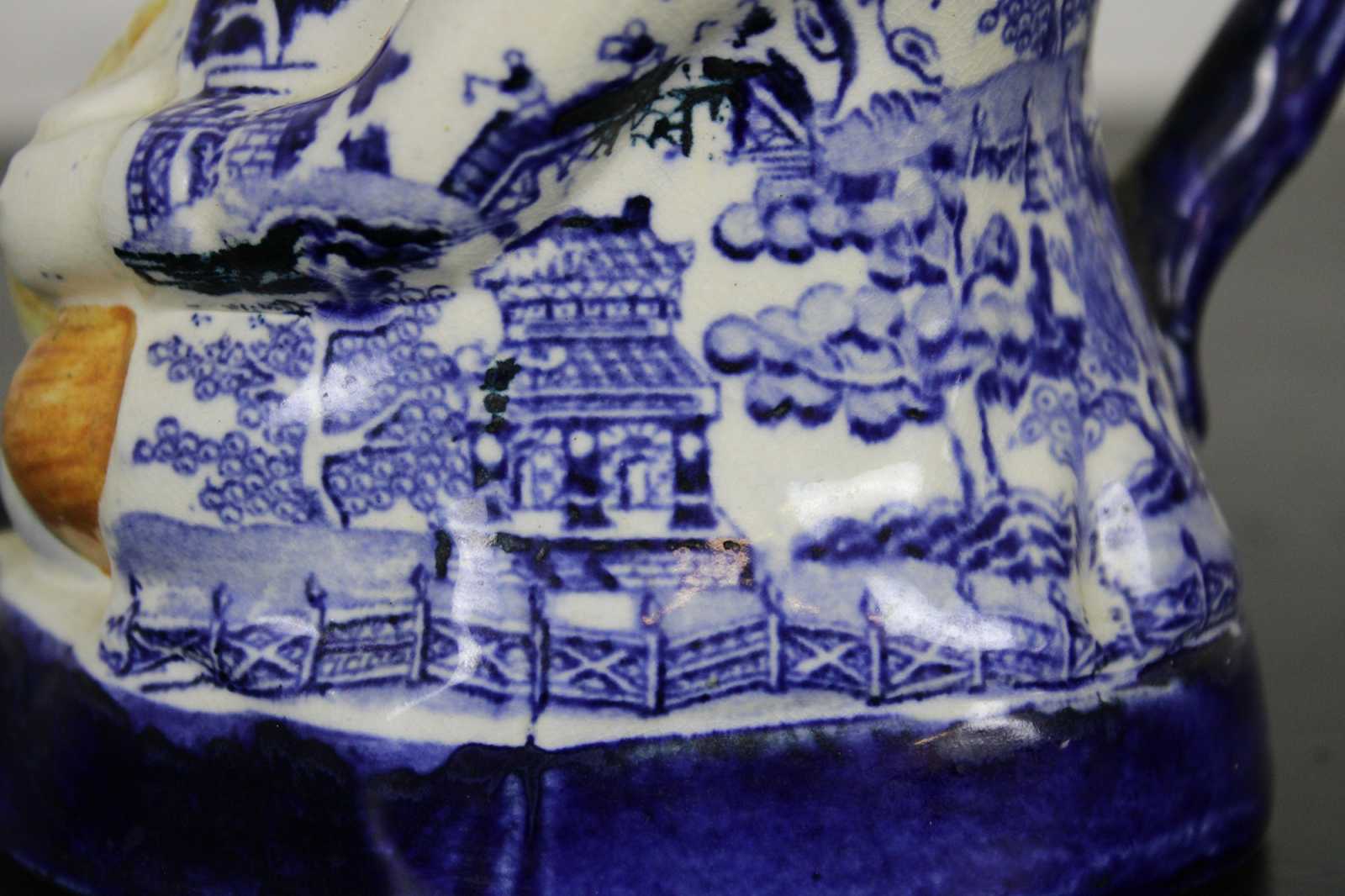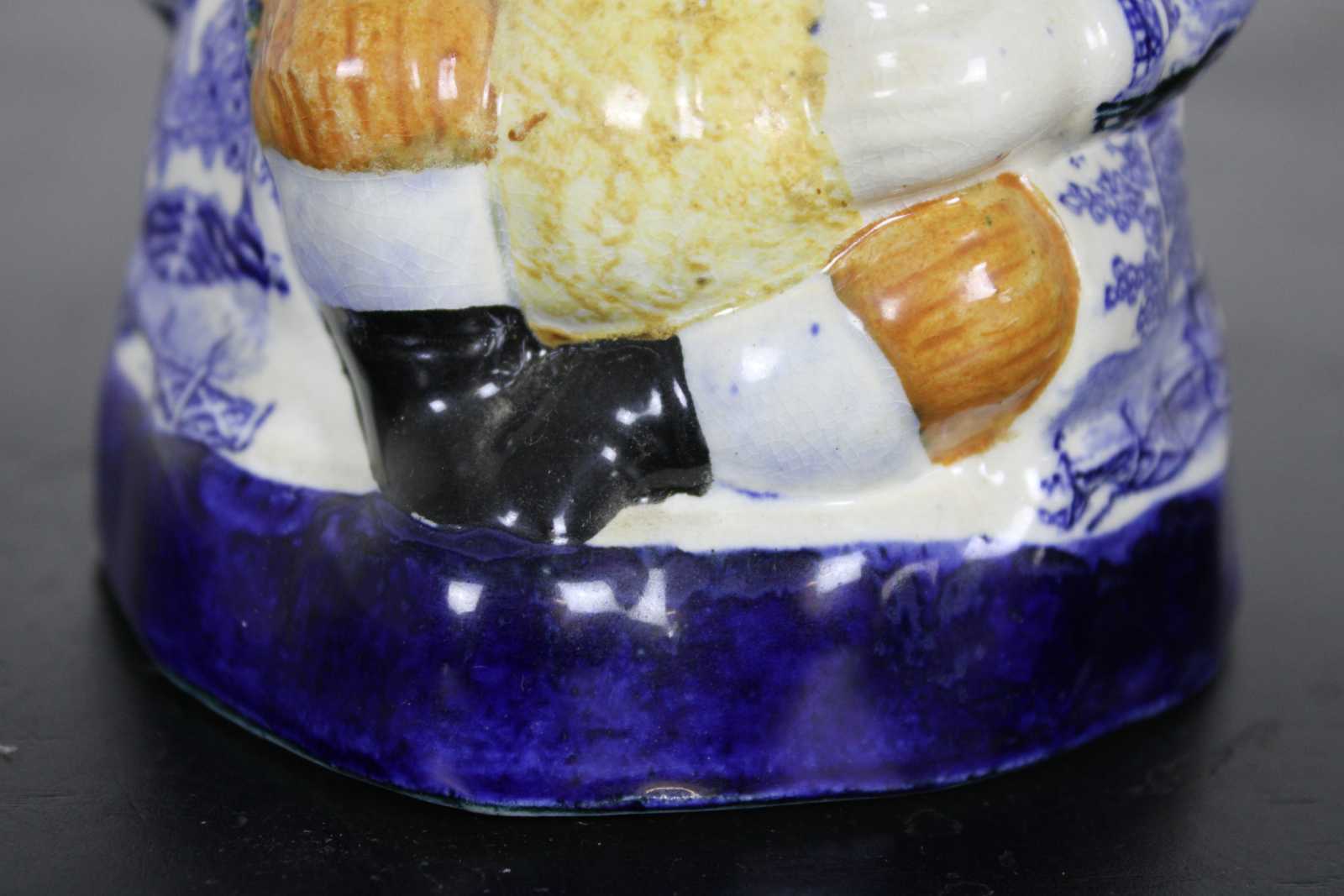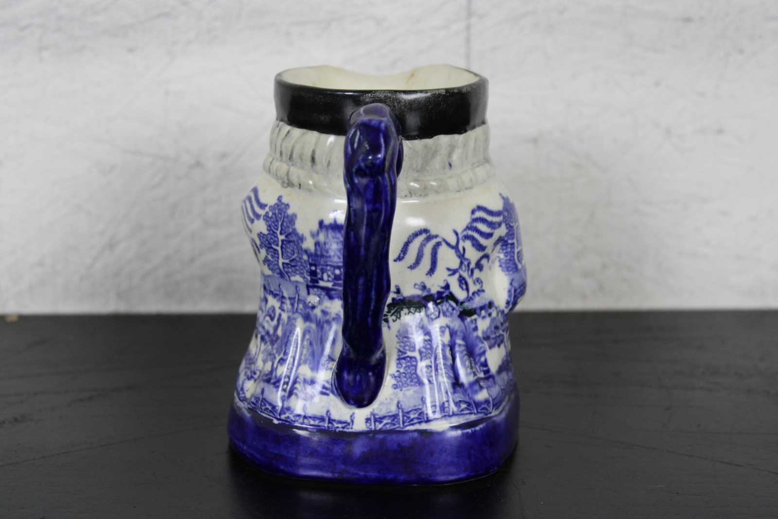 Antique turn of the century Old Staffordshire rare pottery toby jug in the shape of a colonial Englishman holding a cup and pitcher, and decorated with a chinoiserie blue willow pattern around the sides.