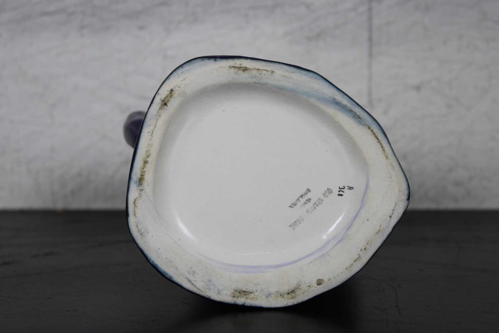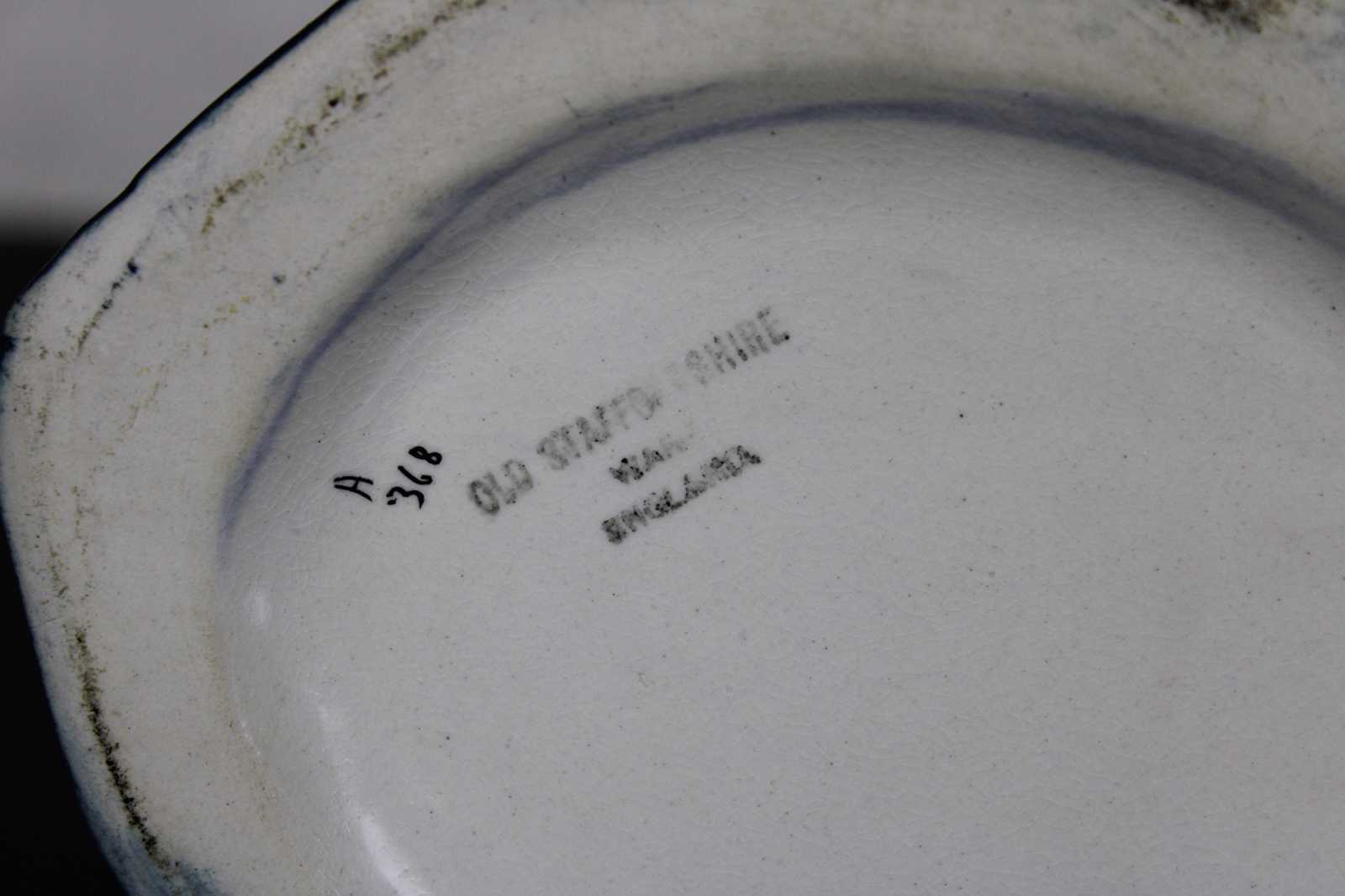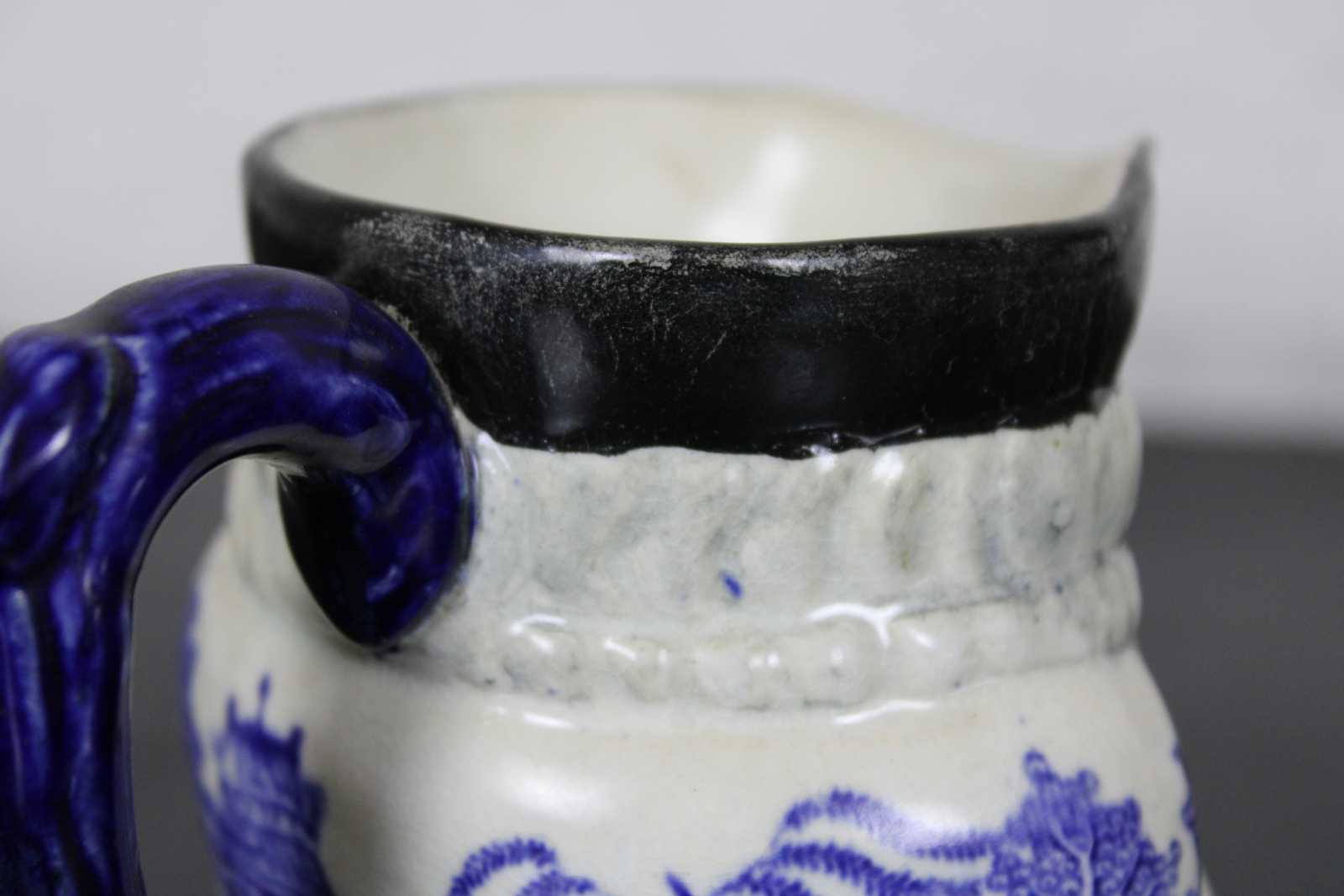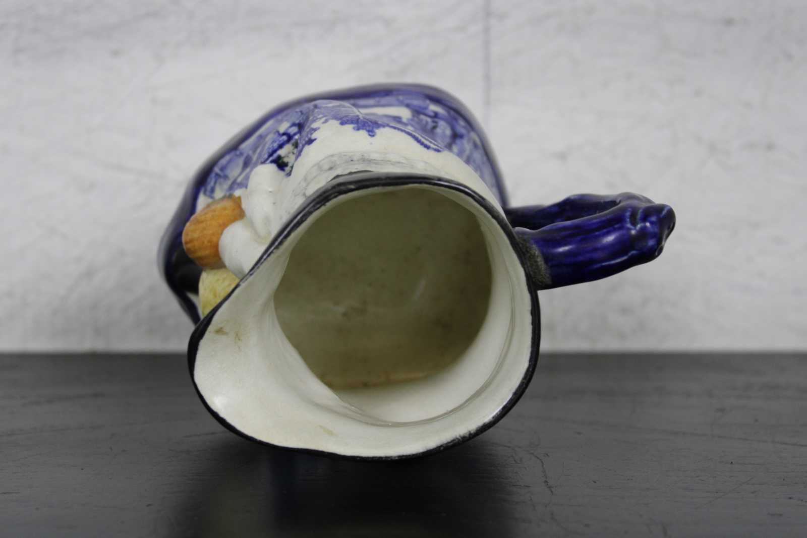 Antique turn of the century Old Staffordshire rare pottery toby jug in the shape of a colonial Englishman holding a cup and pitcher, and decorated with a chinoiserie blue willow pattern around the sides.