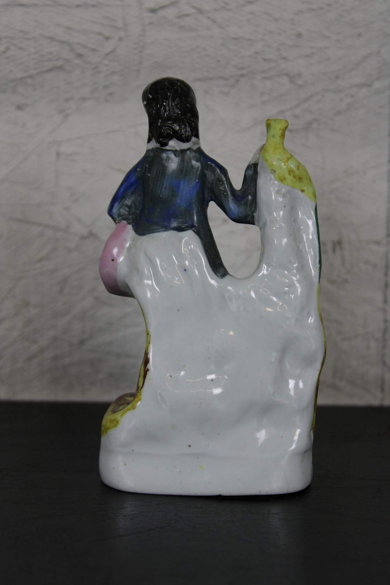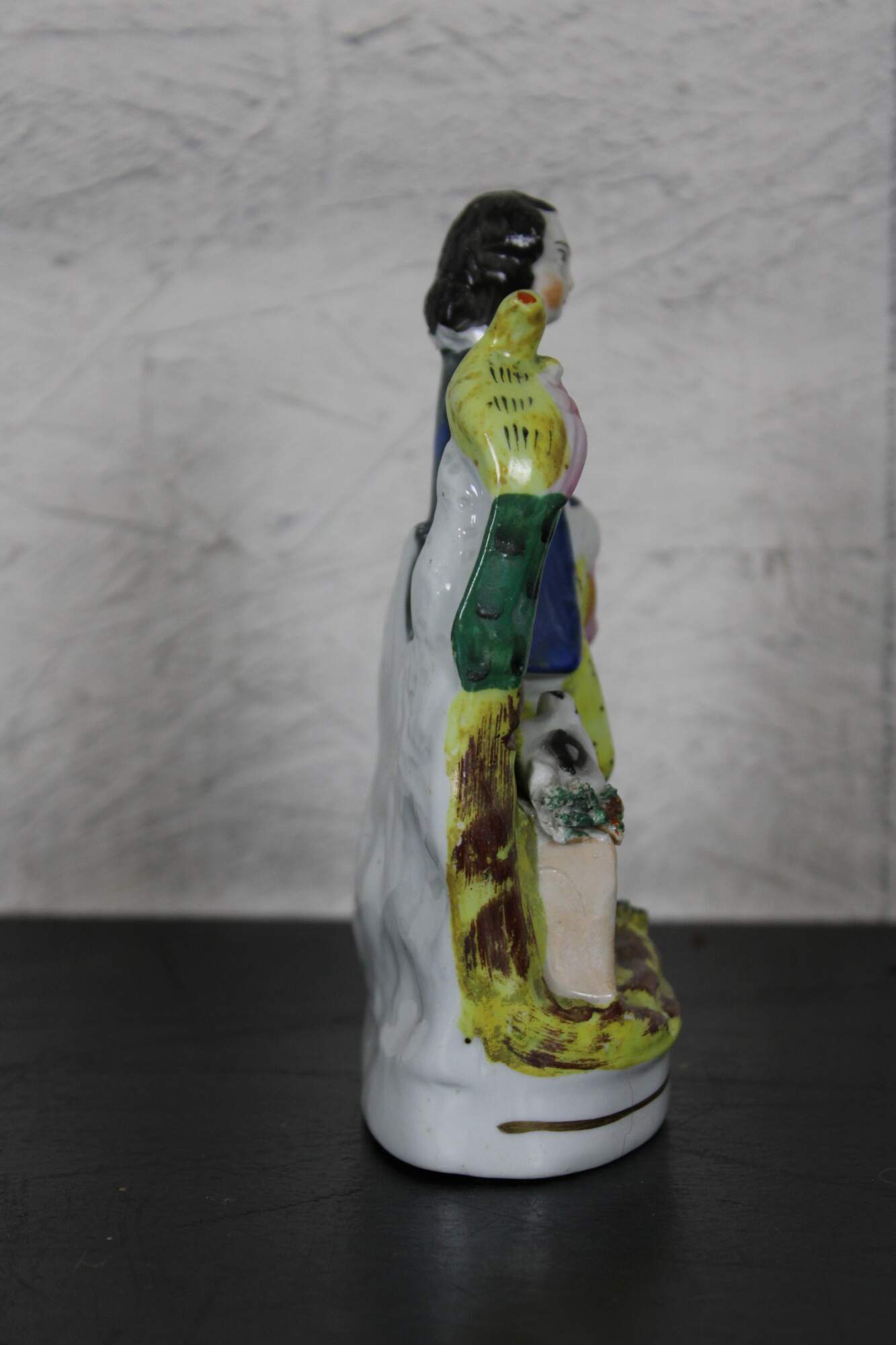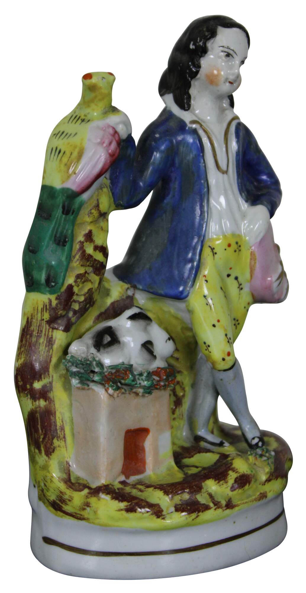 Antique 19th century Staffordshire porcelain figure in the shape of a boy standing next to a rabbit hutch and grasping a pheasant.