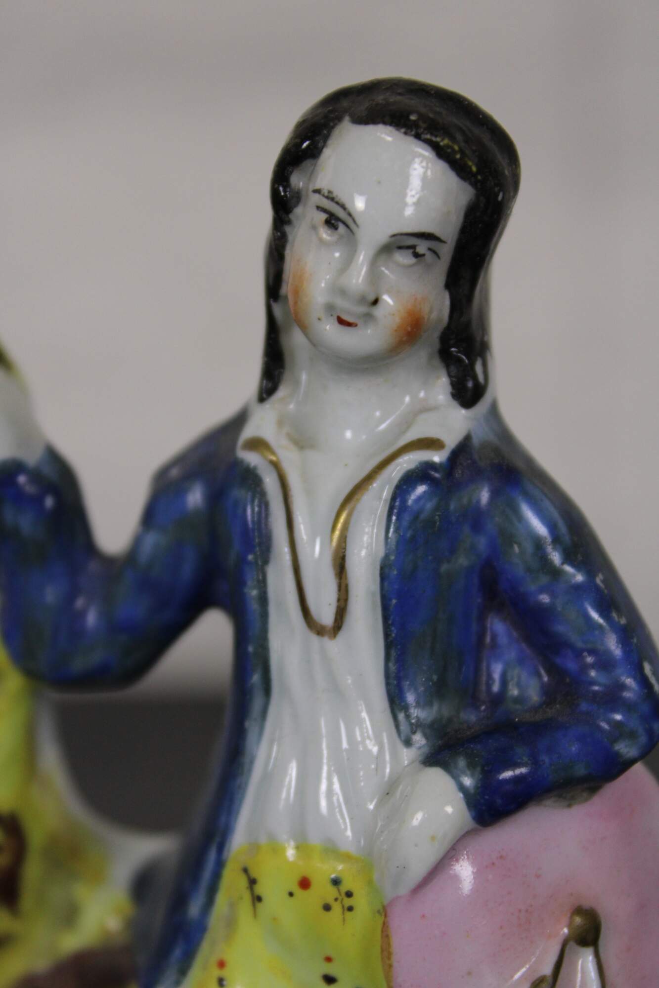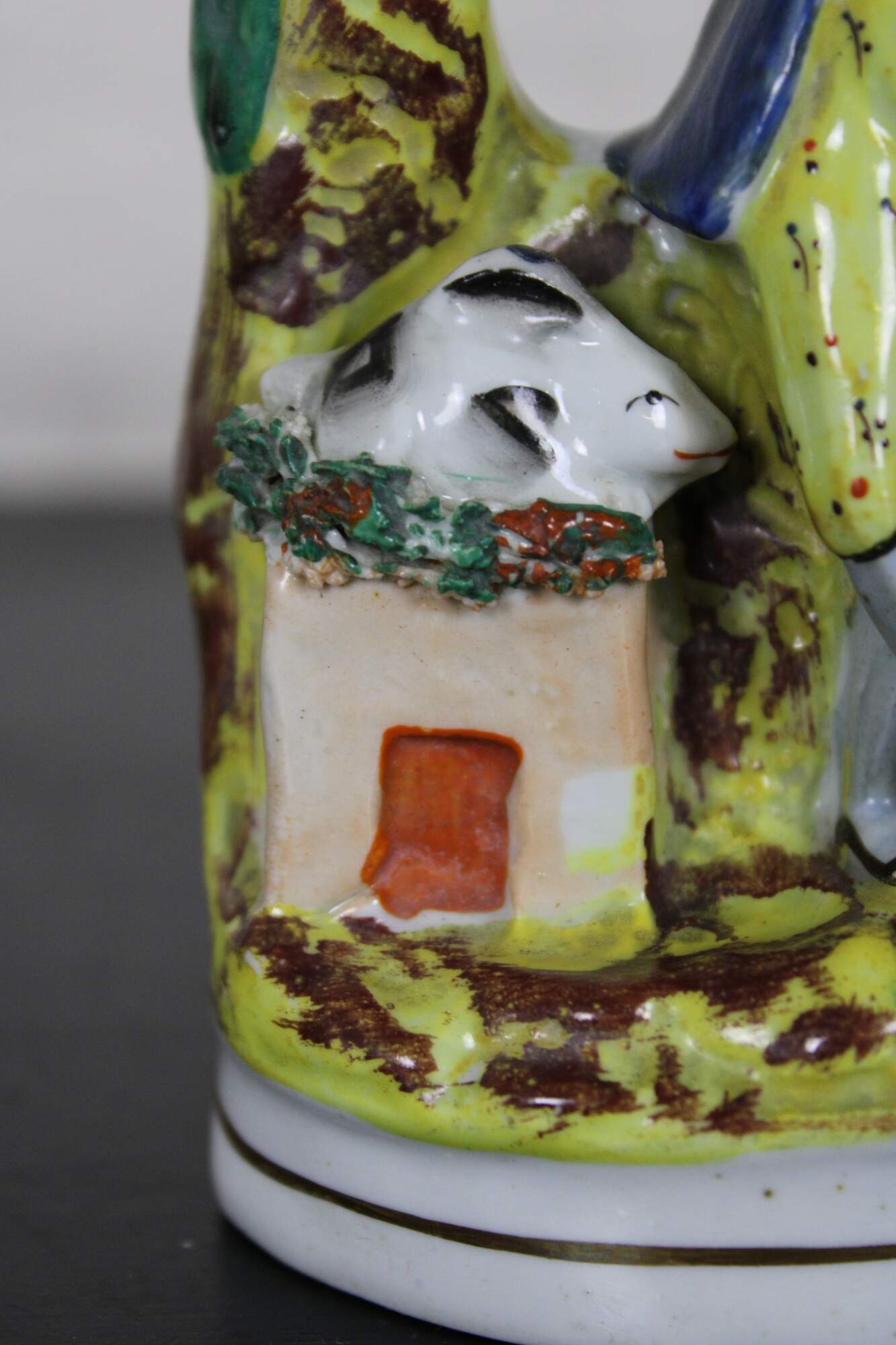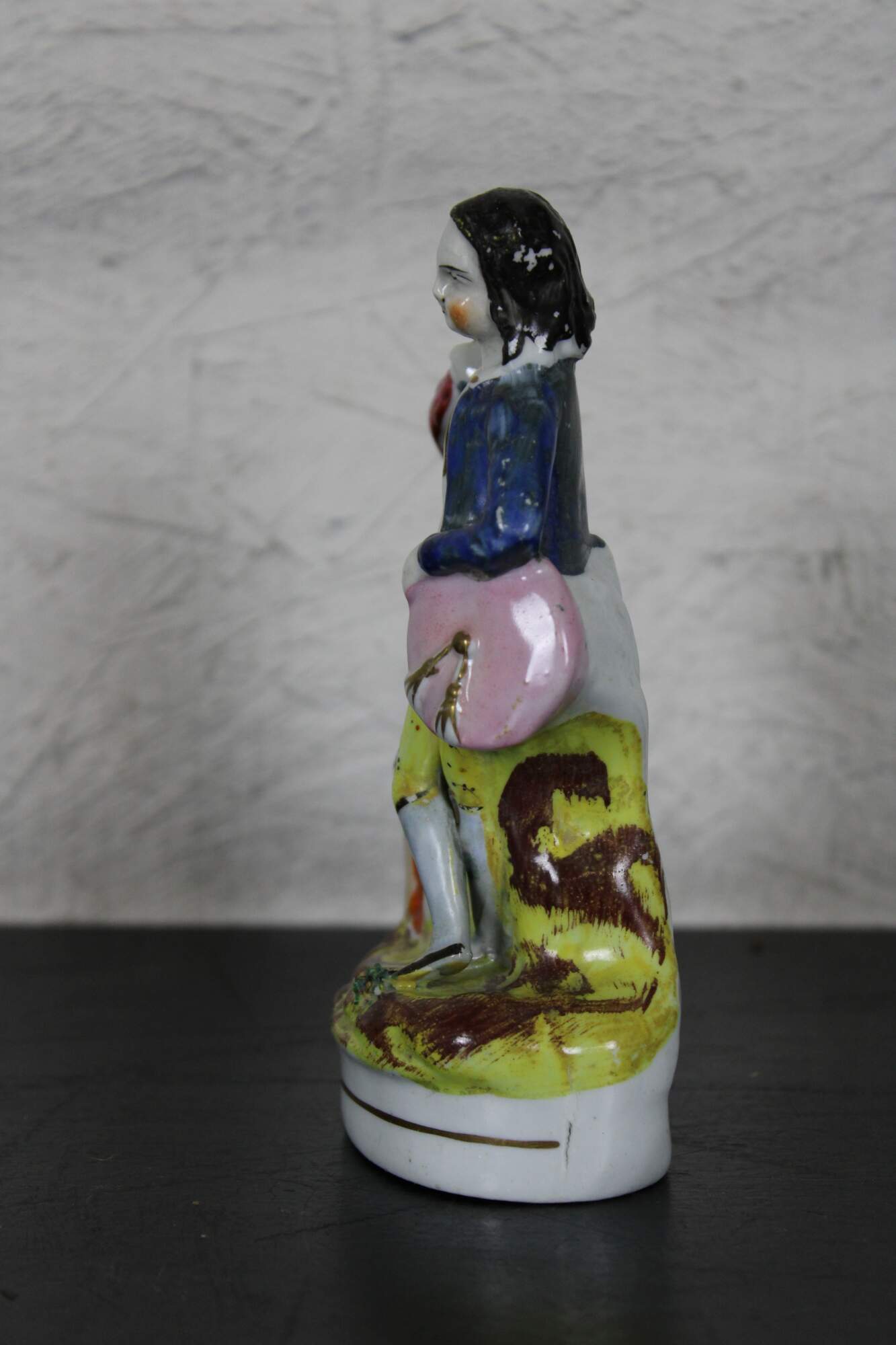 Antique 19th century Staffordshire porcelain figure in the shape of a boy standing next to a rabbit hutch and grasping a pheasant.