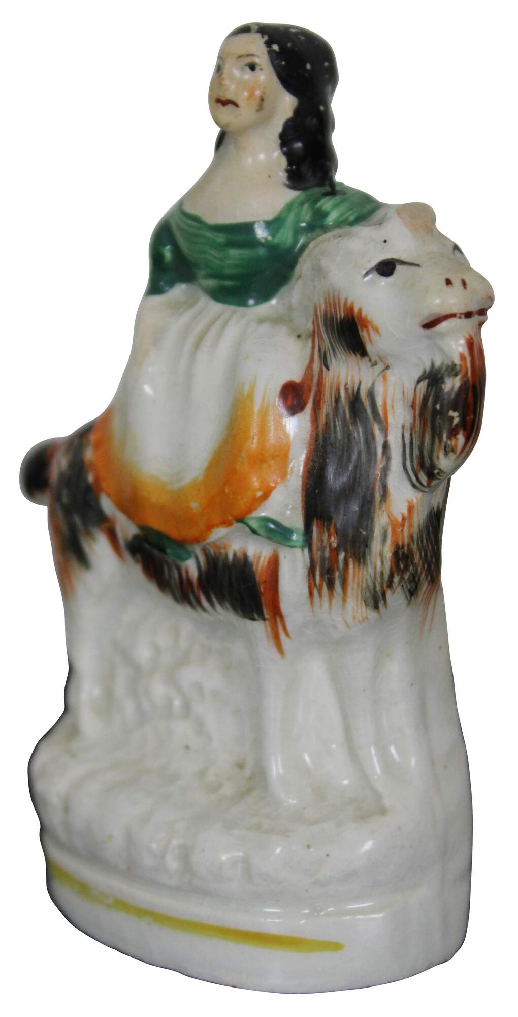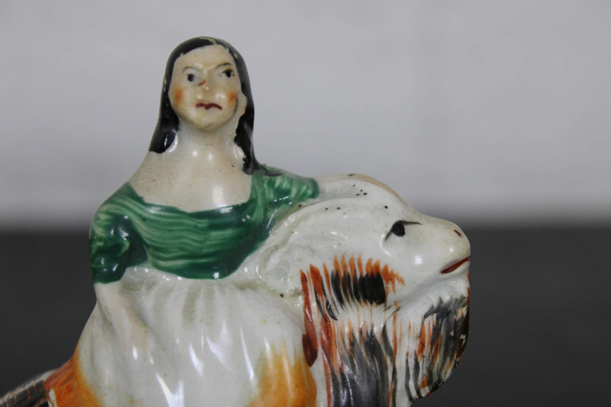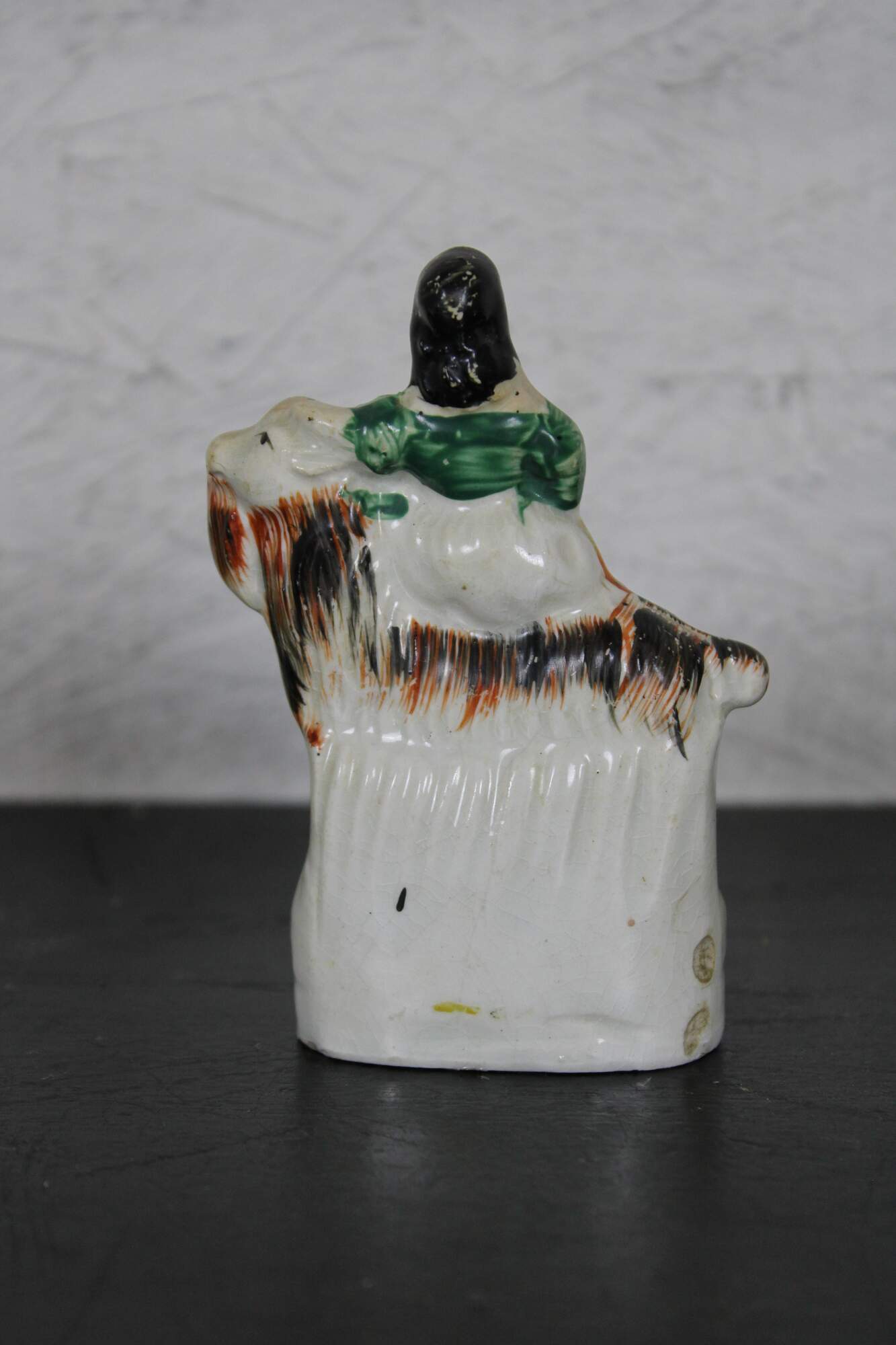 Antique Staffordshire porcelain figurine of a girl riding a goat.