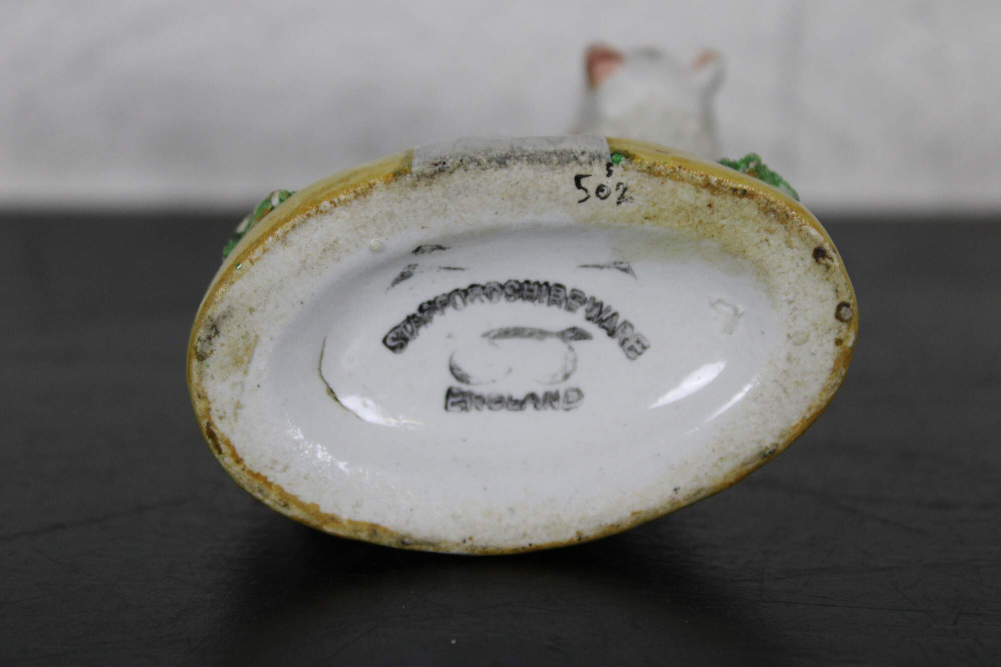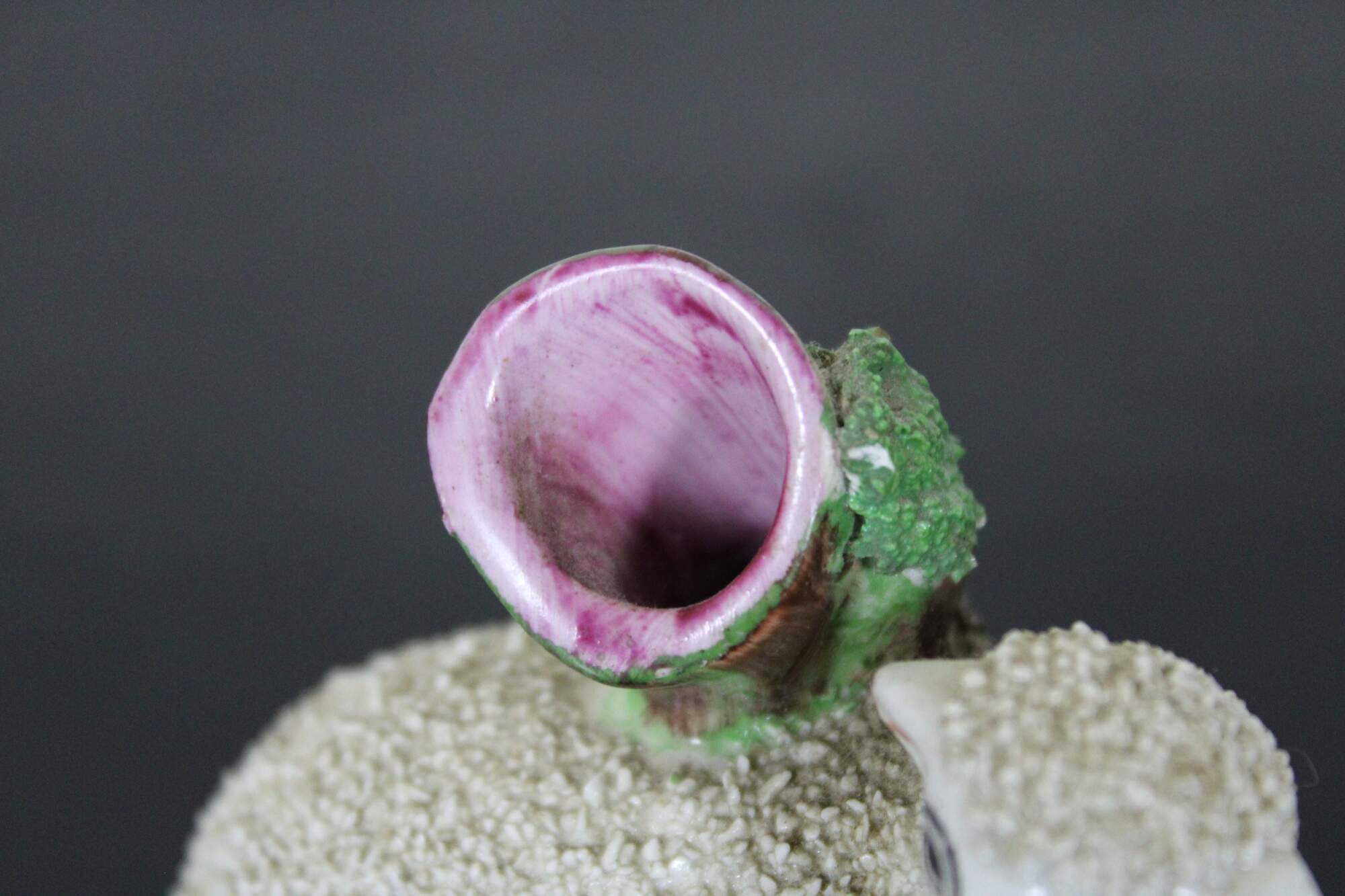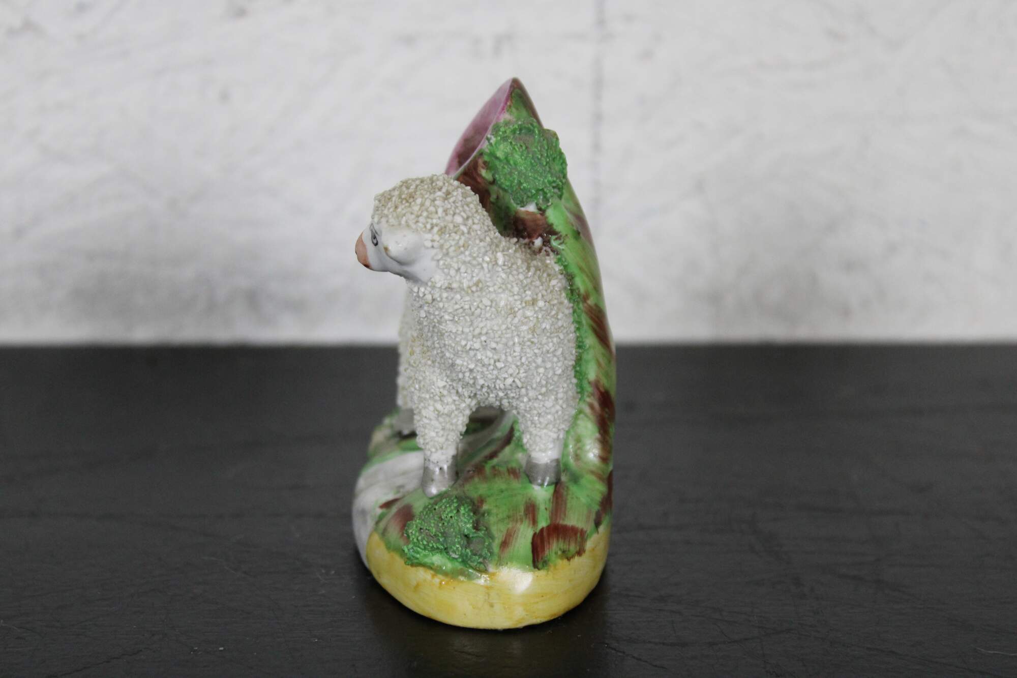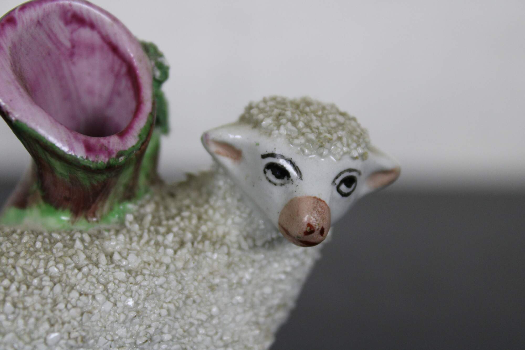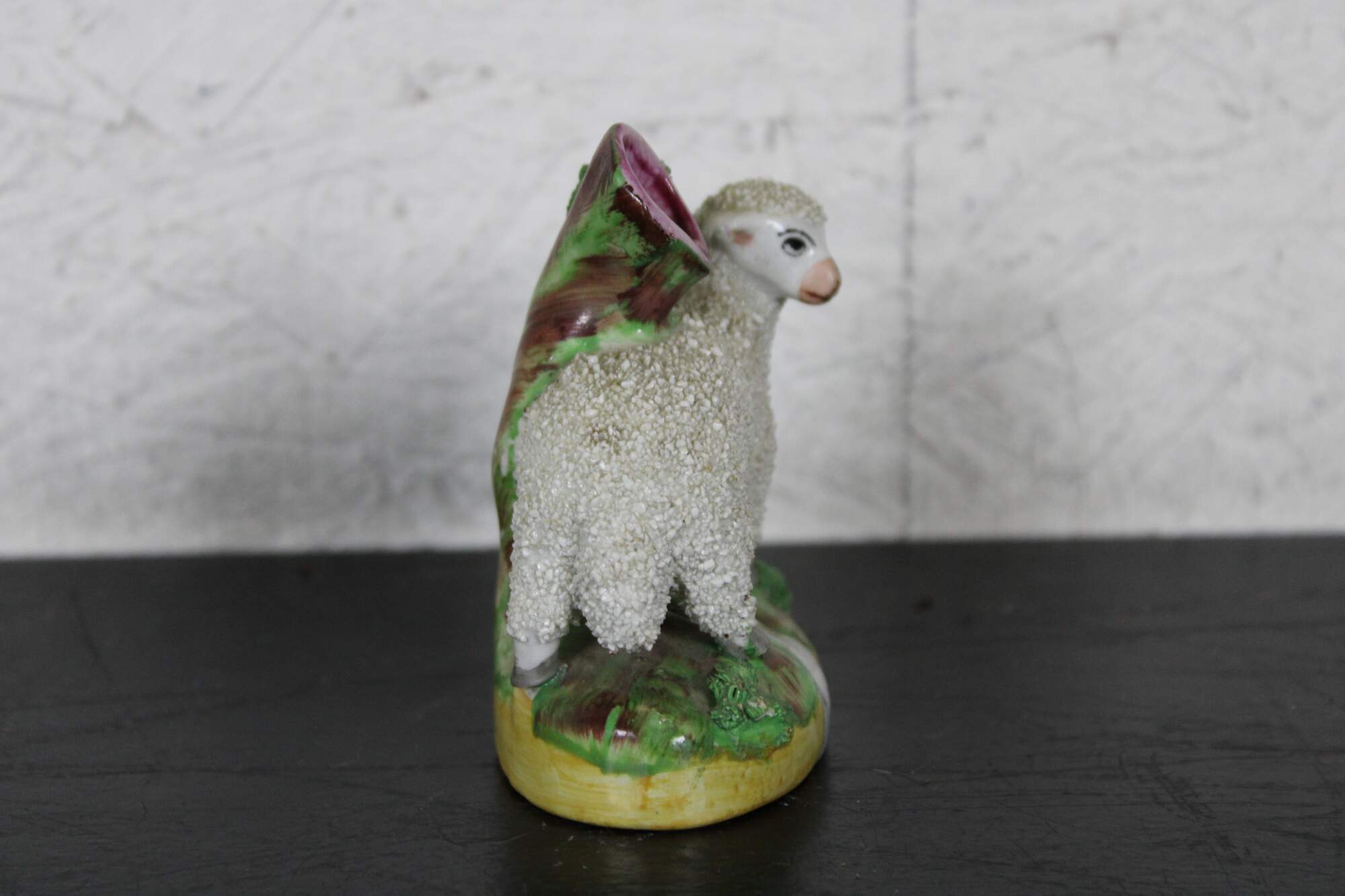 Small antique Victorian Staffordshireware spill or bud vase featuring a confetti porcelain lamb or sheep.
