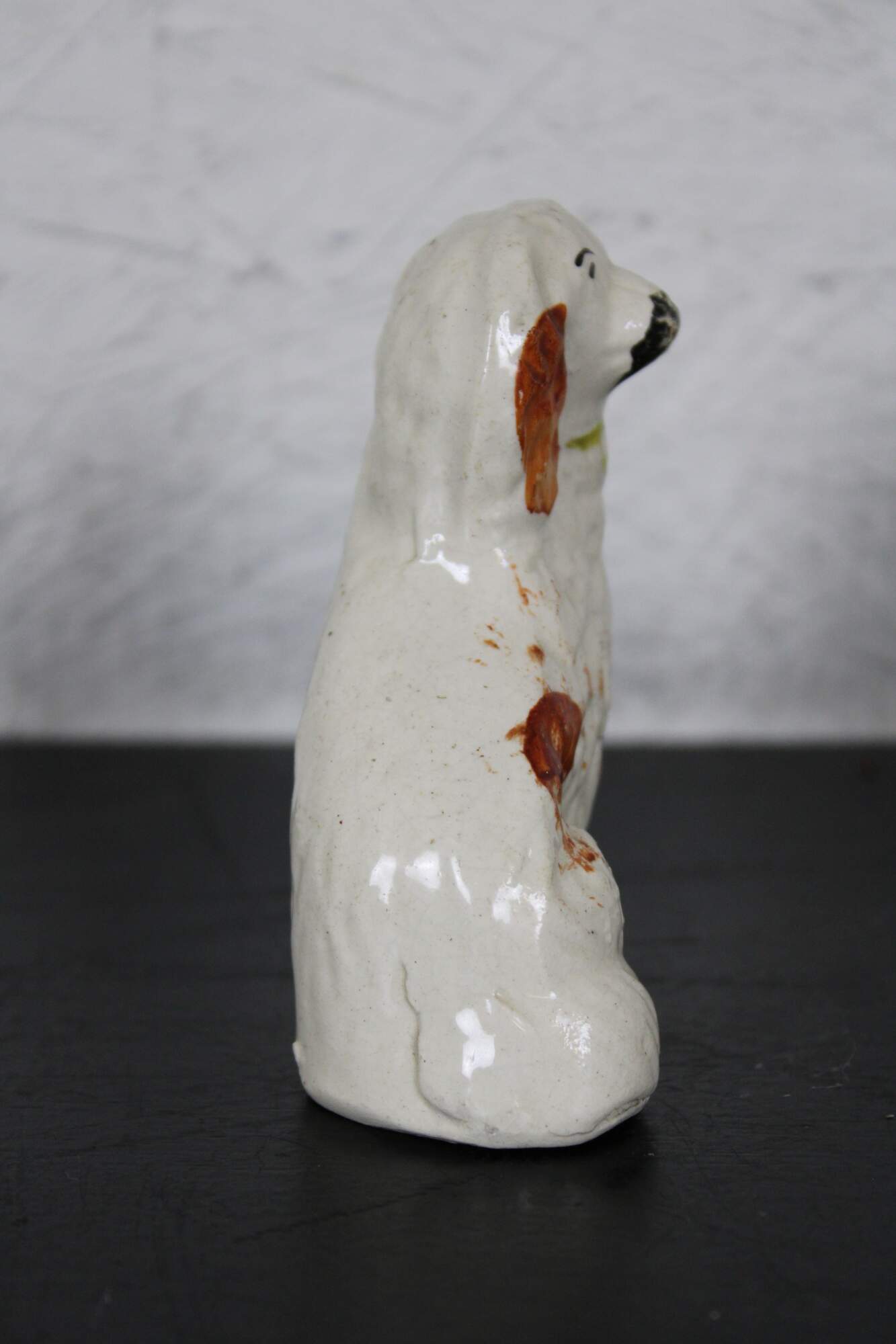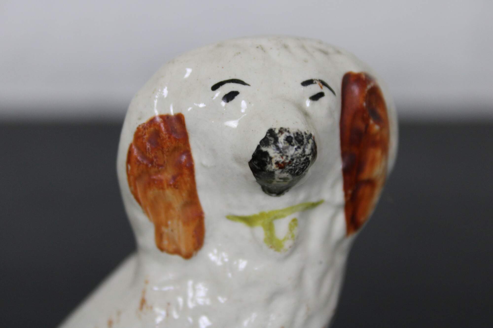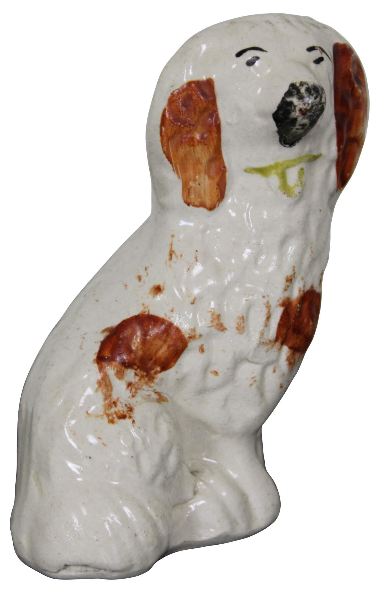 Antique miniature Staffordshire porcelain figurine in the shape of a red and white King Charles spaniel with gold collar.